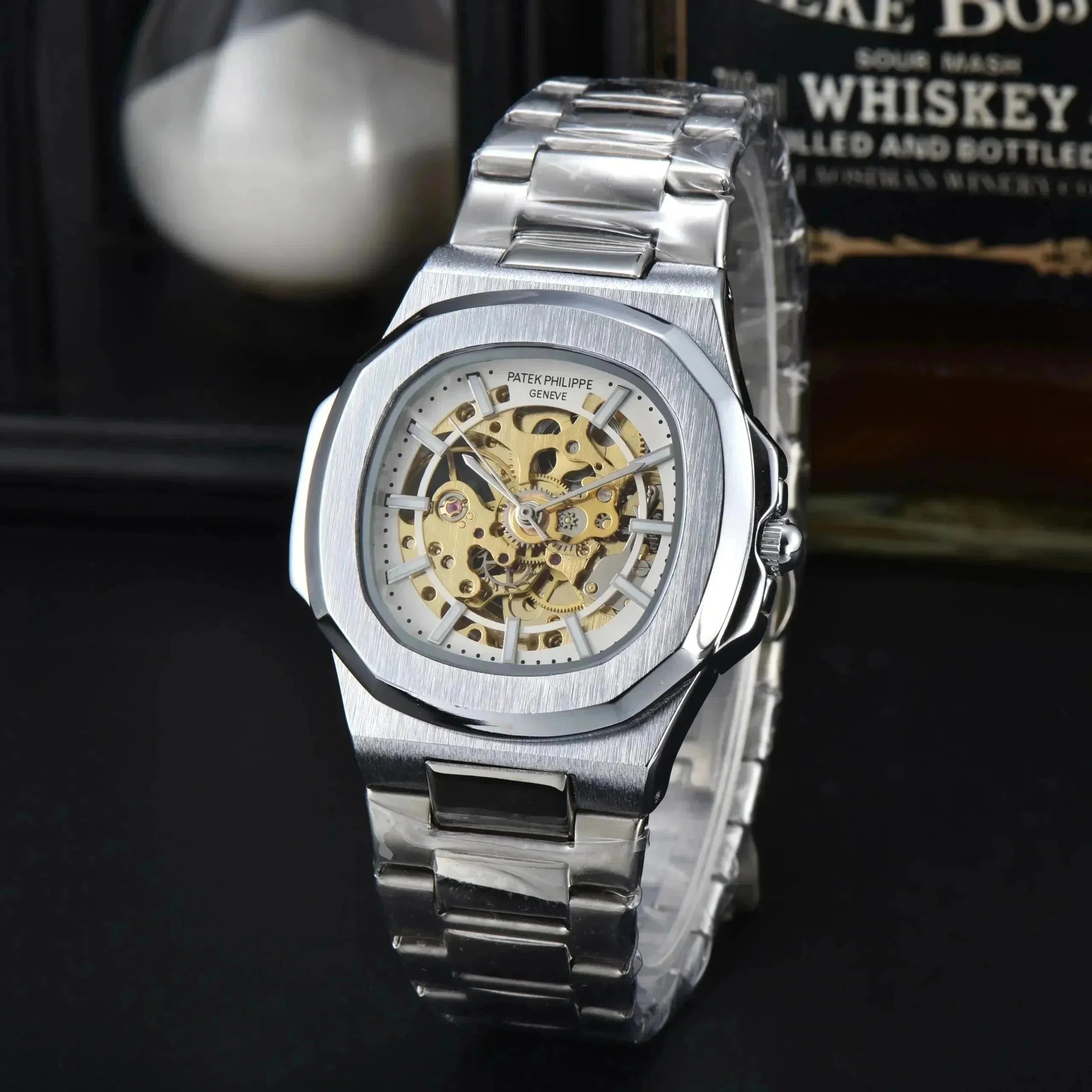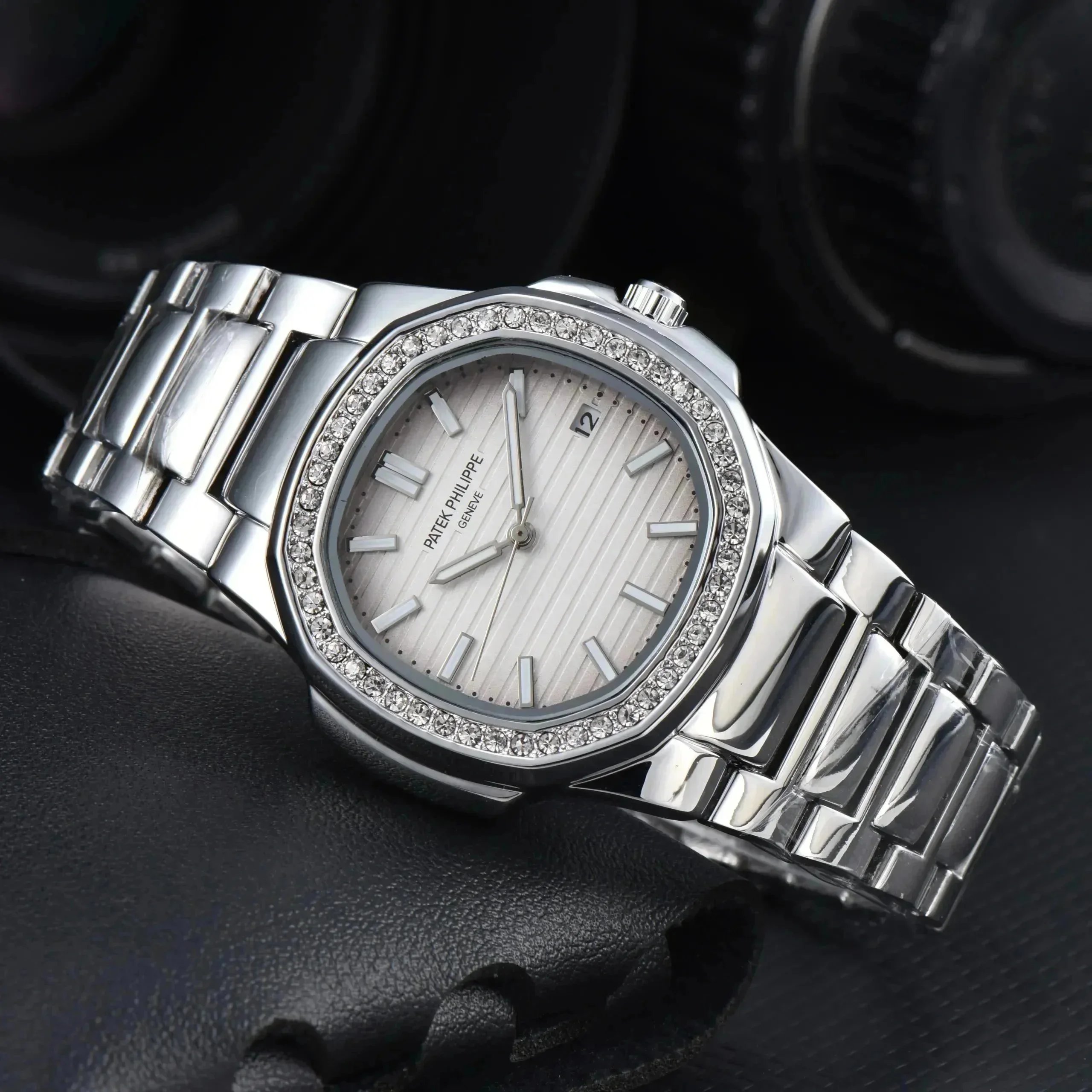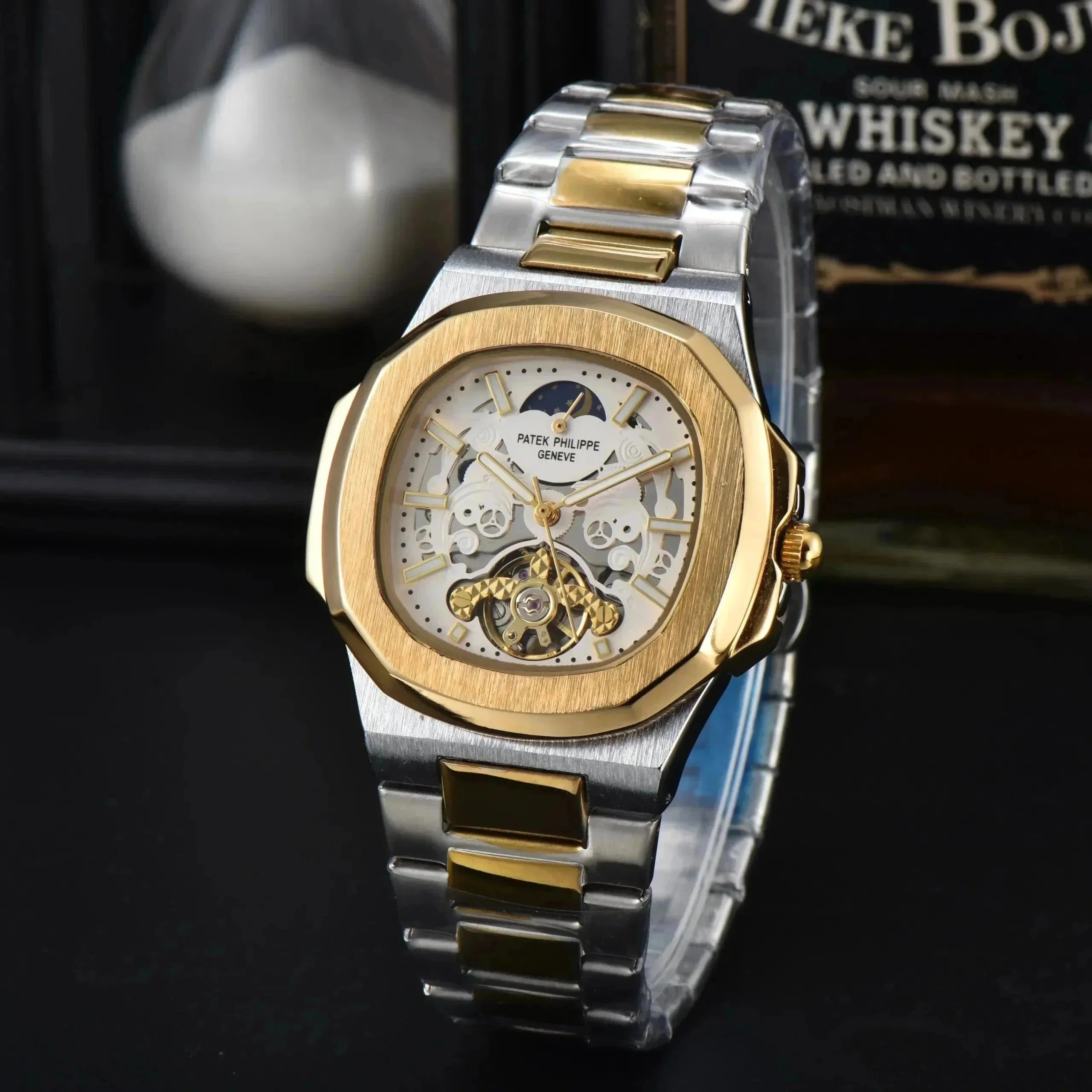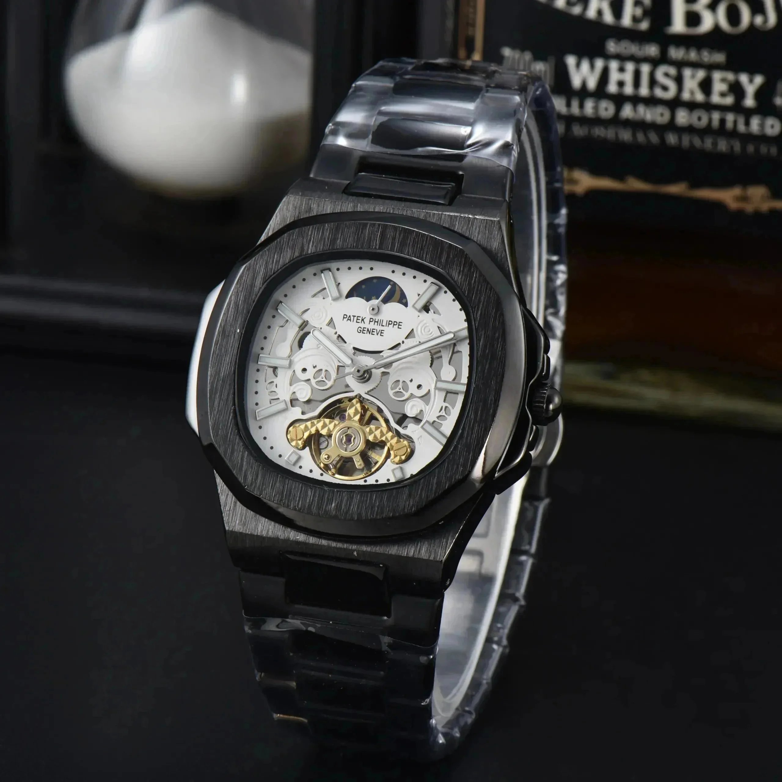 High-end replica watches inspired by Patek Philippe, featuring diamond-set bezels, skeleton dials, and octagonal cases in various colorways and finishes for a premium look.