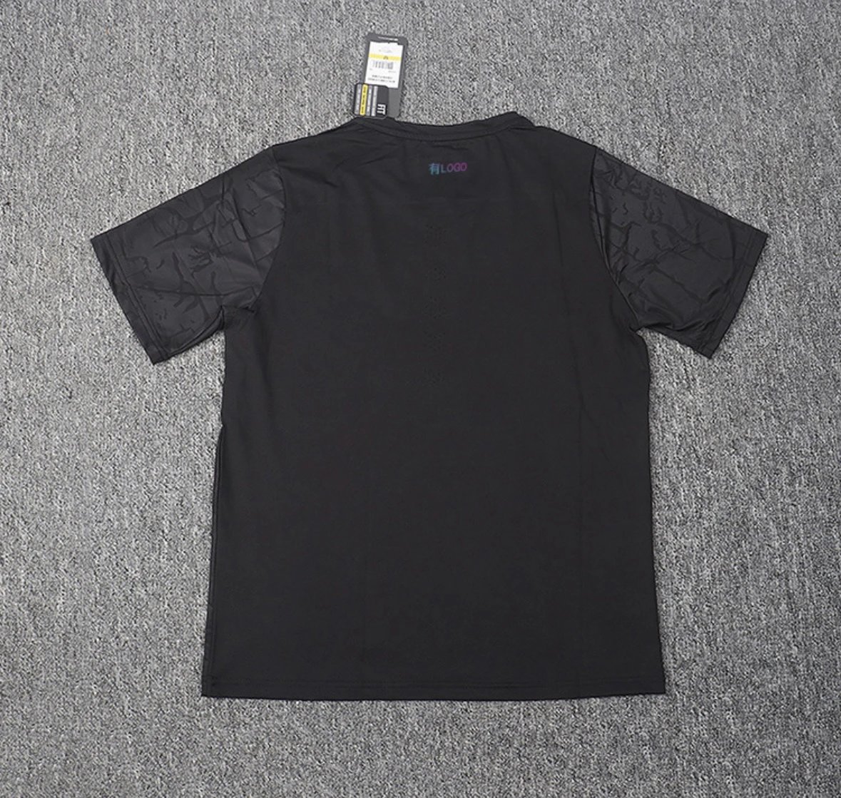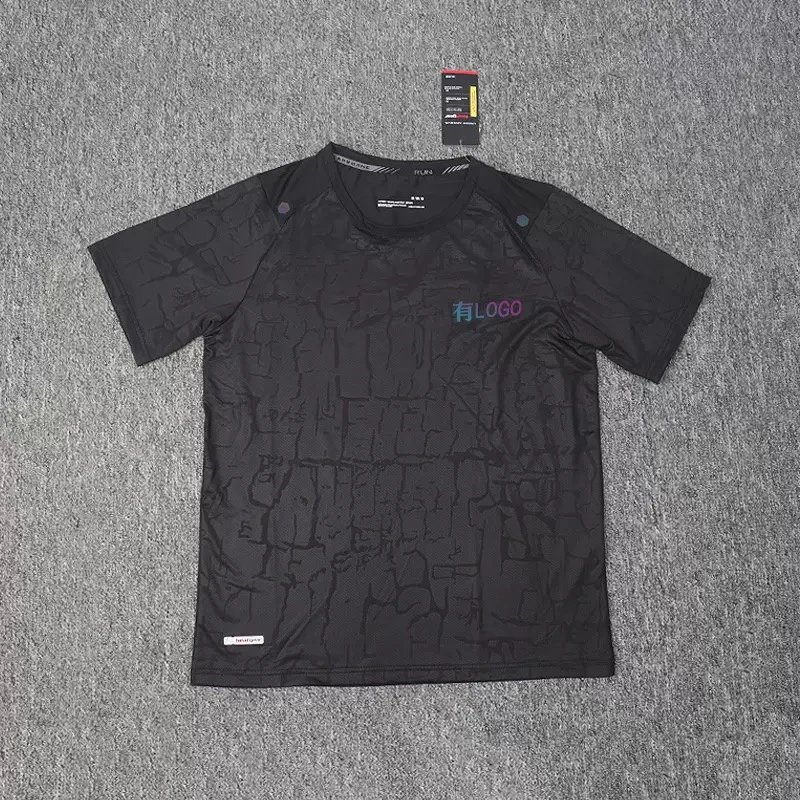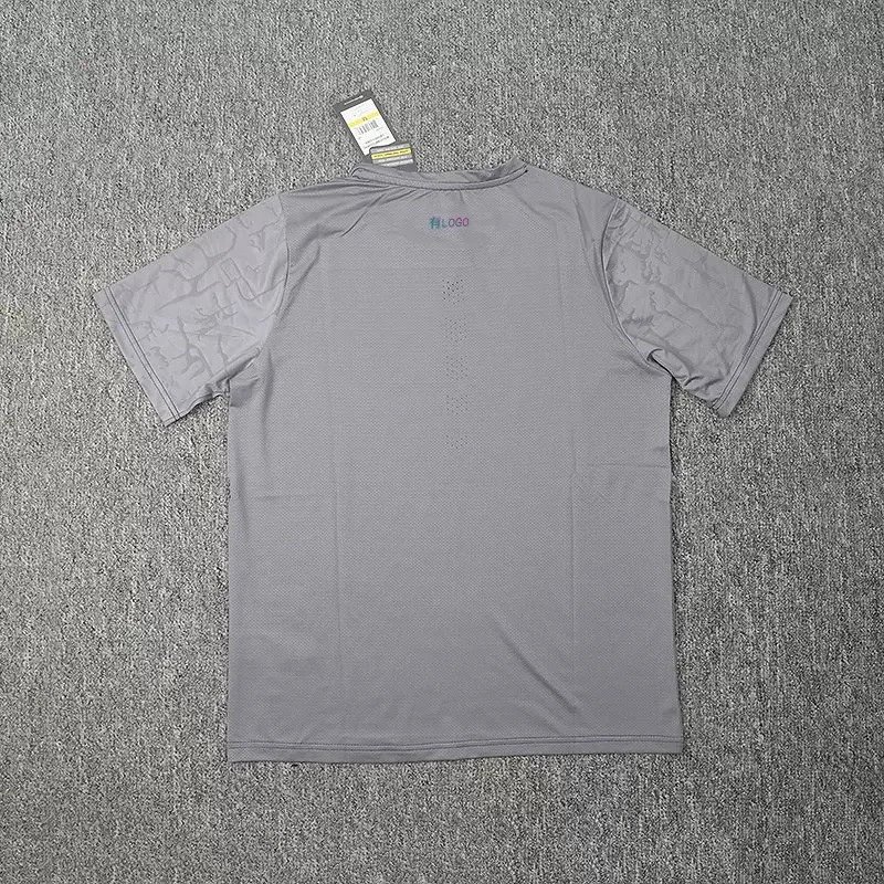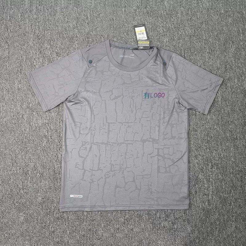 A dark gray performance t-shirt featuring a subtle cracked texture pattern and moisture-wicking fabric, ideal for workouts or active lifestyles. Designed for comfort and breathability.