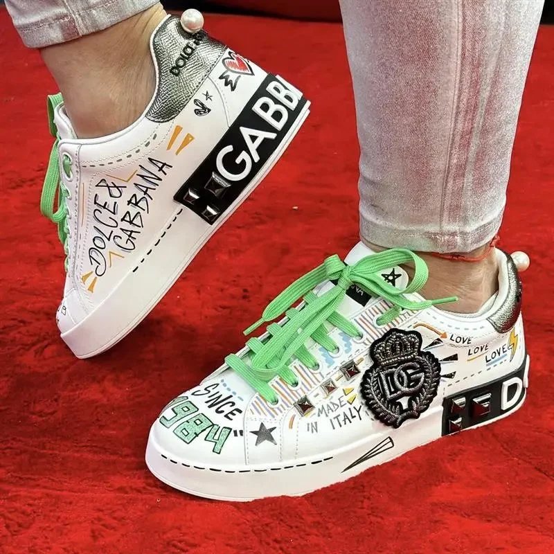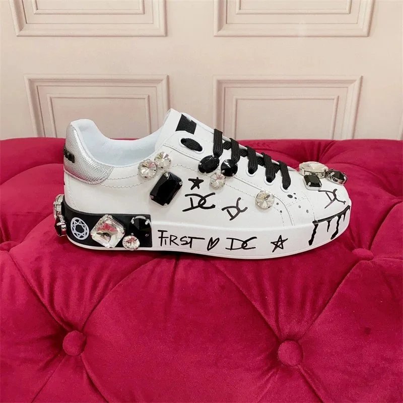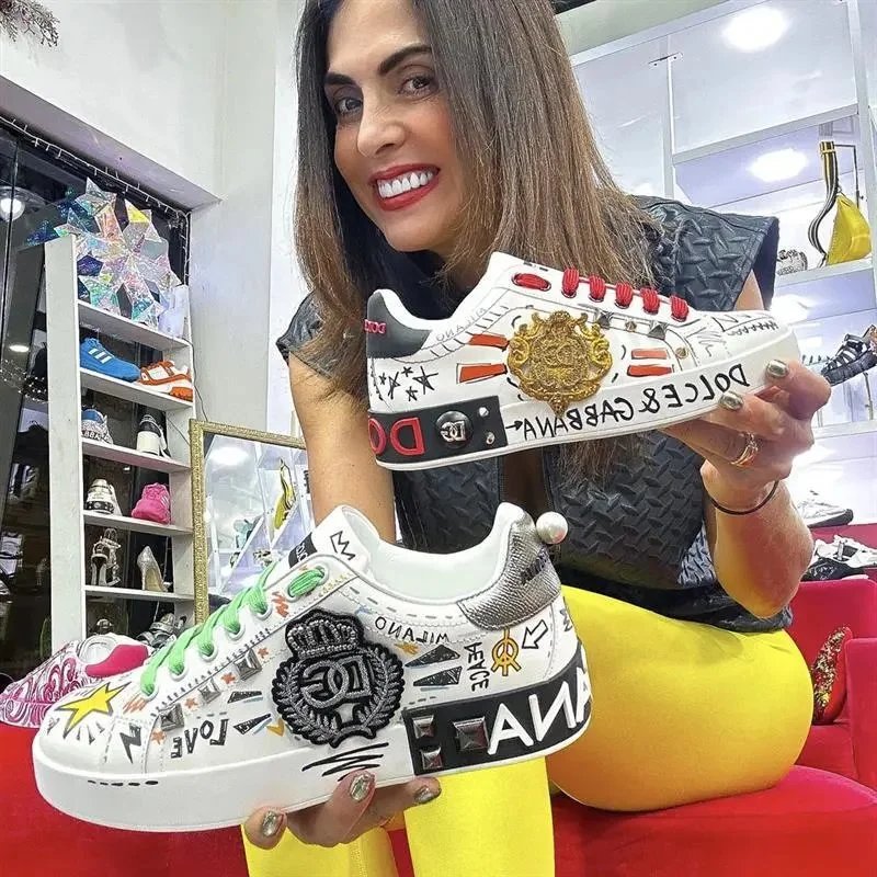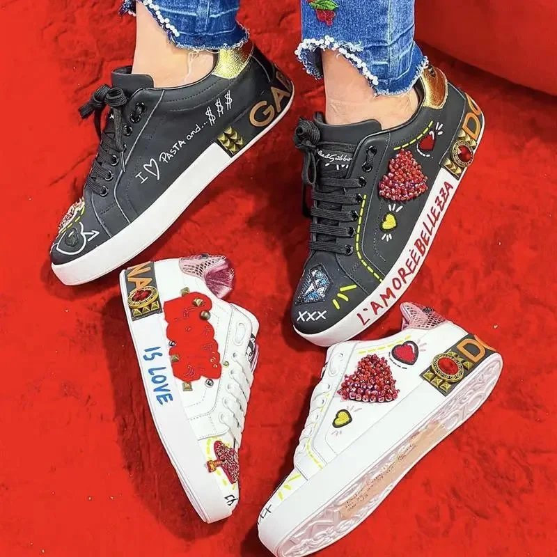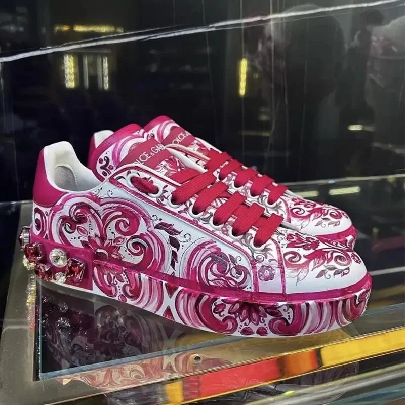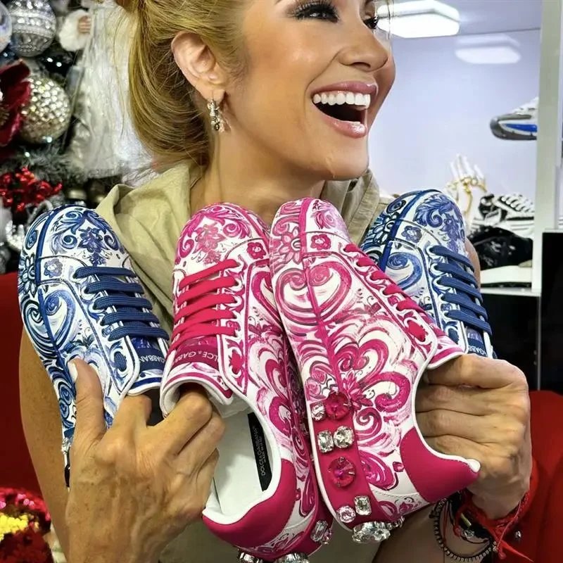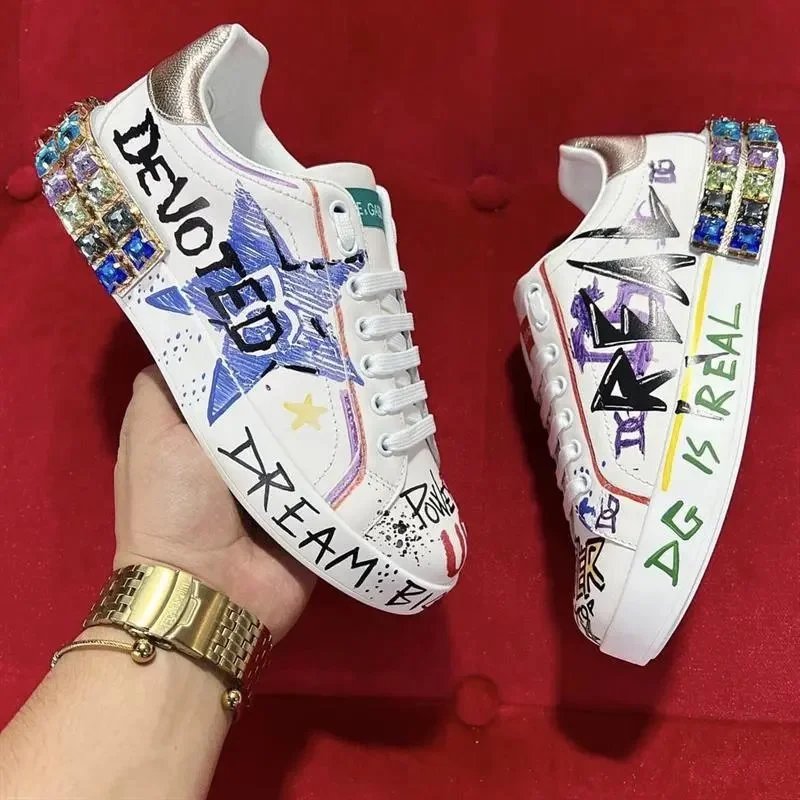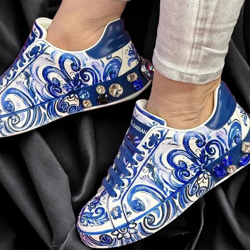 Show-stopping pink and blue patterned sneakers adorned with sparkling rhinestones for a bold, glamorous look.