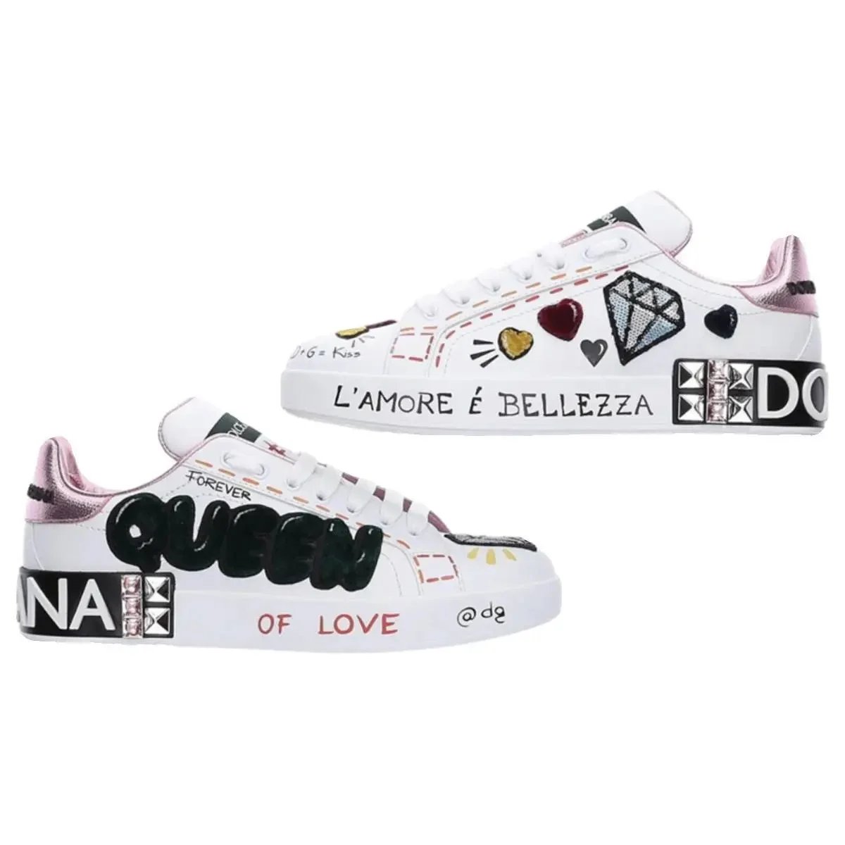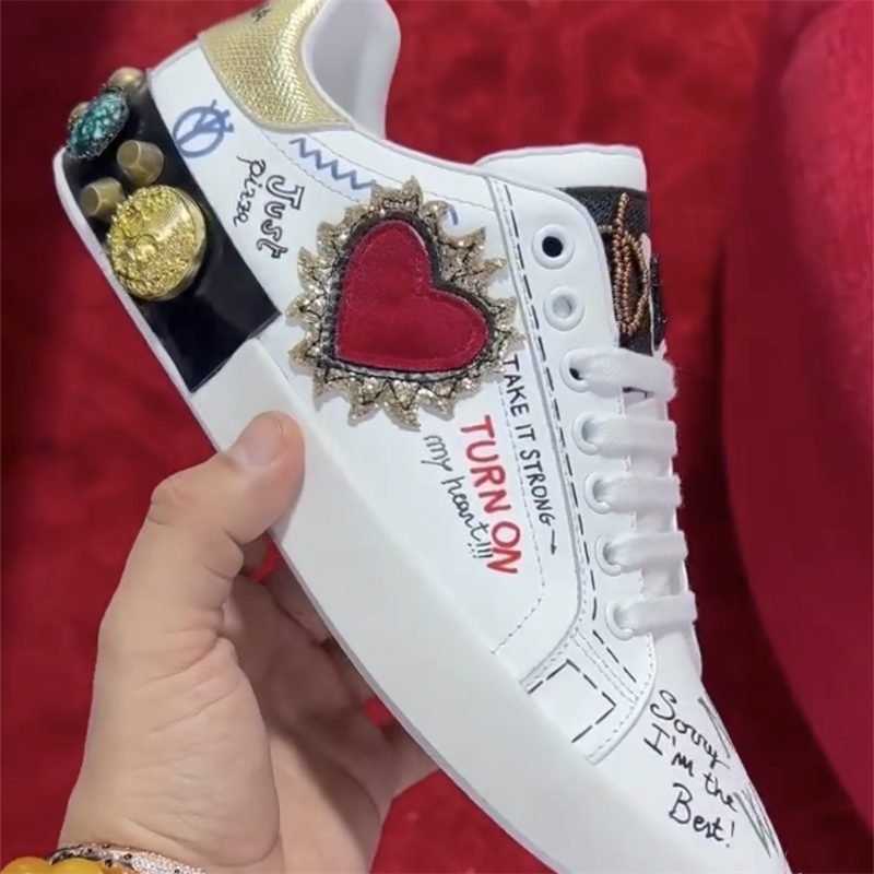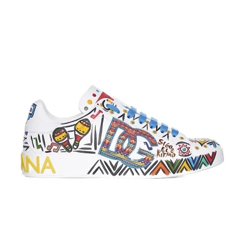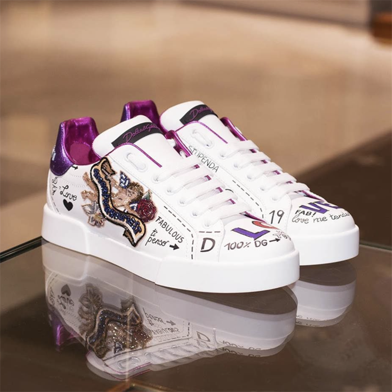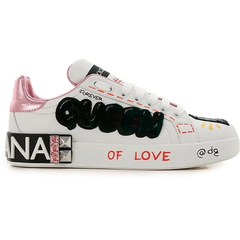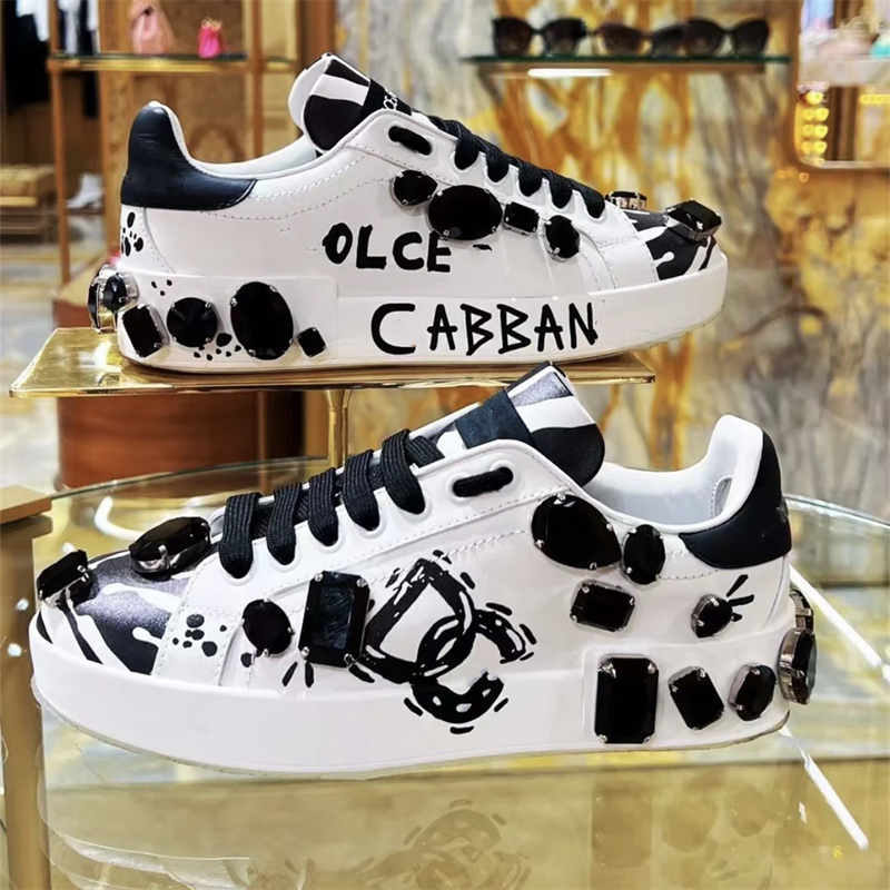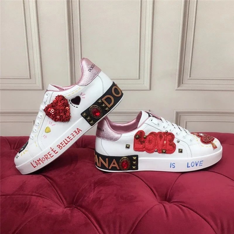 Show-stopping pink and blue patterned sneakers adorned with sparkling rhinestones for a bold, glamorous look.
