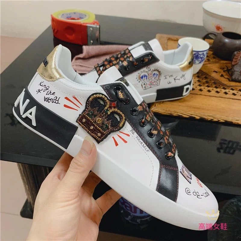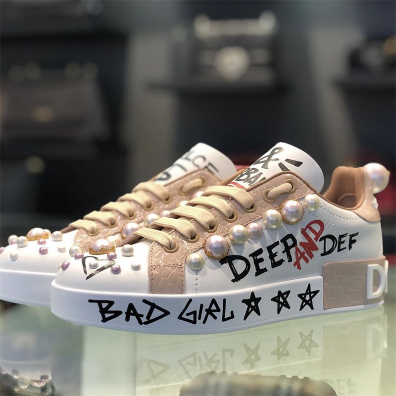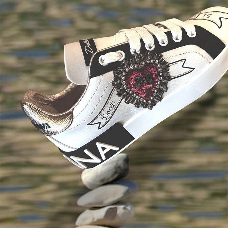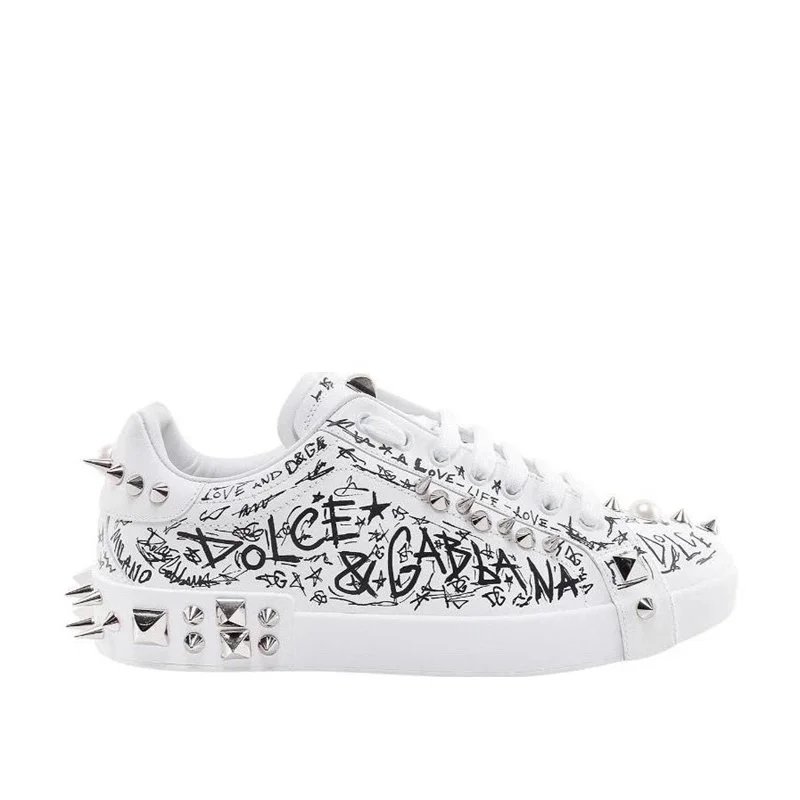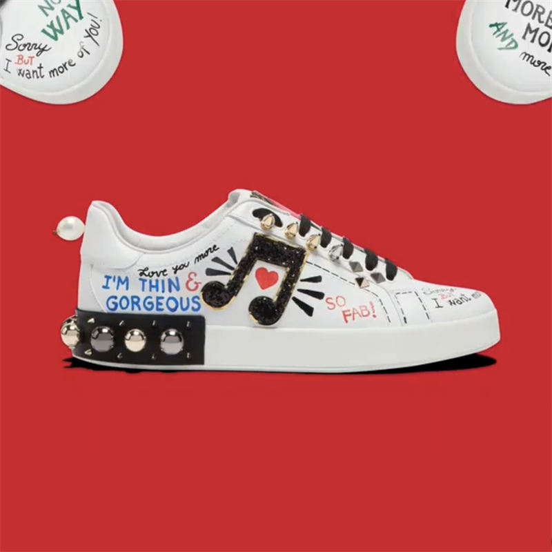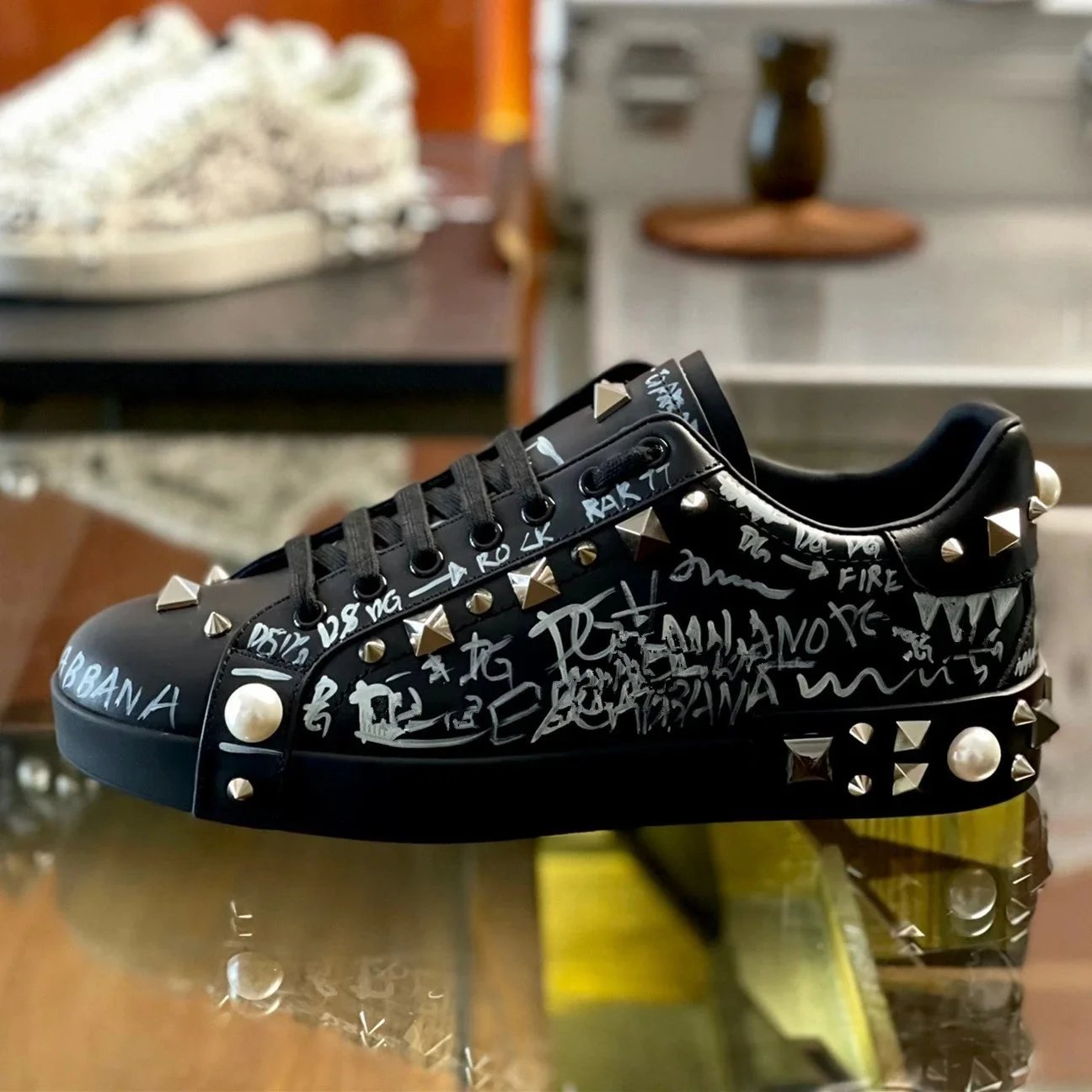 Show-stopping pink and blue patterned sneakers adorned with sparkling rhinestones for a bold, glamorous look.