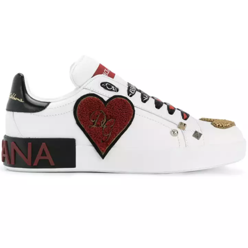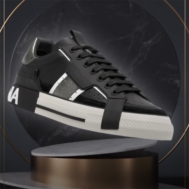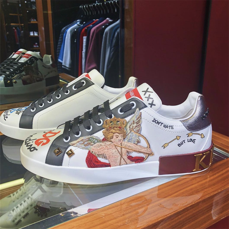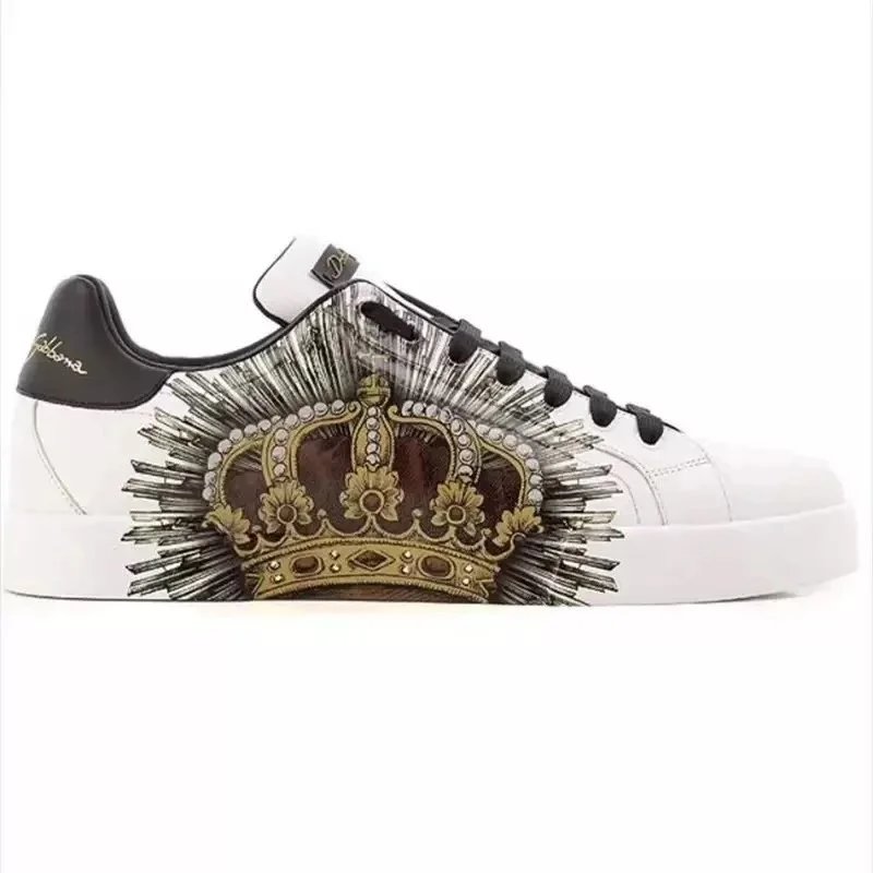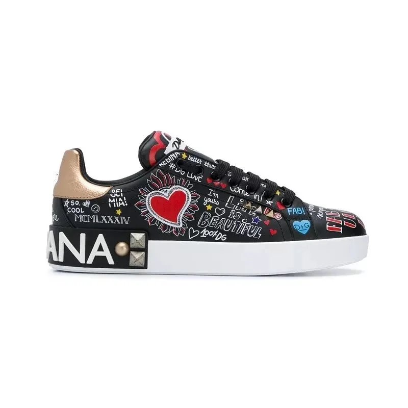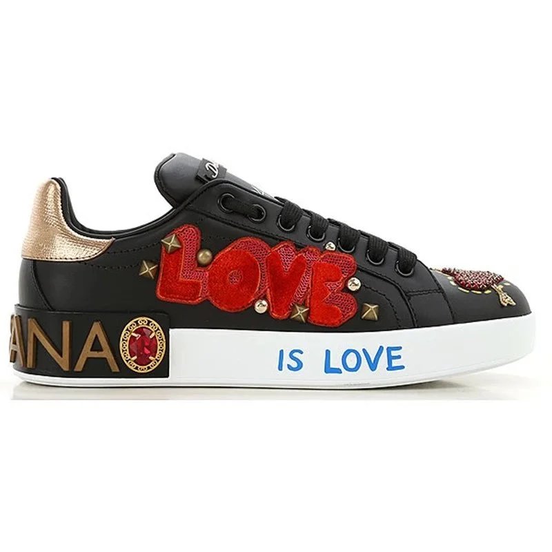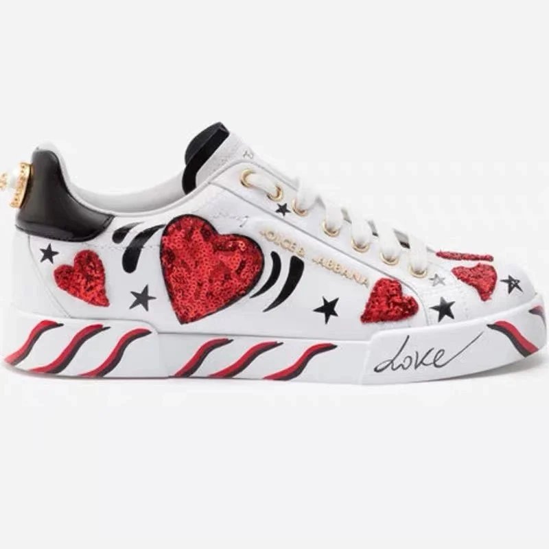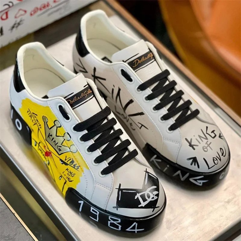 Show-stopping pink and blue patterned sneakers adorned with sparkling rhinestones for a bold, glamorous look.