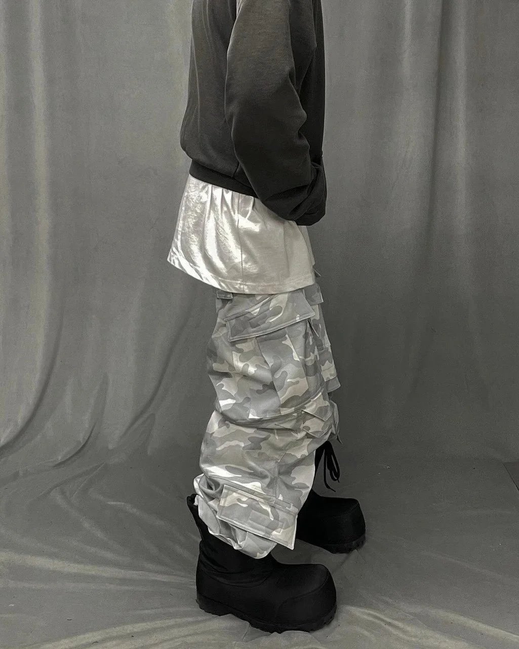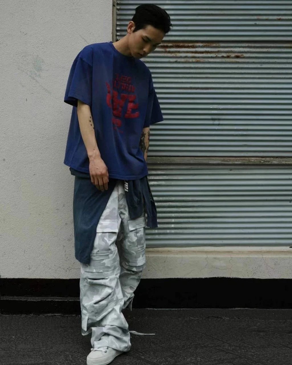 Stylish men's outfit featuring a bold red and yellow plaid shirt paired with green camouflage cargo pants for a standout urban look.