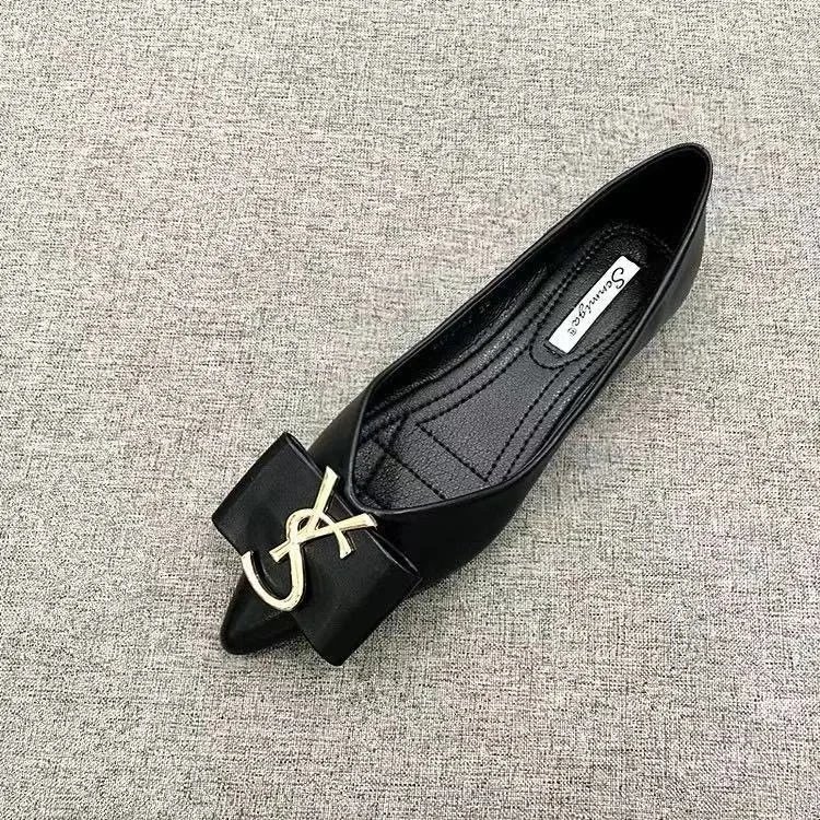 Stylish pointed-toe flats featuring a gold-tone logo buckle for a chic, versatile look perfect for work or casual outings.