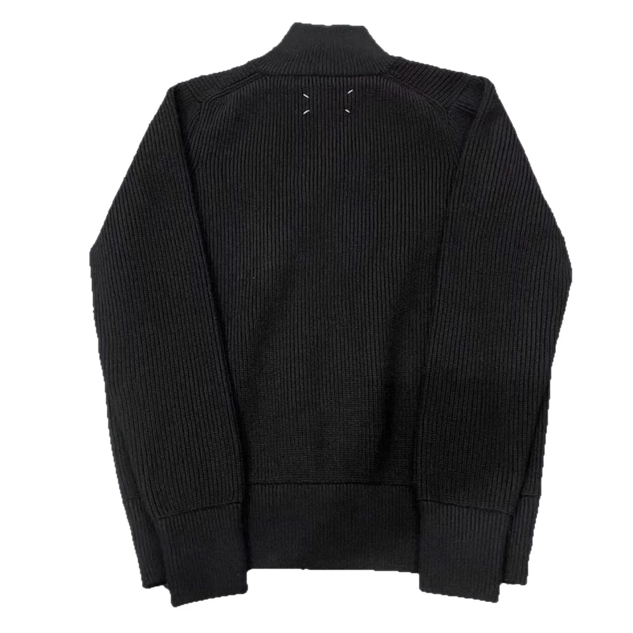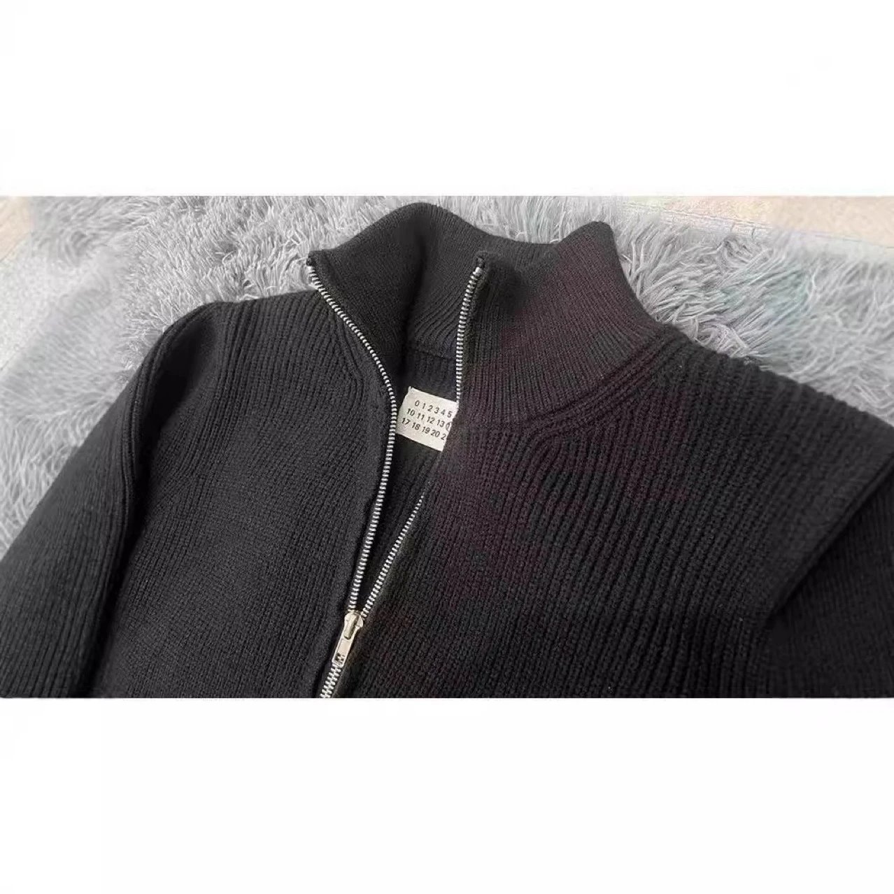 Stylish black ribbed knit zip-up sweater jacket with a sleek stand collar and full-length zipper. Perfect for layering or wearing alone in cooler weather.