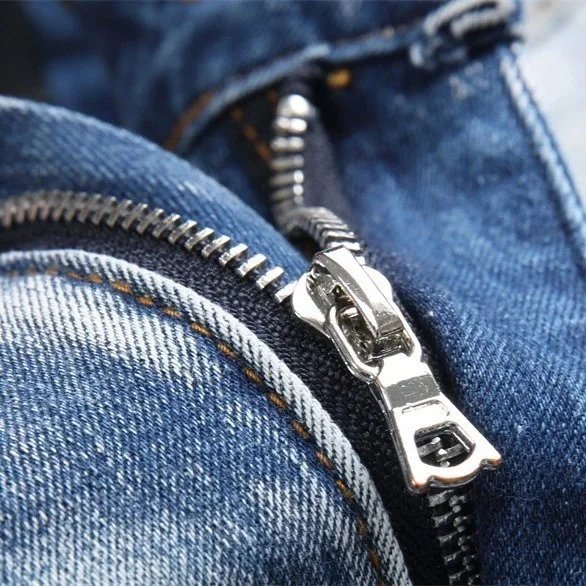 Stylish ripped denim jeans featuring bold red embroidery and multiple distressed patches. Perfect for a rugged, urban look with a vintage wash finish.