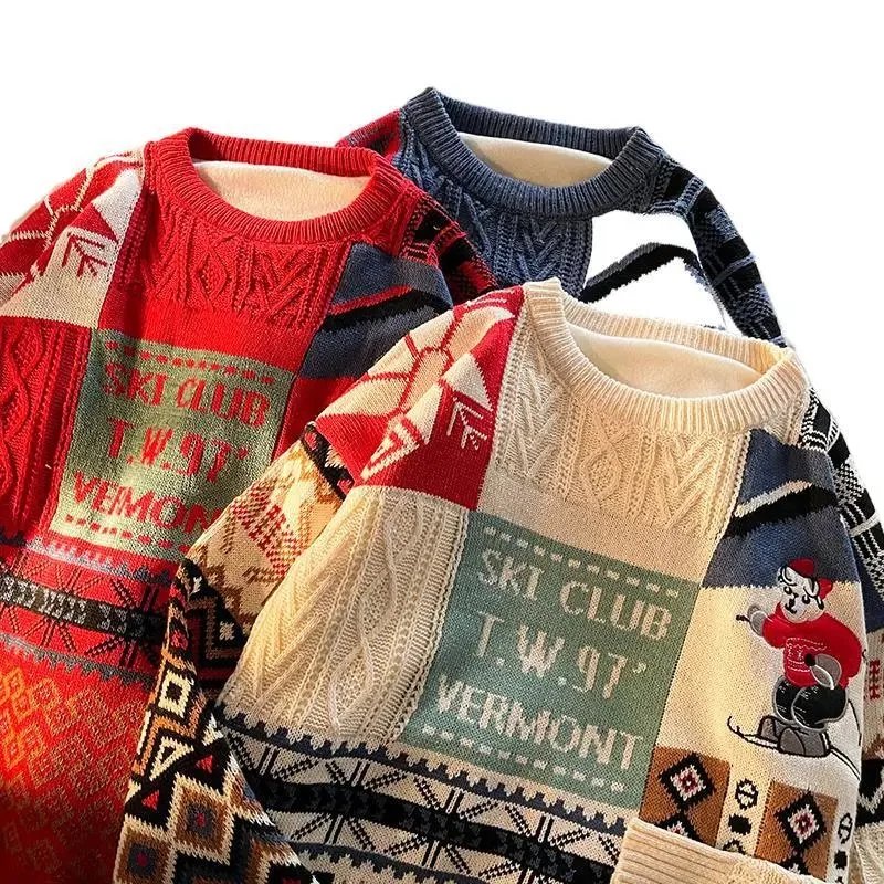 Cozy red patchwork sweater featuring vintage 'Ski Club T.W.97 Vermont' graphic and playful skier motif — perfect for winter holidays or retro ski lodge vibes.