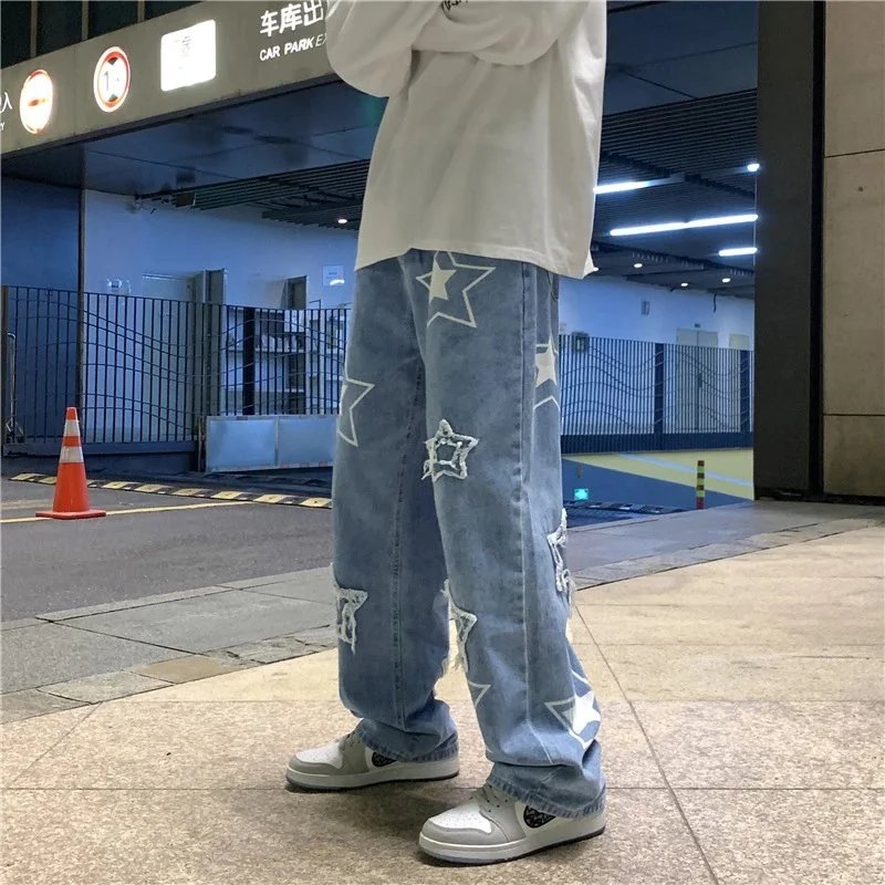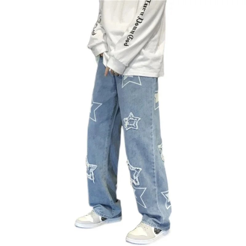Bold black denim pants featuring distressed star patches and ripped details for a standout streetwear look. Perfect for edgy urban styles.