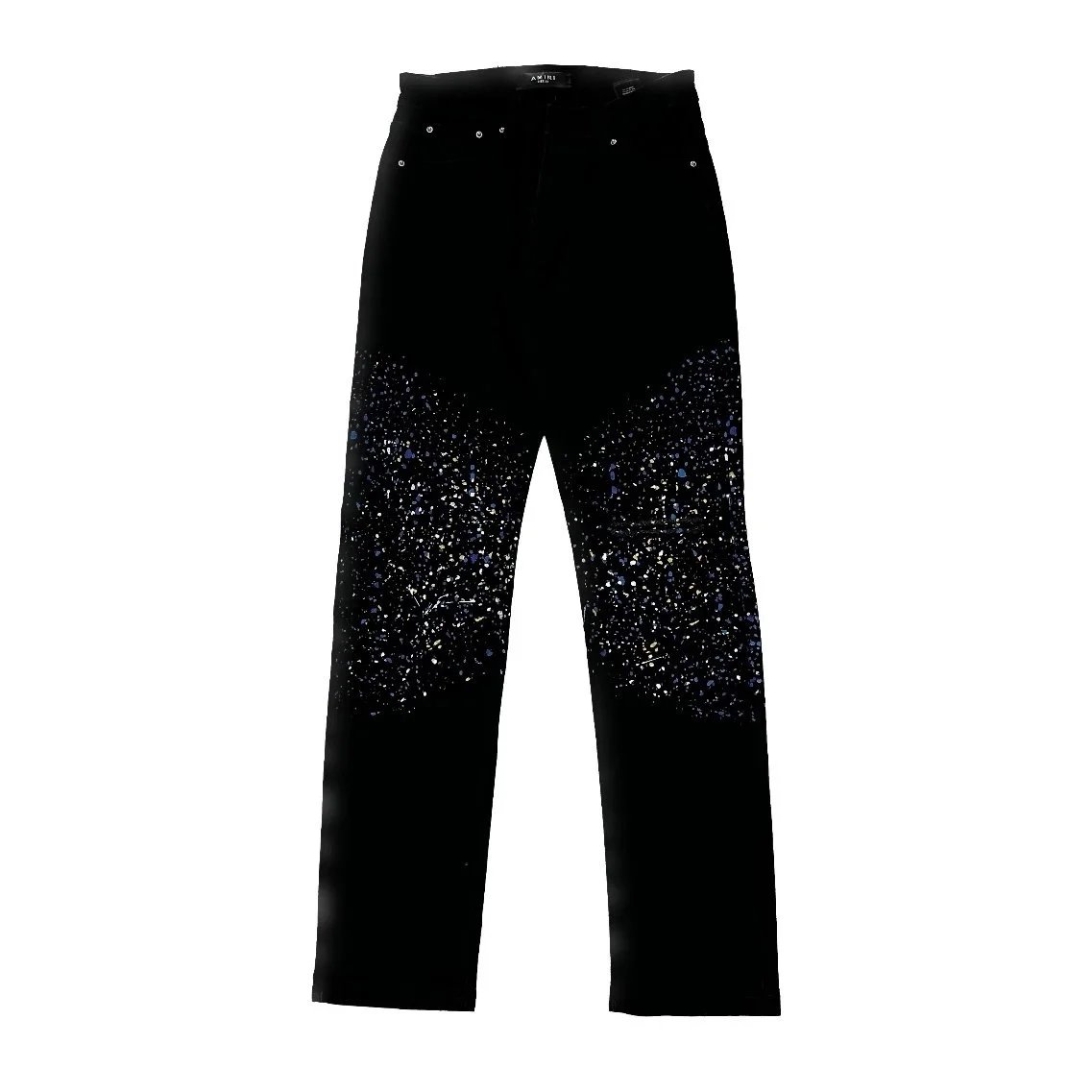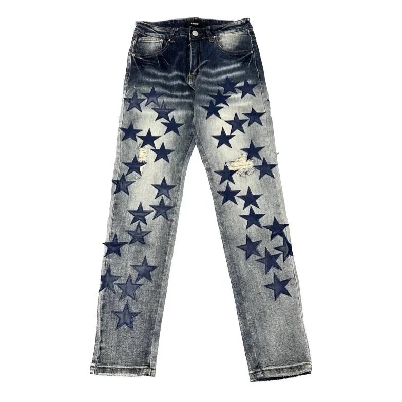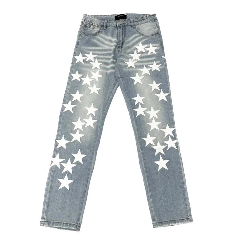 Bold star-print distressed denim jeans featuring a vintage wash and ripped details for a standout streetwear look. Perfect for making a fashion statement.