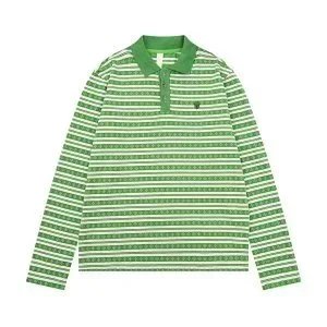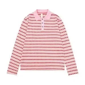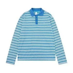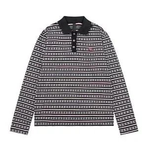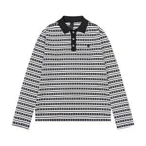 A stylish long-sleeve knit polo sweater featuring a bold black and white striped geometric pattern. Perfect for casual wear with a modern, textured design.