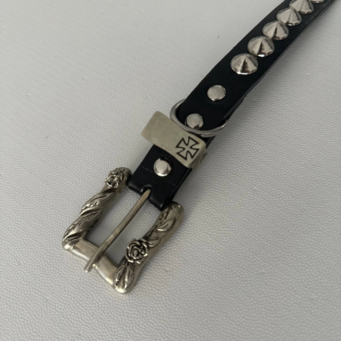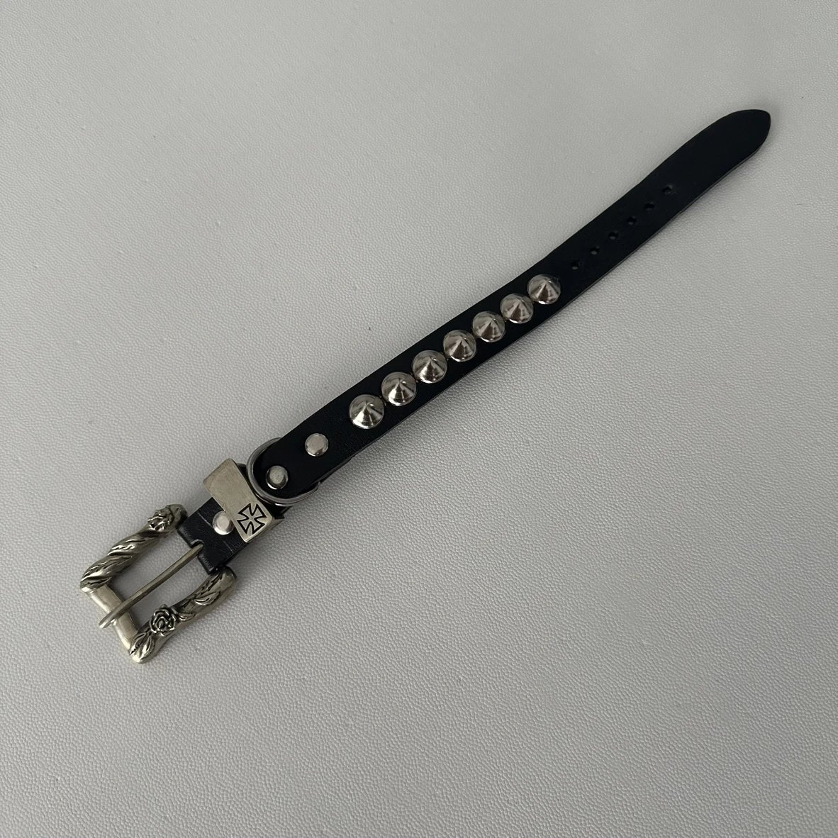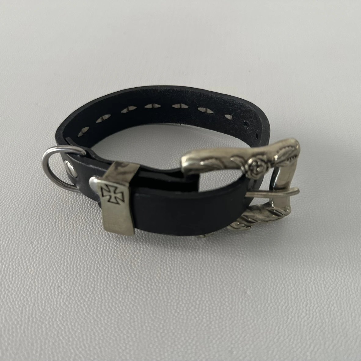 A bold black leather bracelet featuring silver-toned studs and a twisted floral buckle design, perfect for edgy fashion statements.