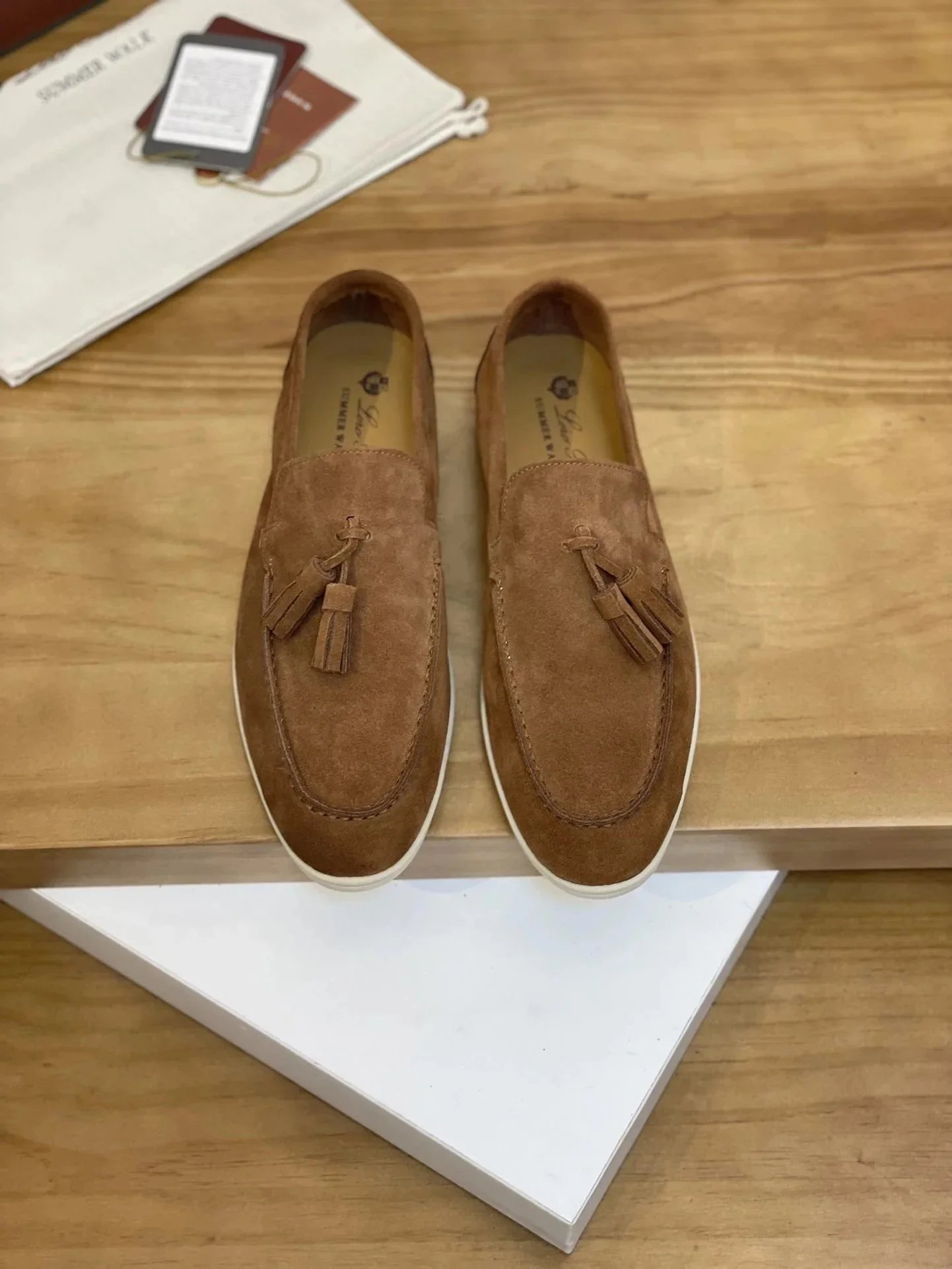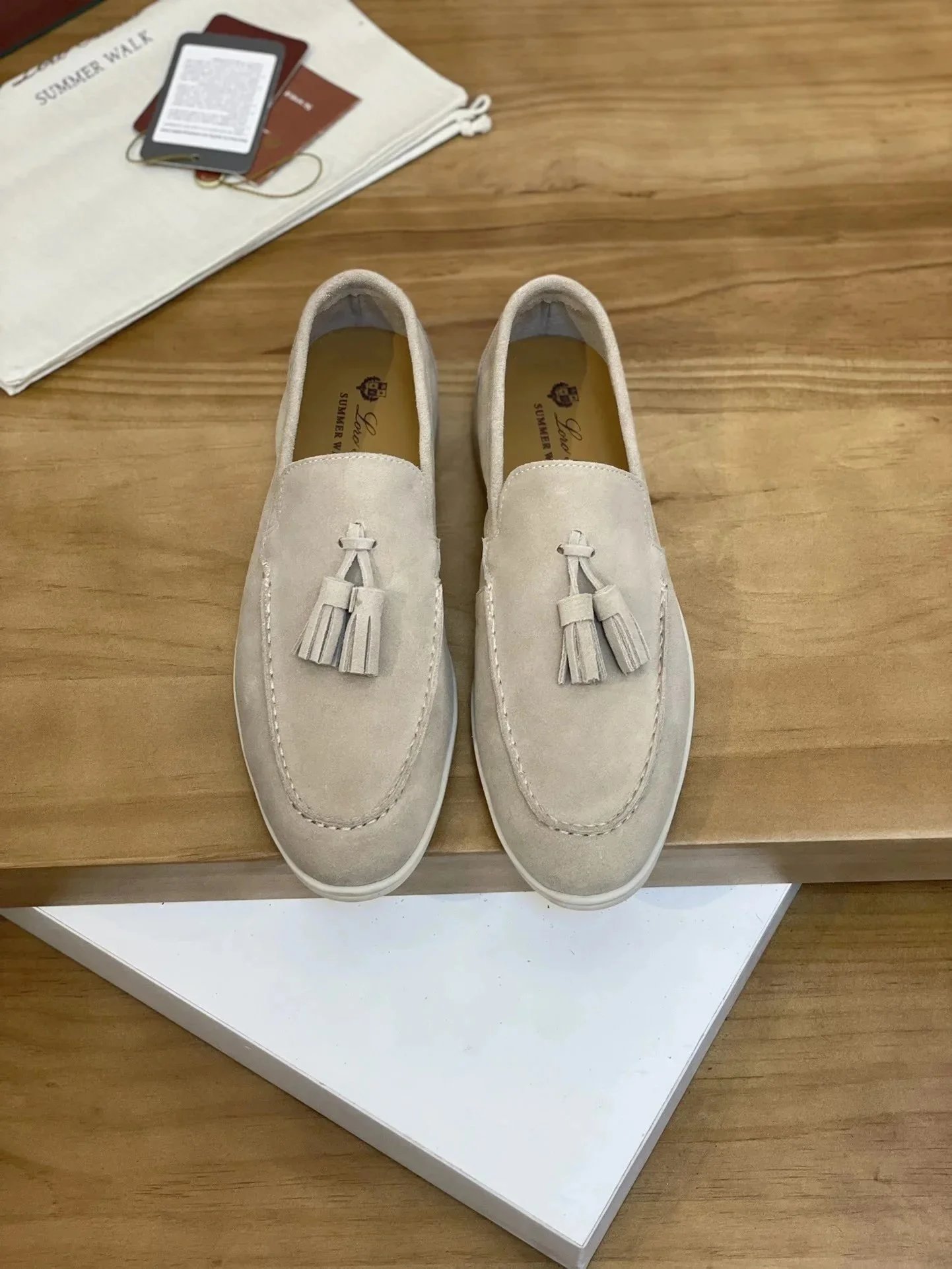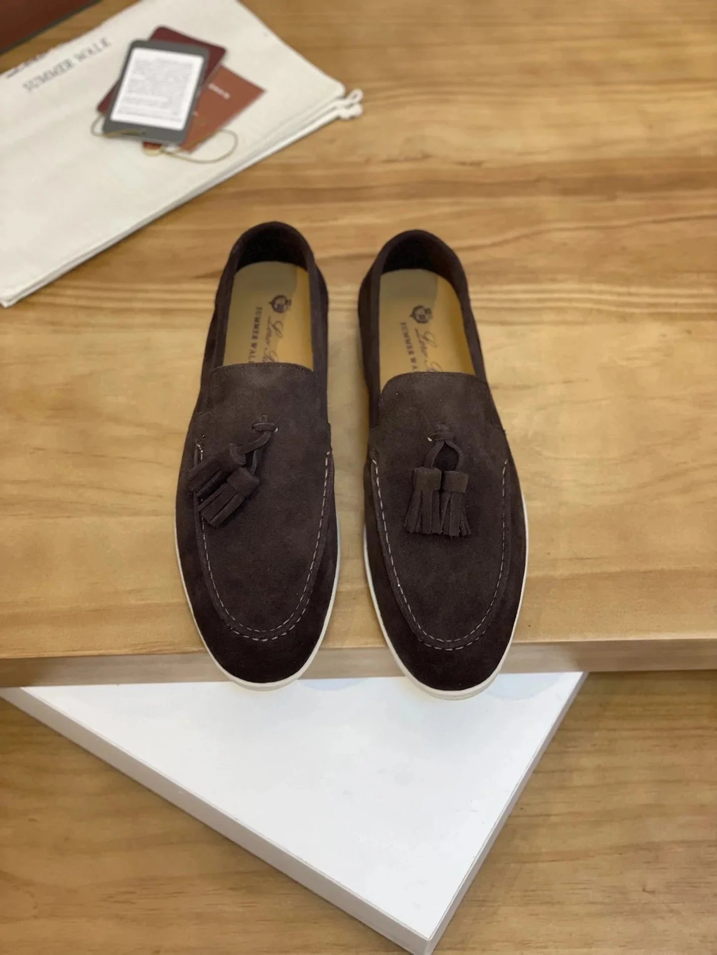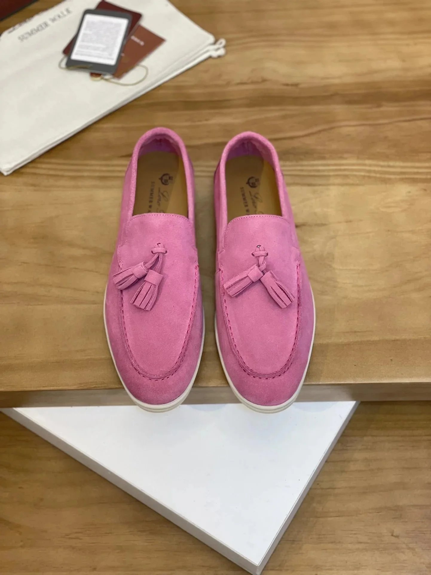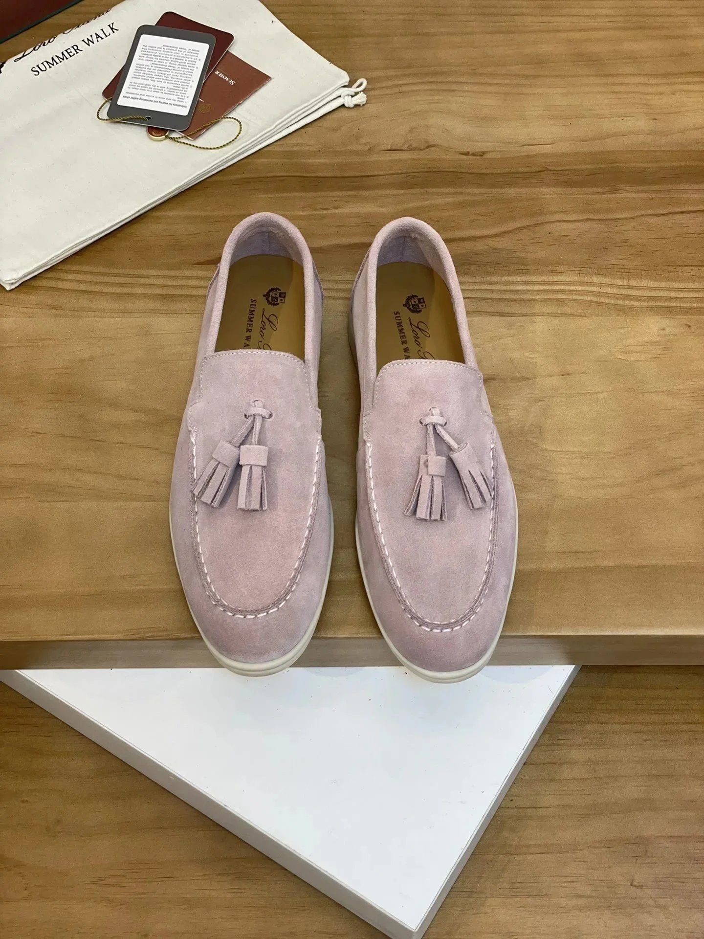 Elegant suede tassel loafers for men, available in multiple colors including brown, pink, white, and dark brown. Perfect for casual or smart-casual occasions.