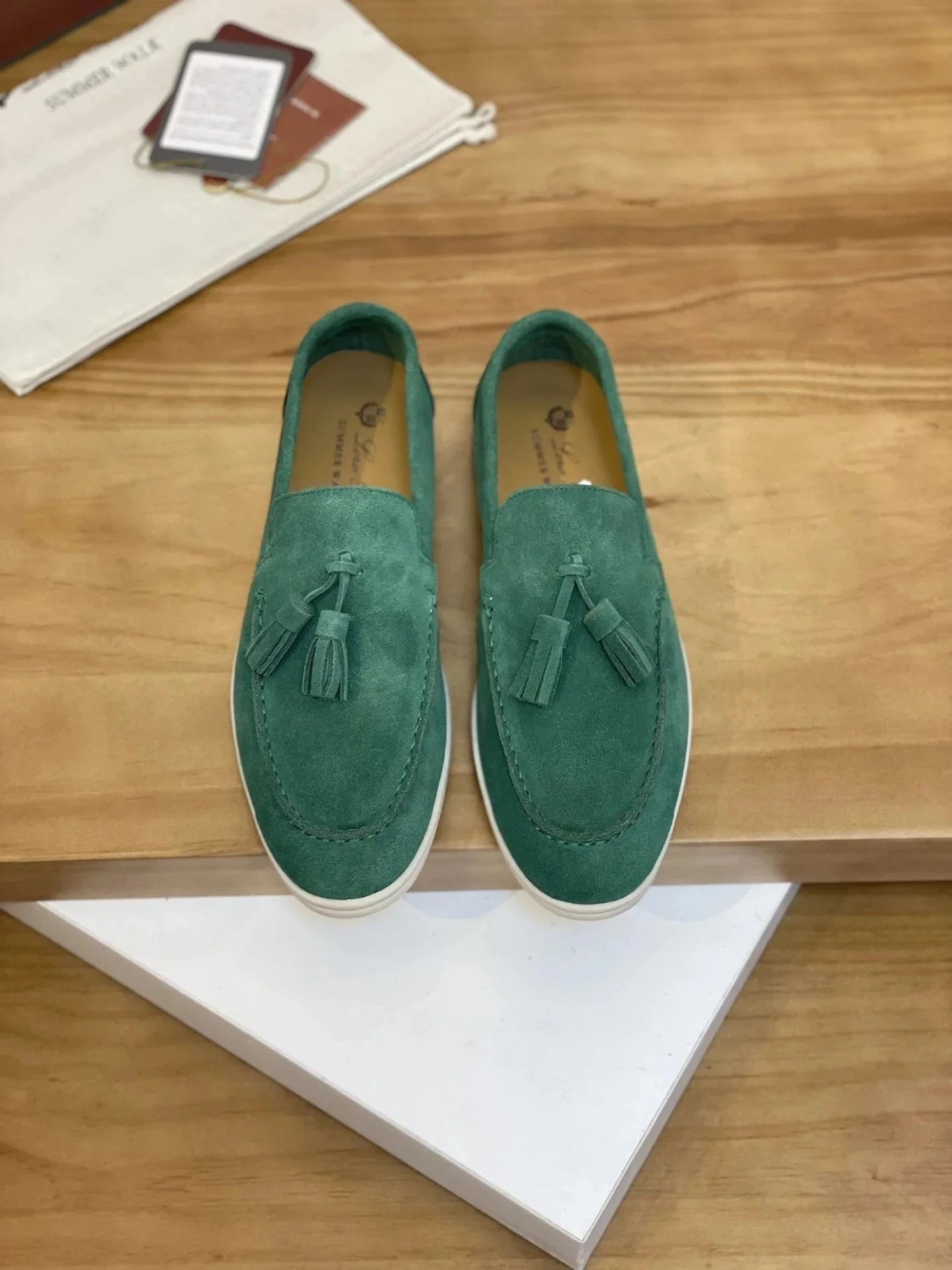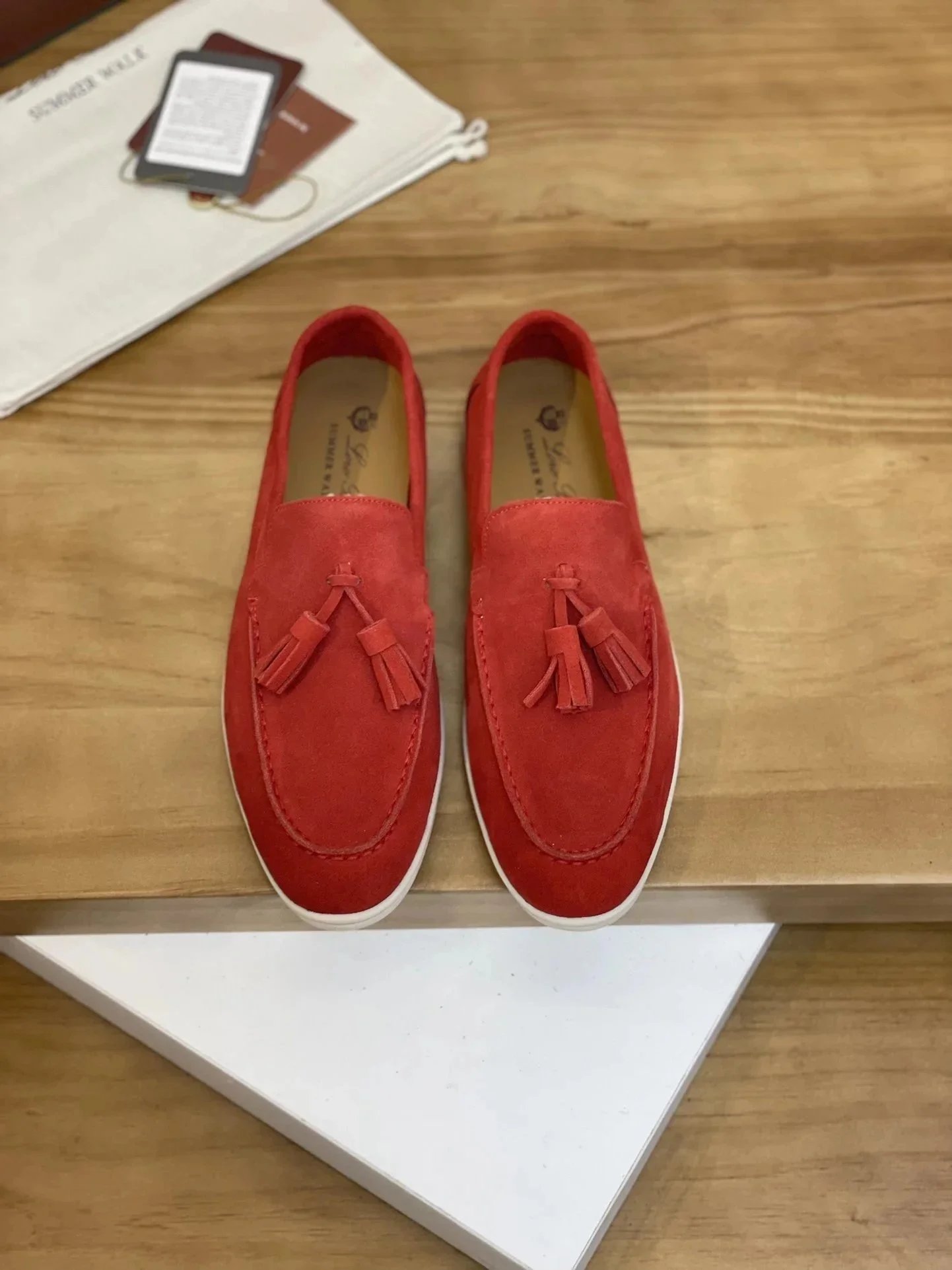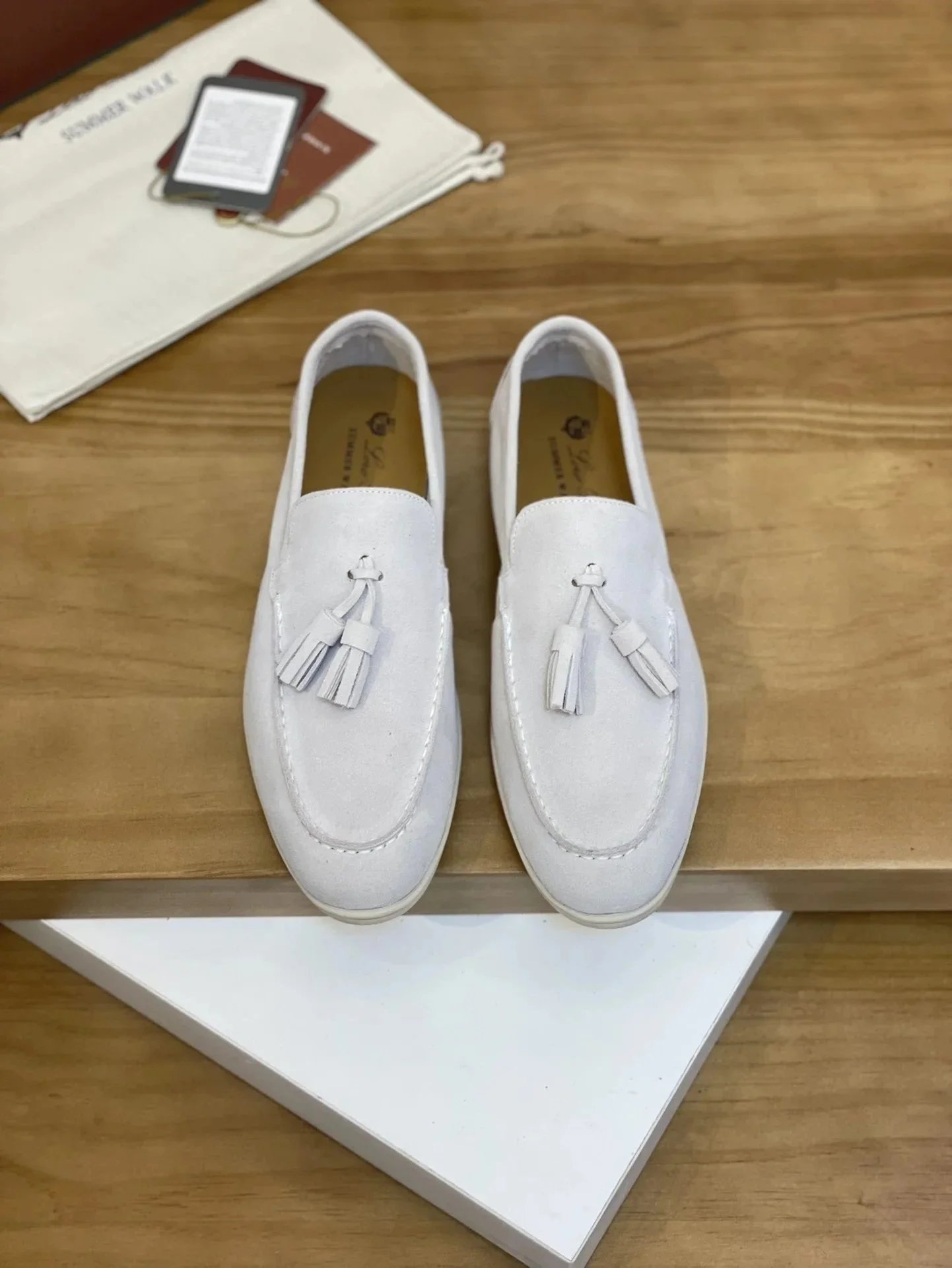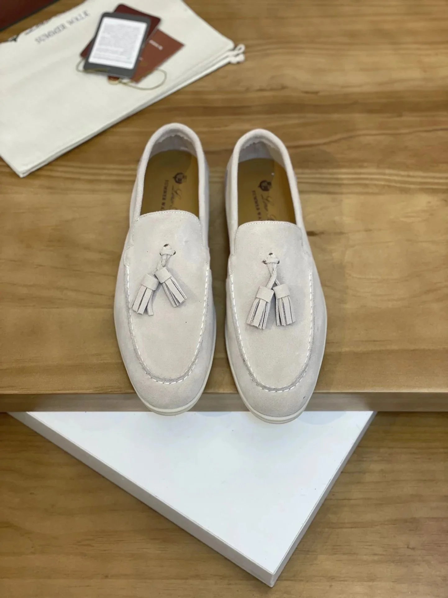 Elegant suede tassel loafers for men, available in multiple colors including brown, pink, white, and dark brown. Perfect for casual or smart-casual occasions.