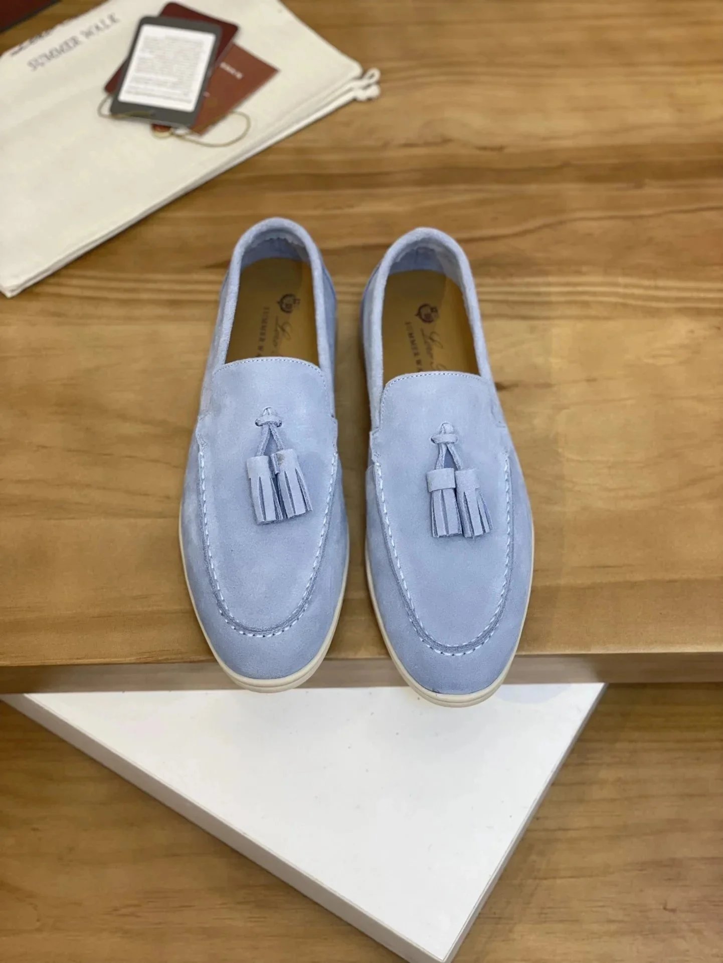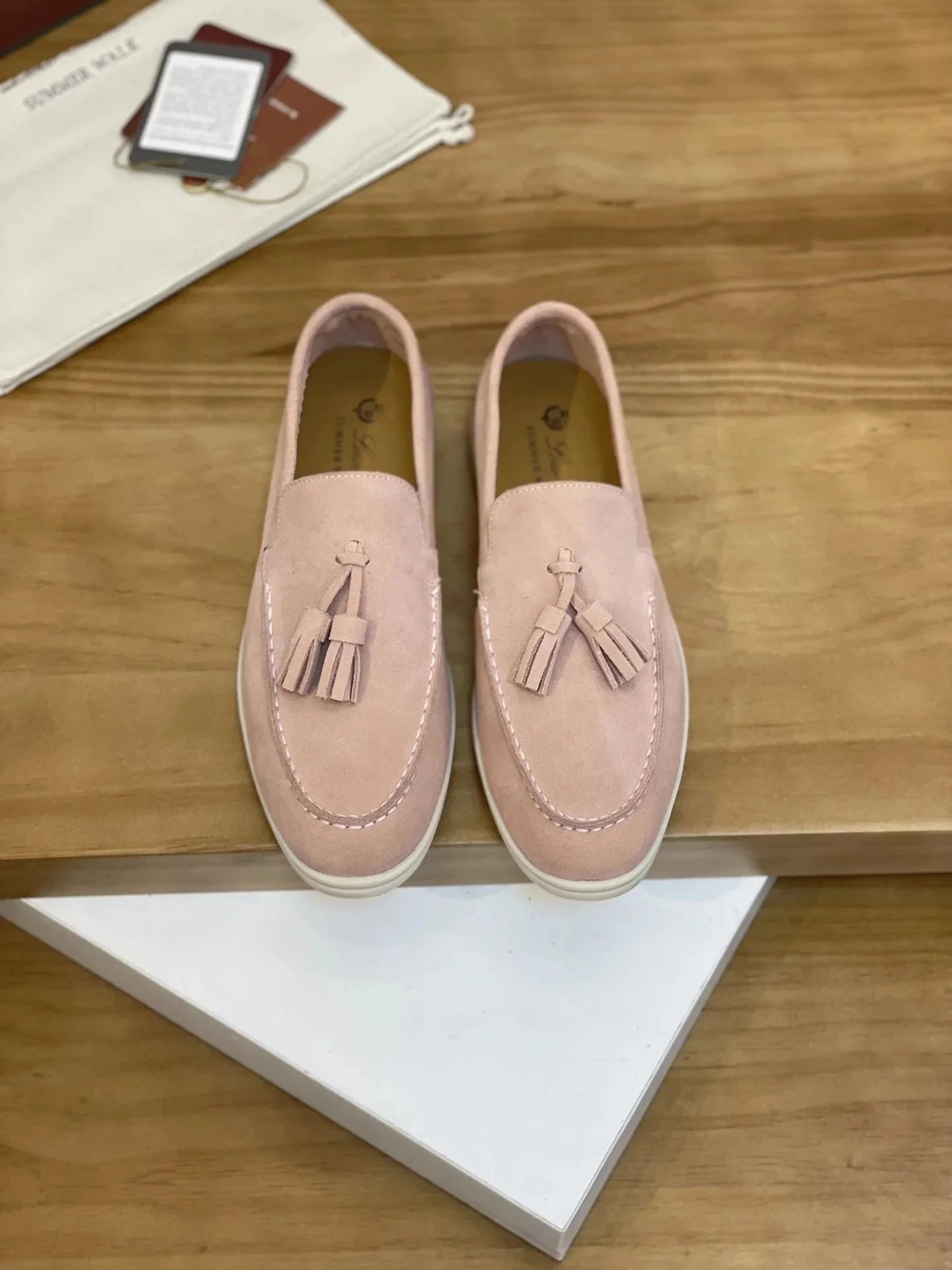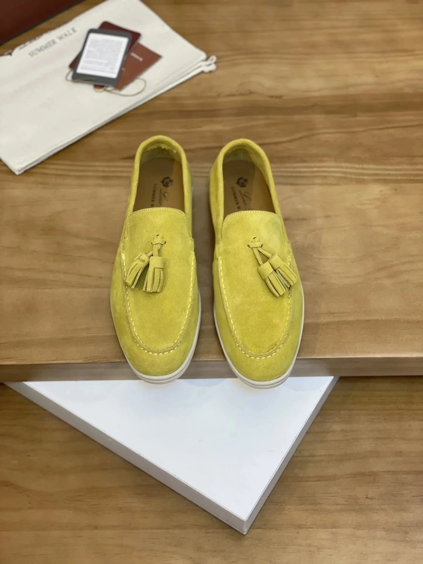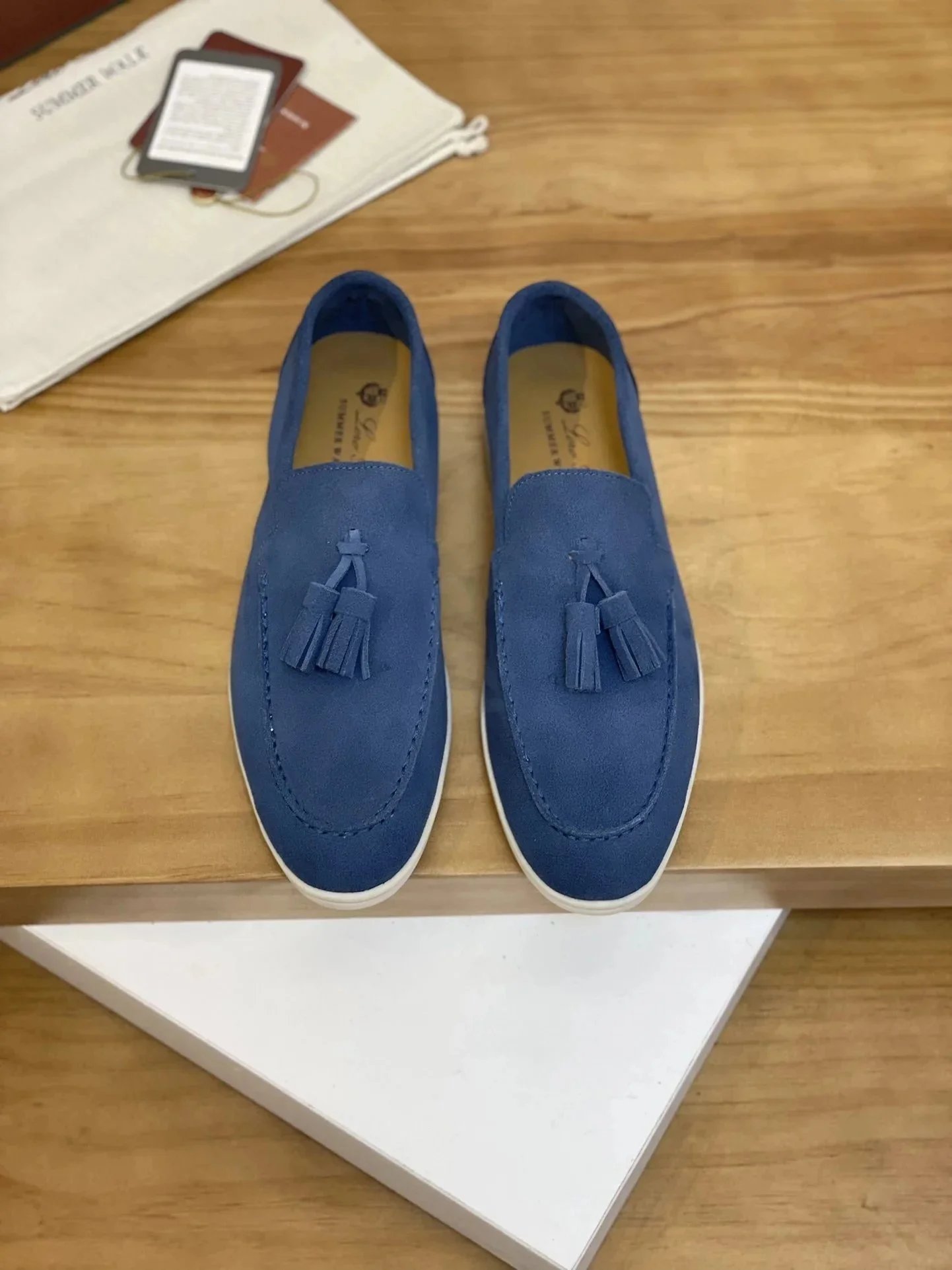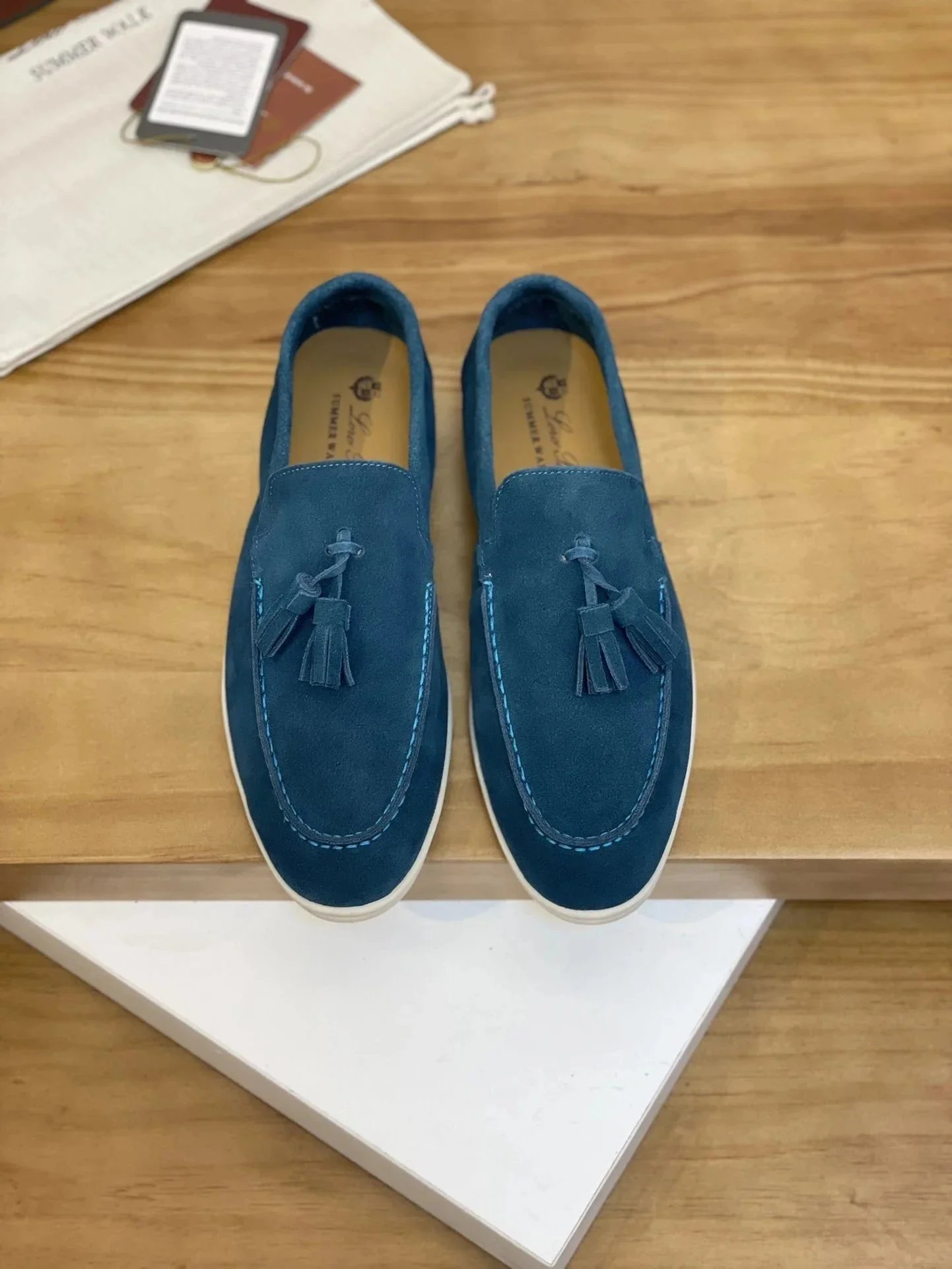Elegant suede tassel loafers for men, available in multiple colors including brown, pink, white, and dark brown. Perfect for casual or smart-casual occasions.