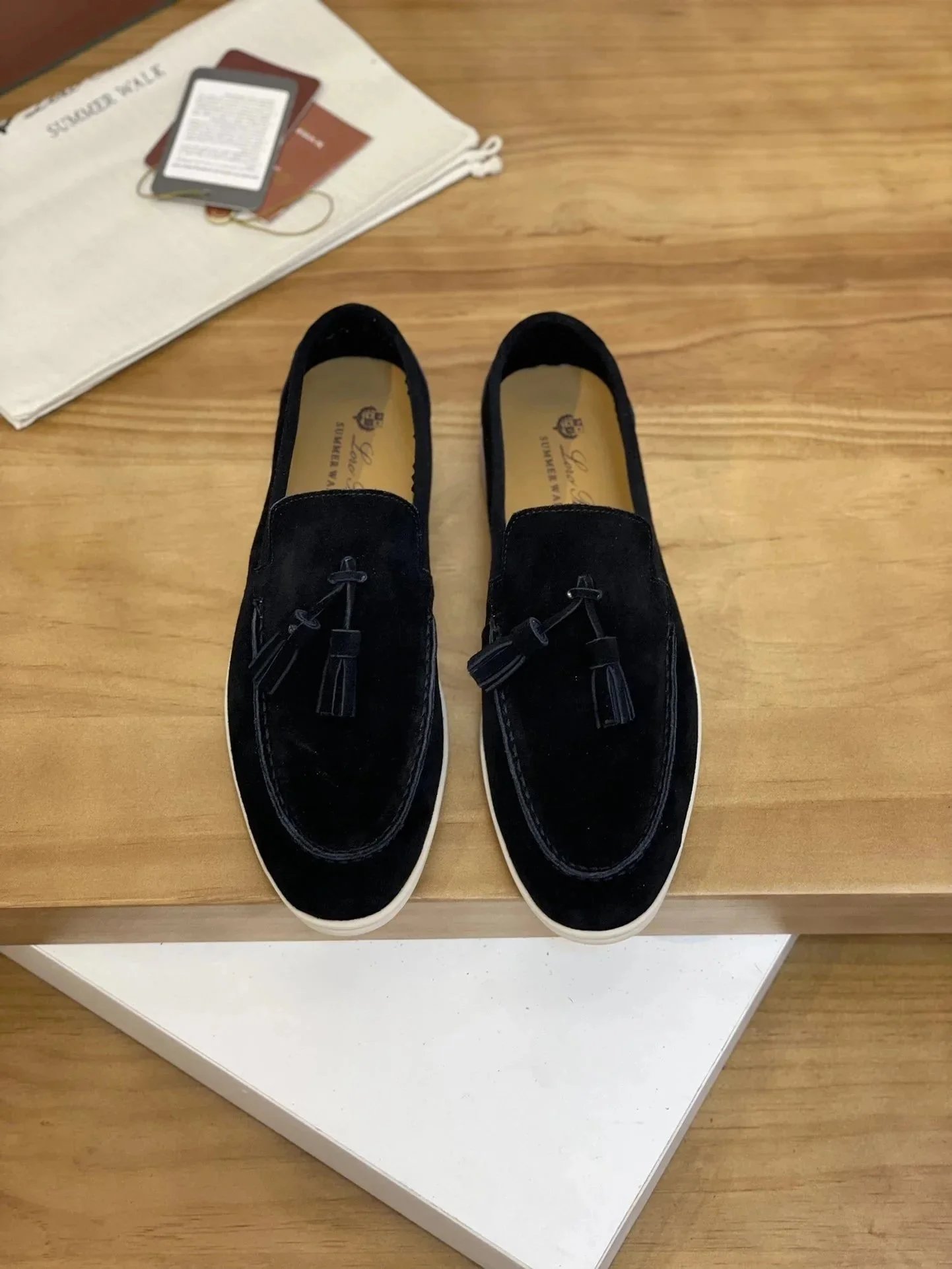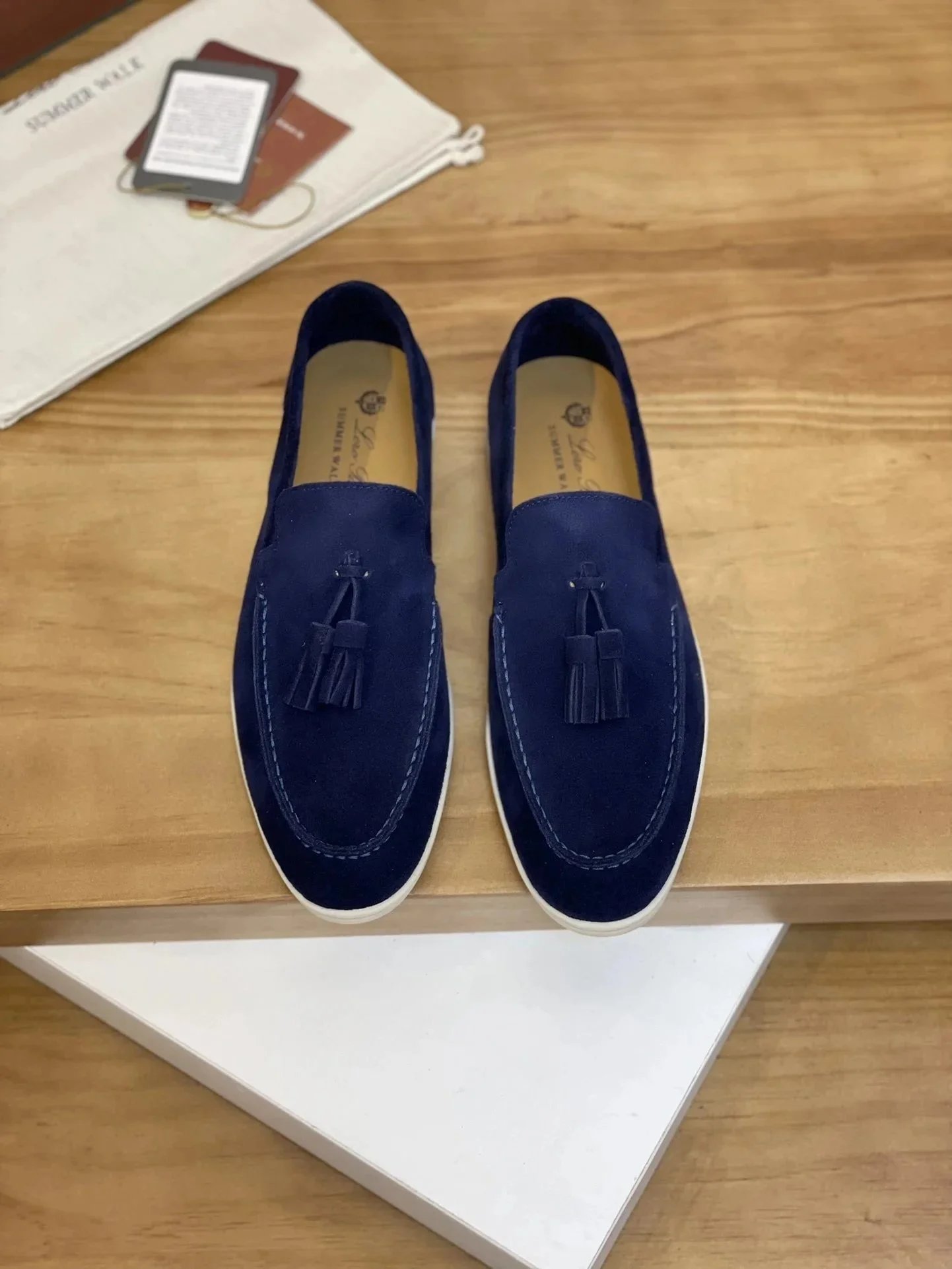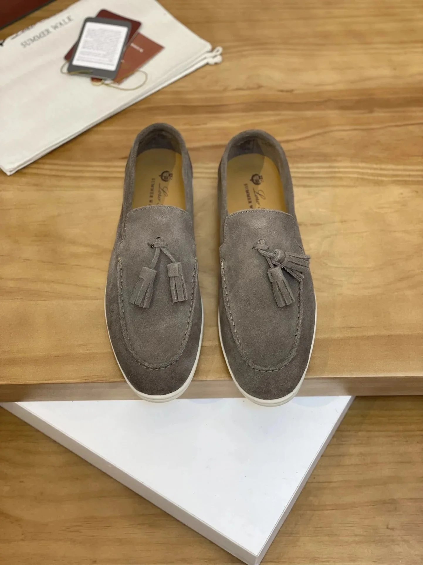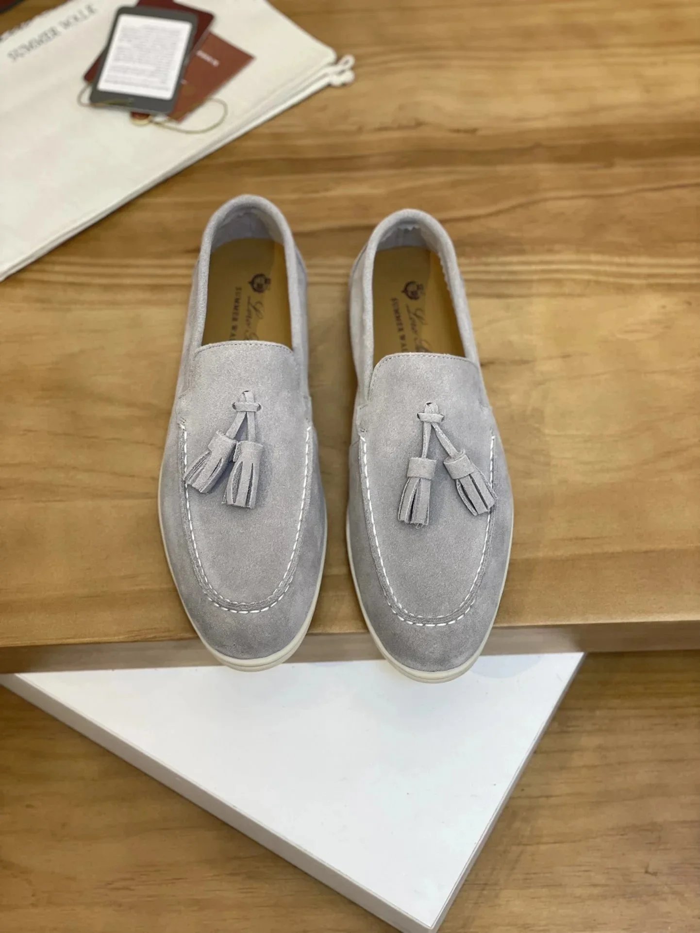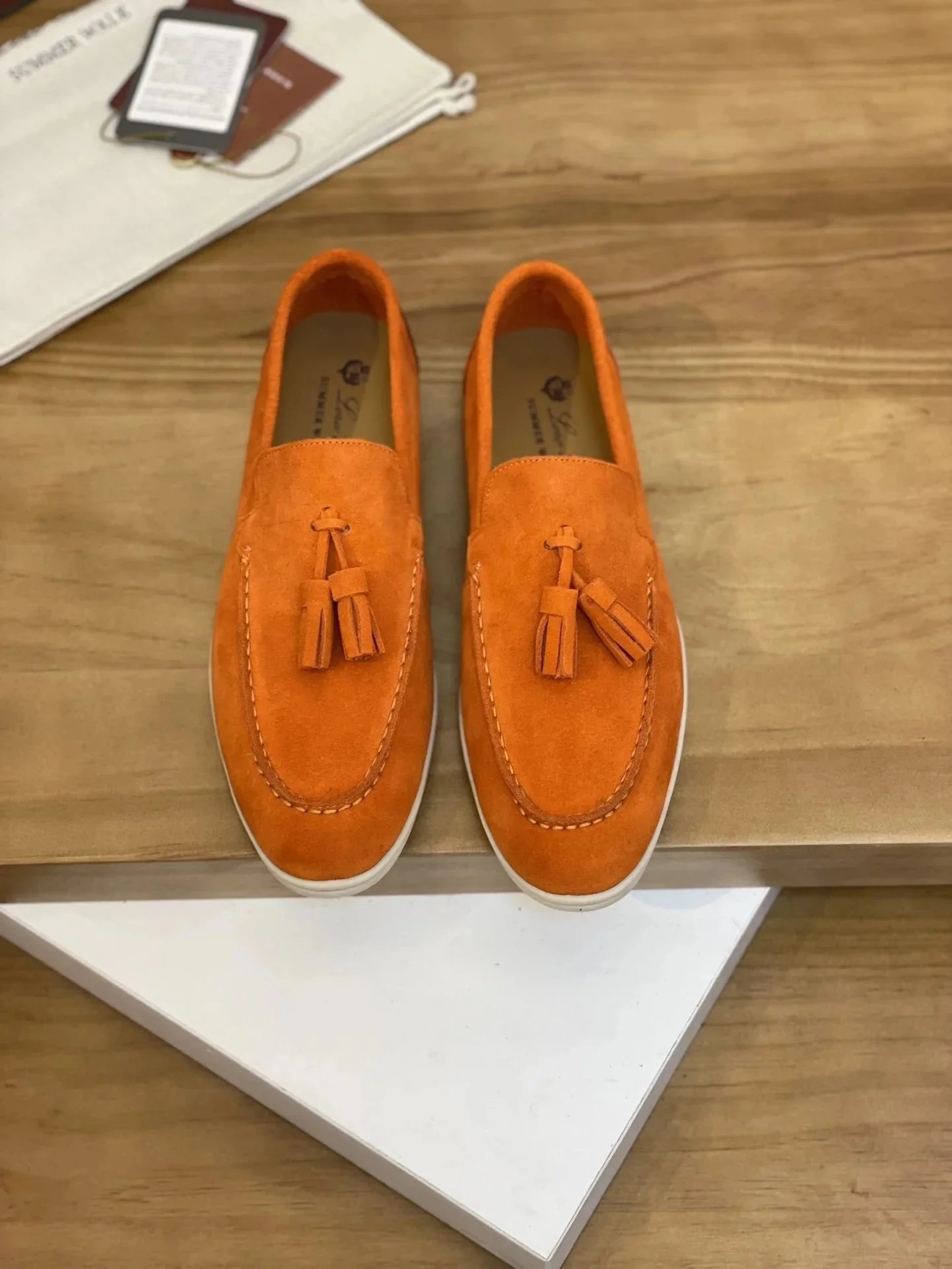 Elegant suede tassel loafers for men, available in multiple colors including brown, pink, white, and dark brown. Perfect for casual or smart-casual occasions.