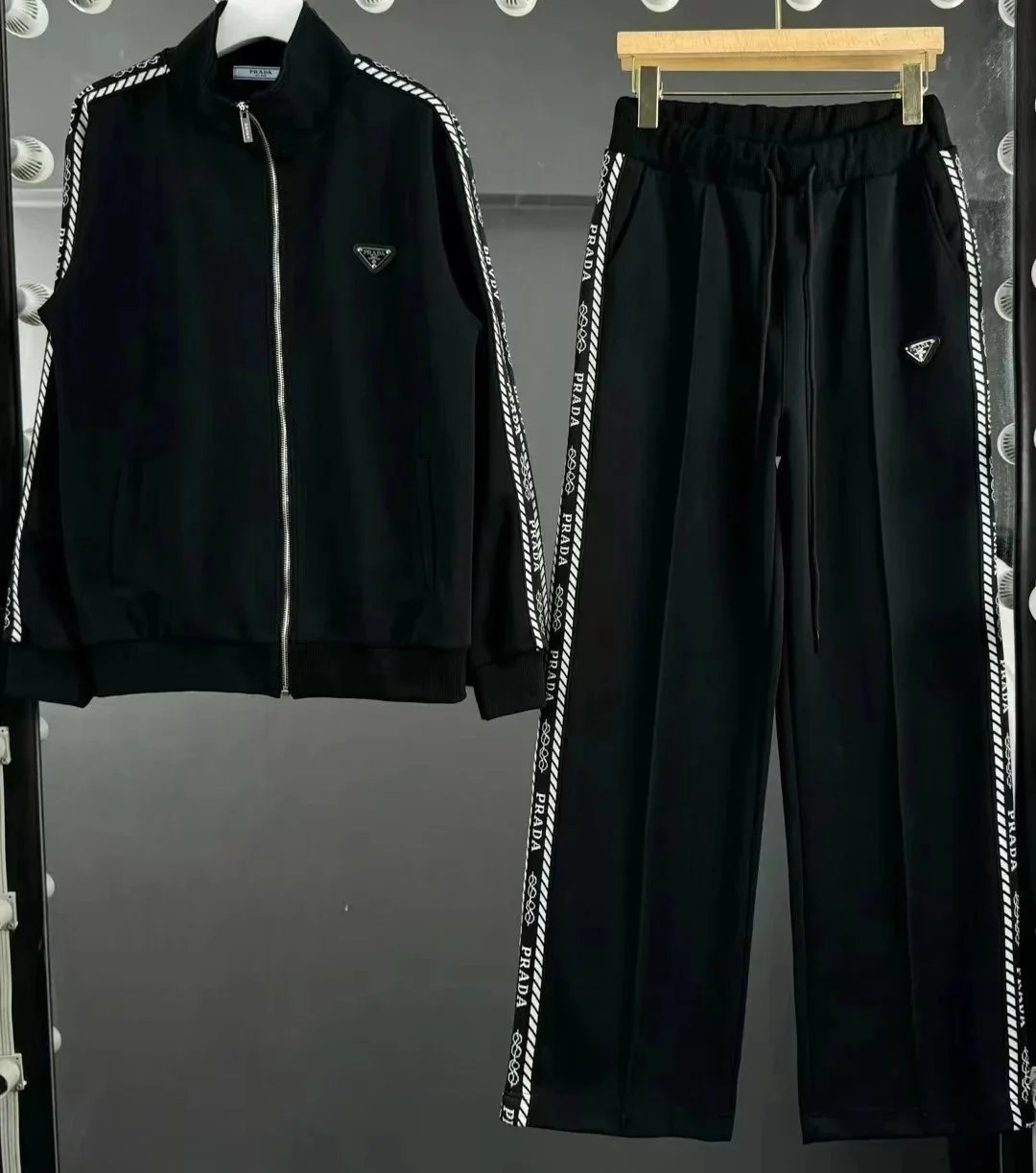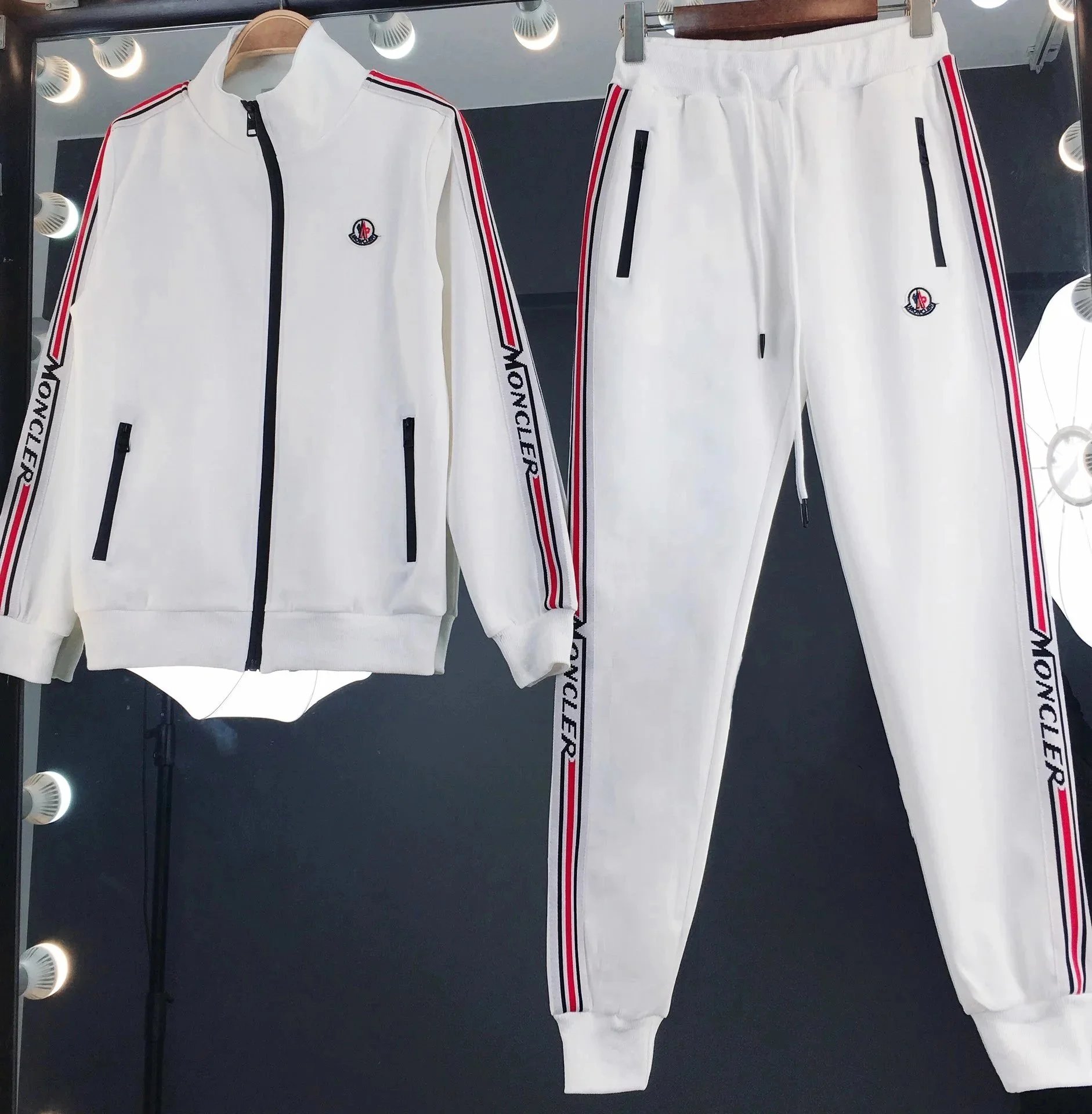 Stylish white and black track suits featuring brand-inspired logos and side stripes. Perfect for casual wear or athletic activities.