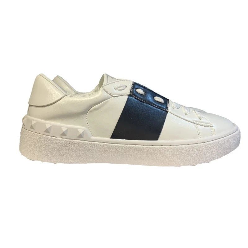 Elevate your look with these sleek white sneakers featuring bold gold pyramid studs for a touch of edgy elegance.