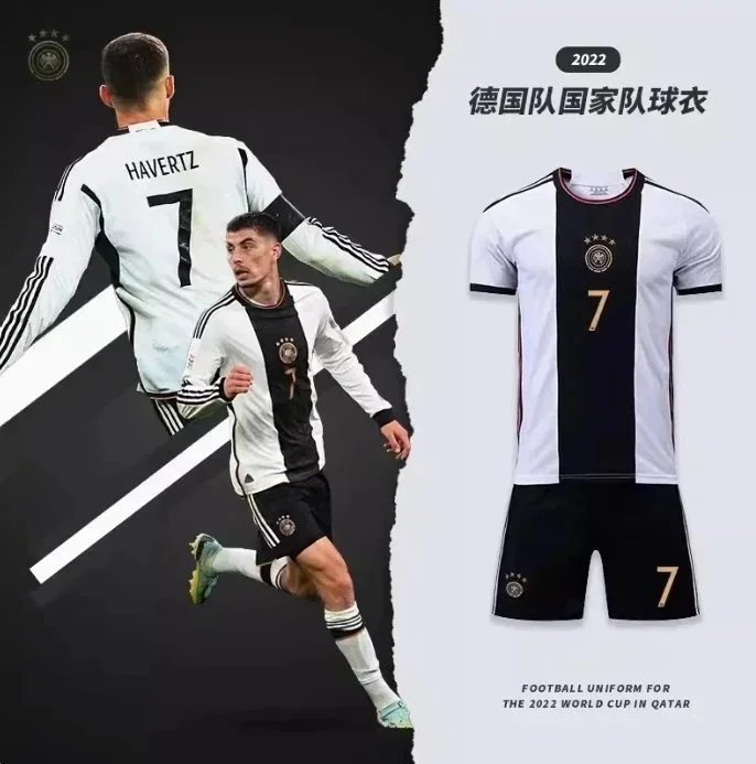Official Germany national team home jersey for the 2022 FIFA World Cup in Qatar, featuring white base with black and orange accents, worn by players including number 13. Authentic match-style design.