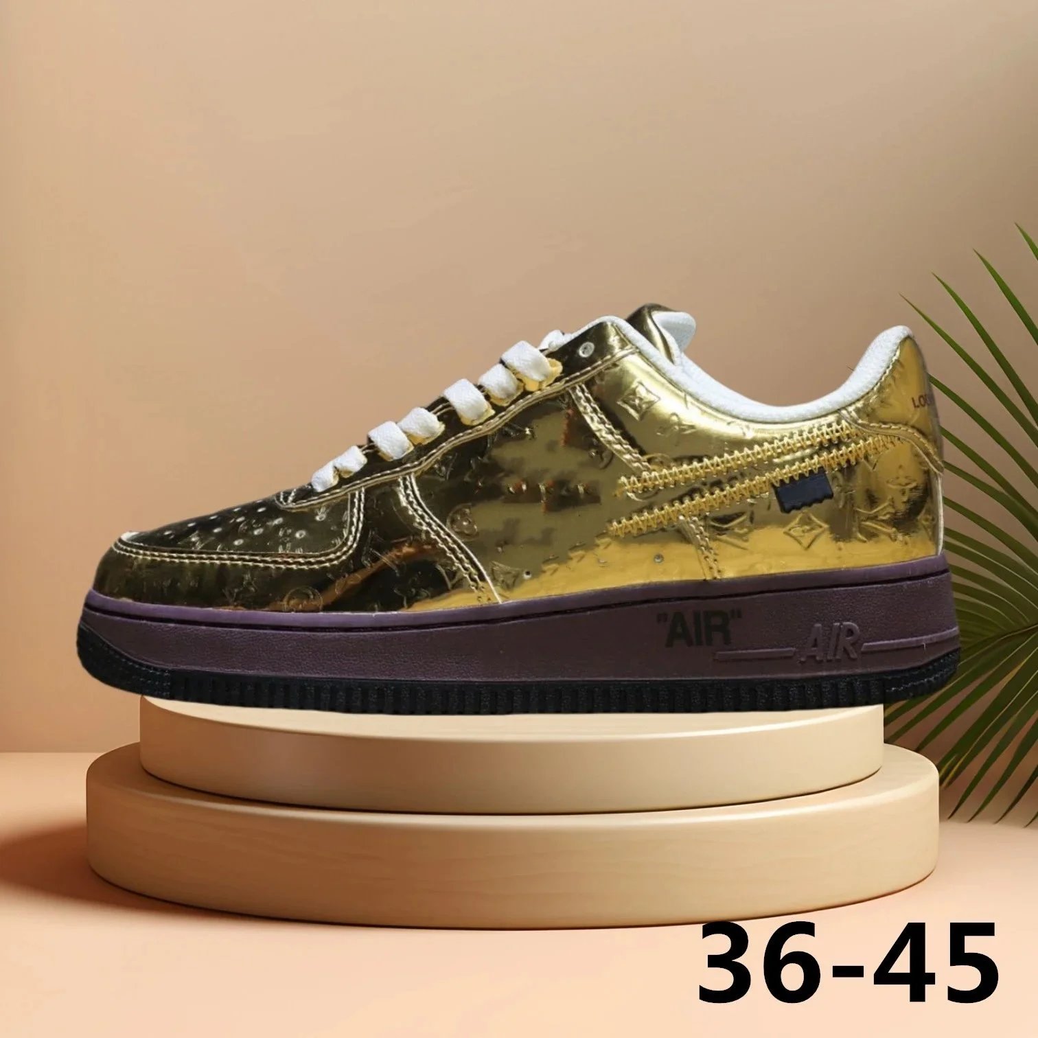 Shine in style with these gold metallic sneakers featuring a bold purple sole and premium detailing — perfect for making a statement.