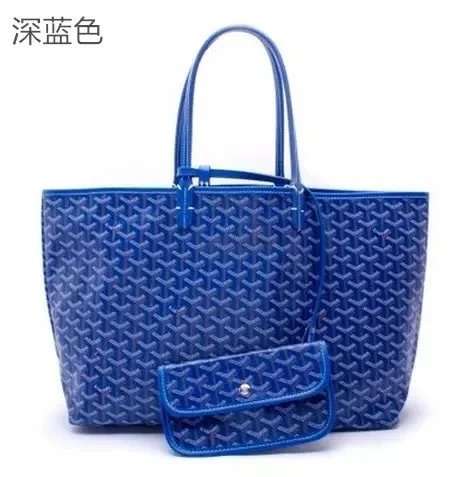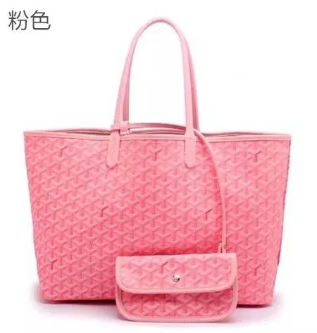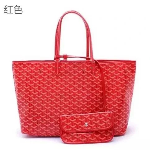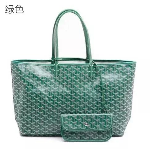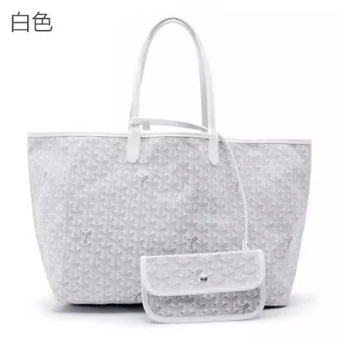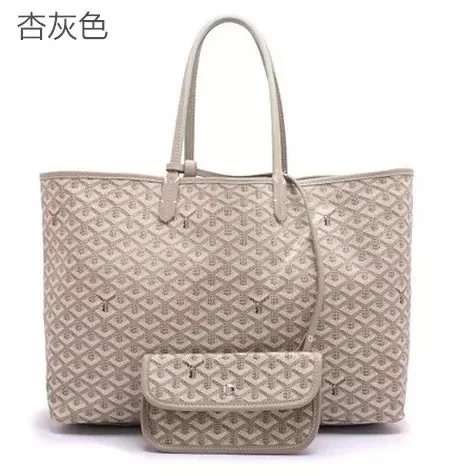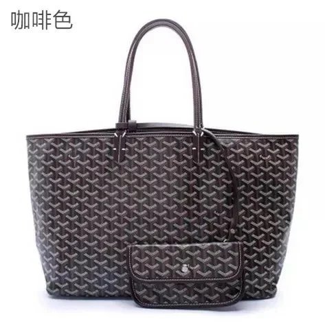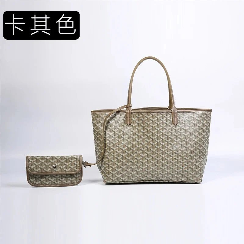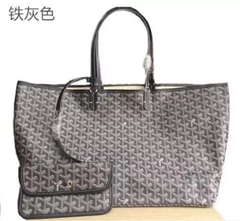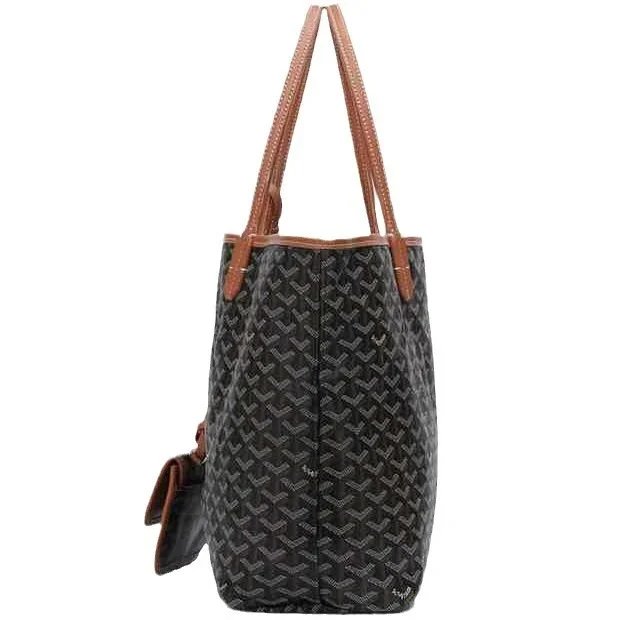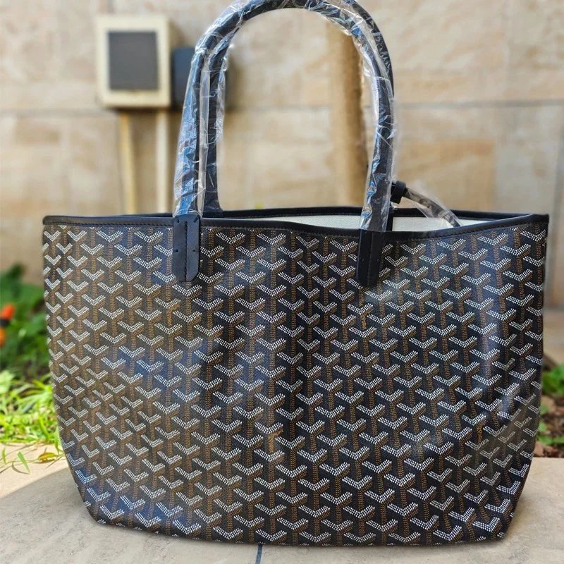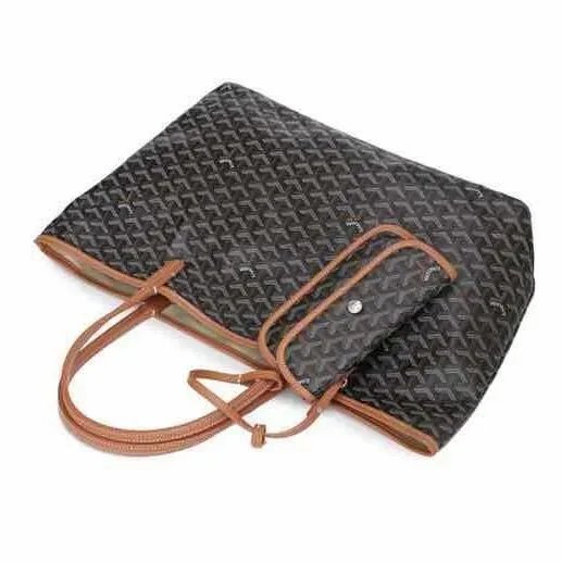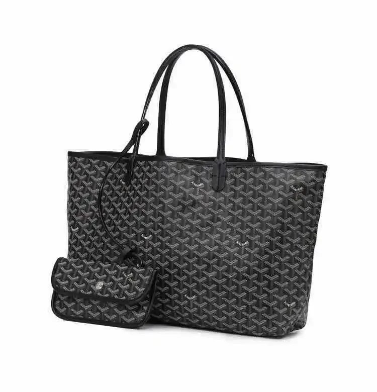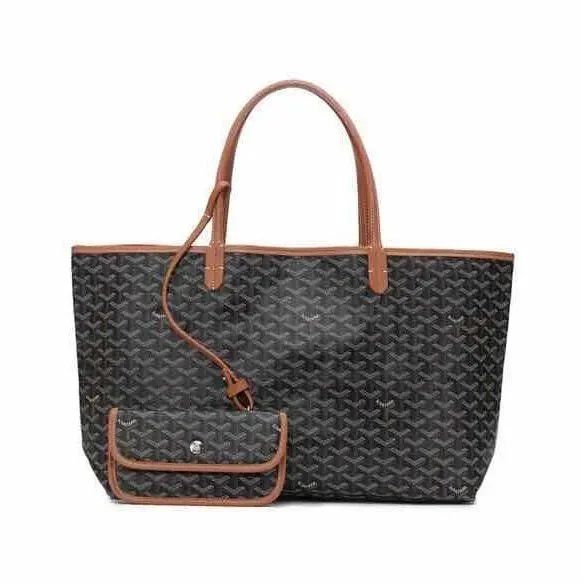 Elegant Goyard tote bag featuring the iconic monogram pattern in dark gray and beige tones, paired with durable leather handles. Perfect for everyday use or travel.