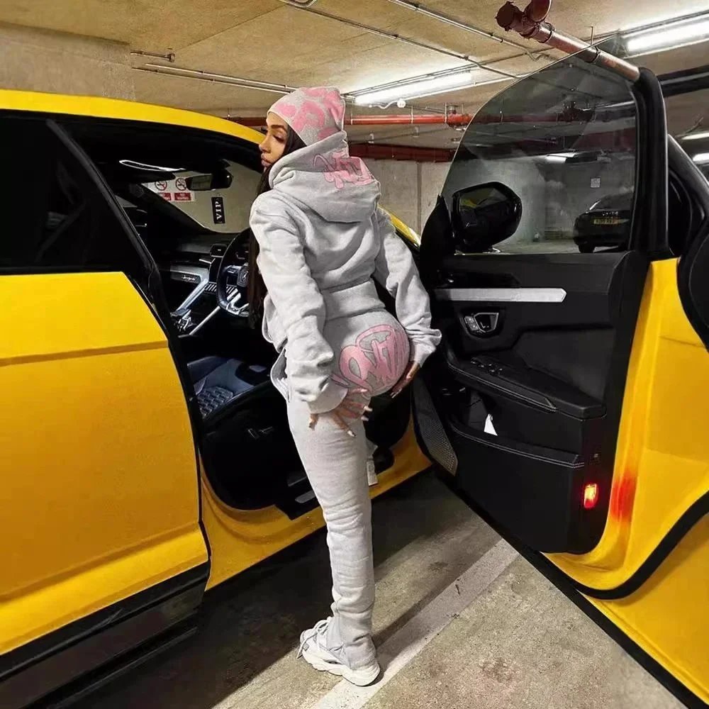 Stylish hoodie and jogger pants sets featuring bold graffiti graphics in five vibrant colors for everyday casual wear. Each set includes matching hooded top and tapered sweatpants.