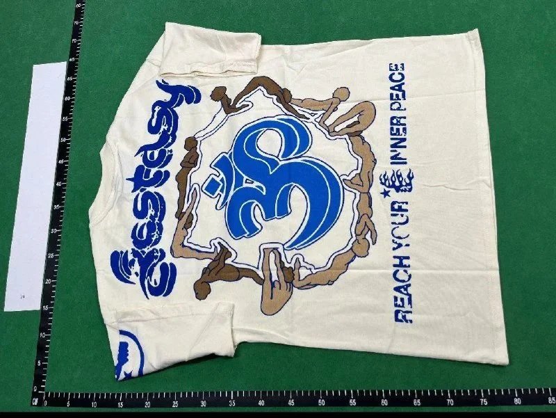 White t-shirt featuring a bold blue OM symbol surrounded by figures in meditation, with 'Reach Your Inner Peace' text. Ideal for spiritual or festival wear.