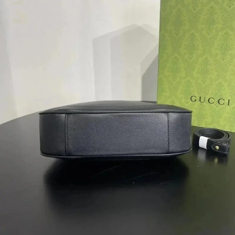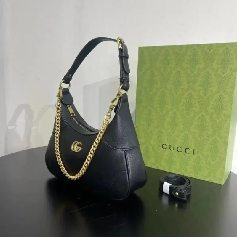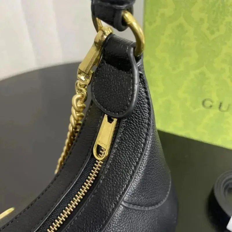 Elegant Gucci black leather horsebit shoulder bag featuring a gold chain strap and iconic double G logo. Perfect for luxury style and everyday elegance.