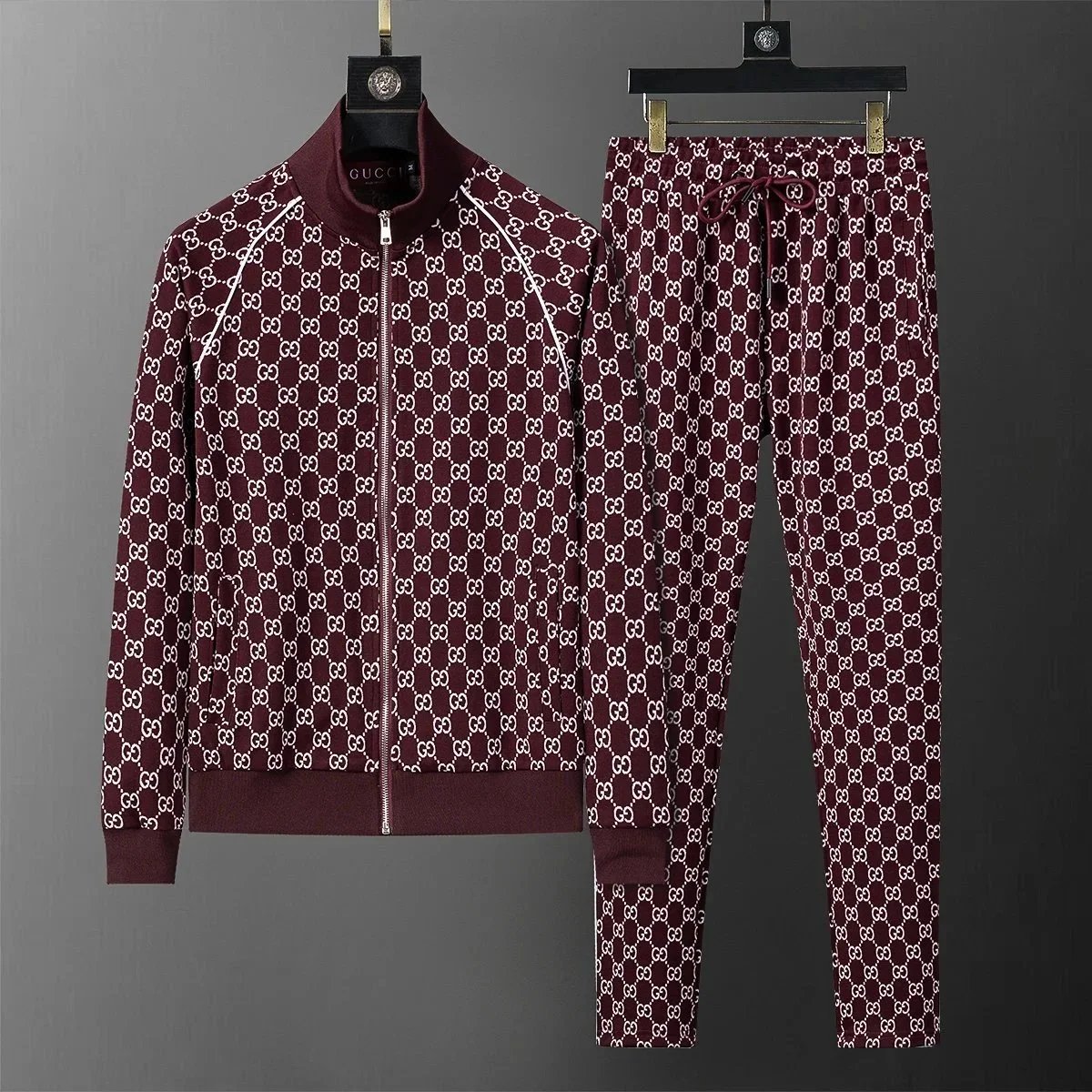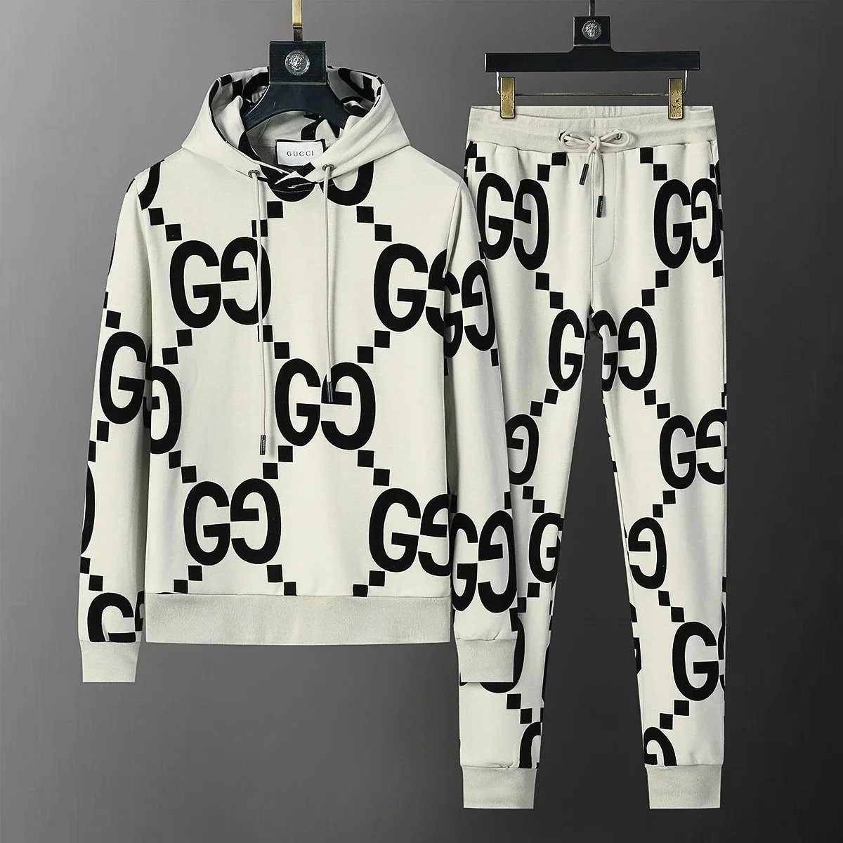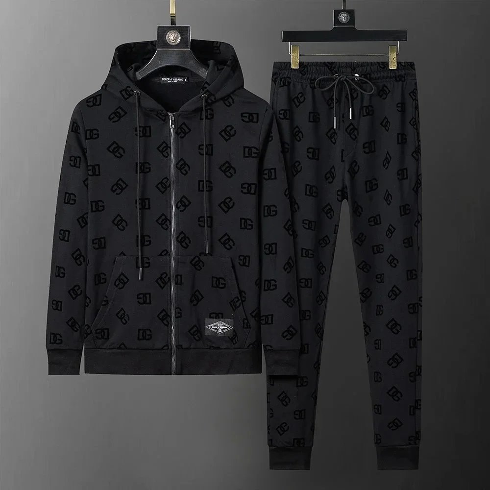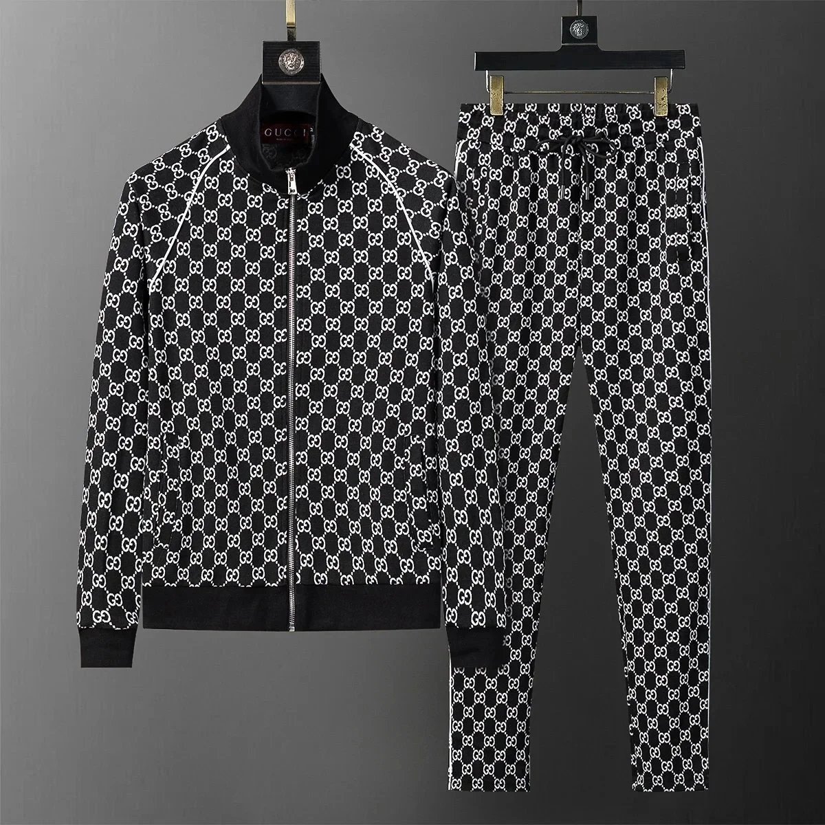 Luxury Gucci black monogram tracksuit featuring a full-zip hoodie and matching drawstring joggers for premium comfort and iconic style.