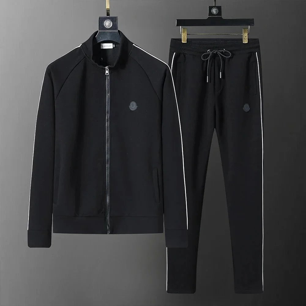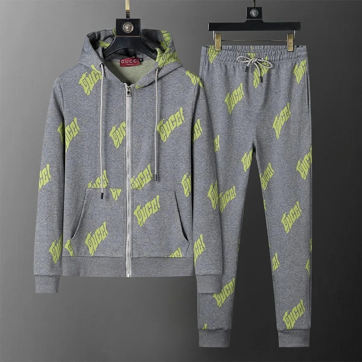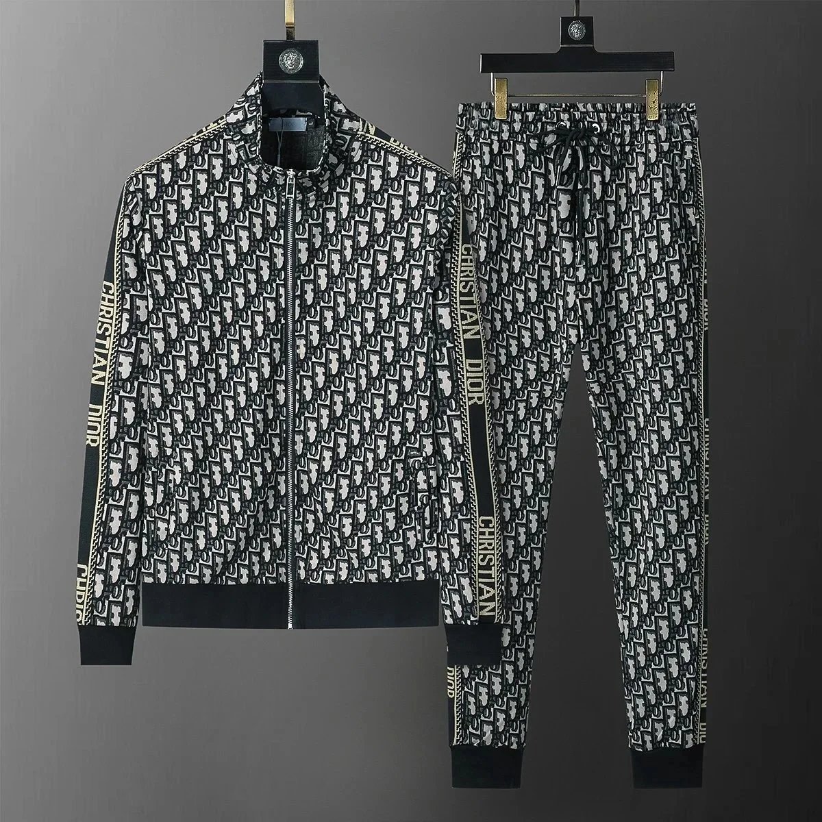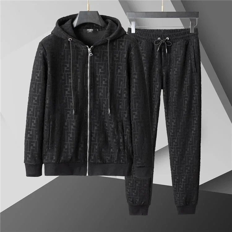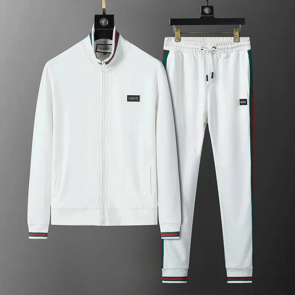 Luxury Gucci black monogram tracksuit featuring a full-zip hoodie and matching drawstring joggers for premium comfort and iconic style.