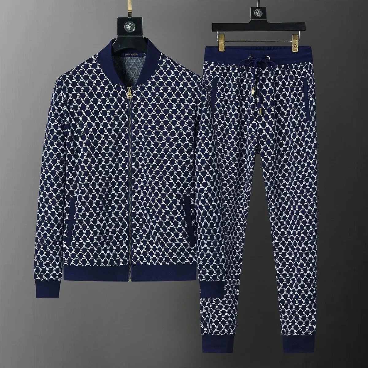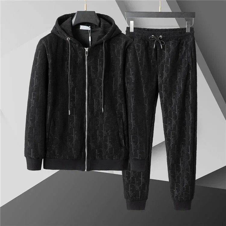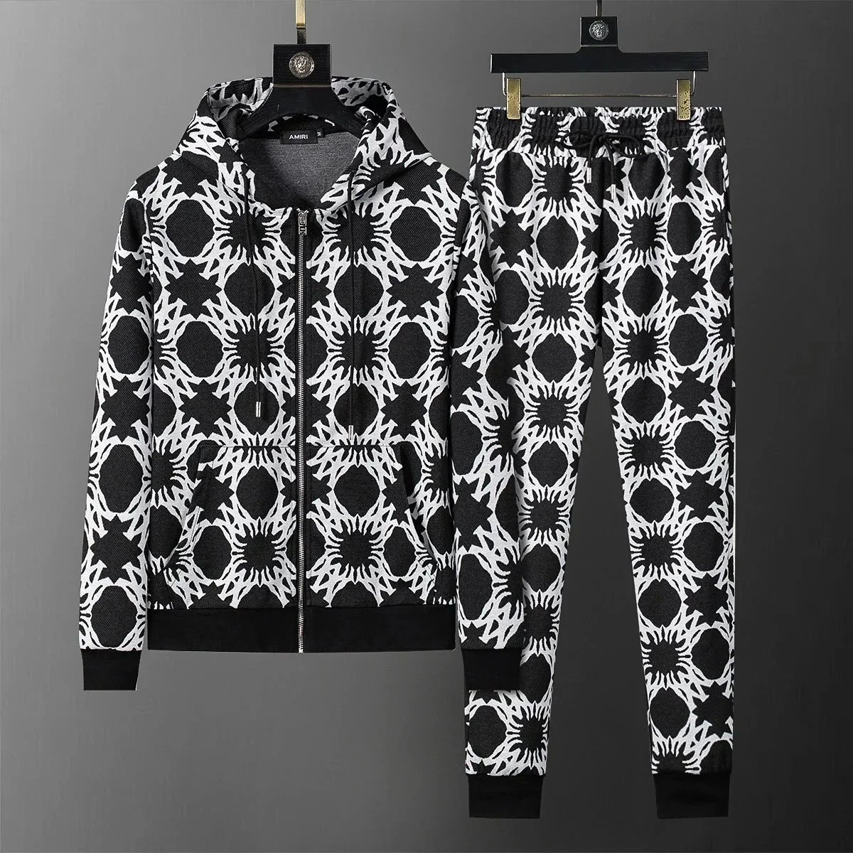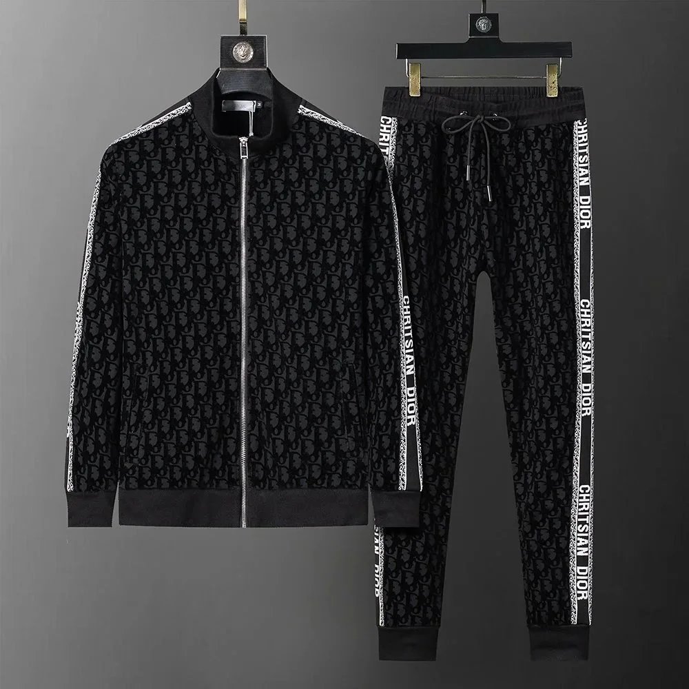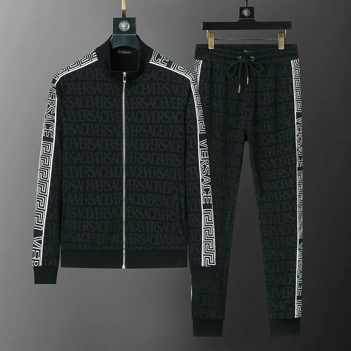 Luxury Gucci black monogram tracksuit featuring a full-zip hoodie and matching drawstring joggers for premium comfort and iconic style.