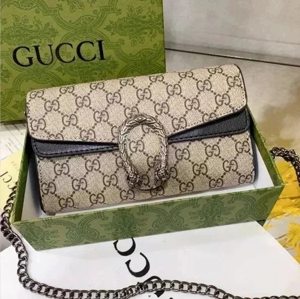 Elegant Gucci Dionysus mini bag in white and beige GG Supreme canvas with silver-tone chain strap. Crafted in Italy, this compact design features a signature horsebit clasp and comes with original packaging.