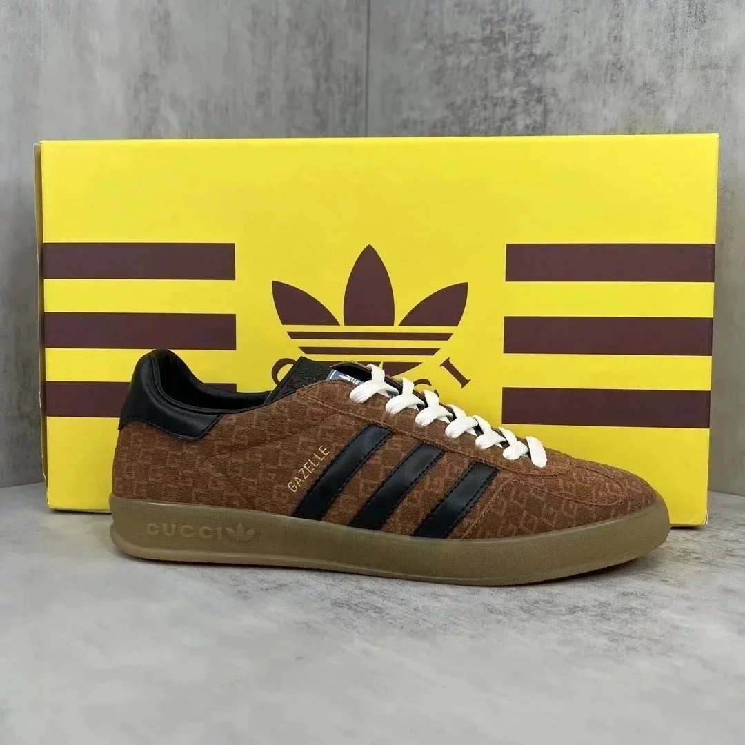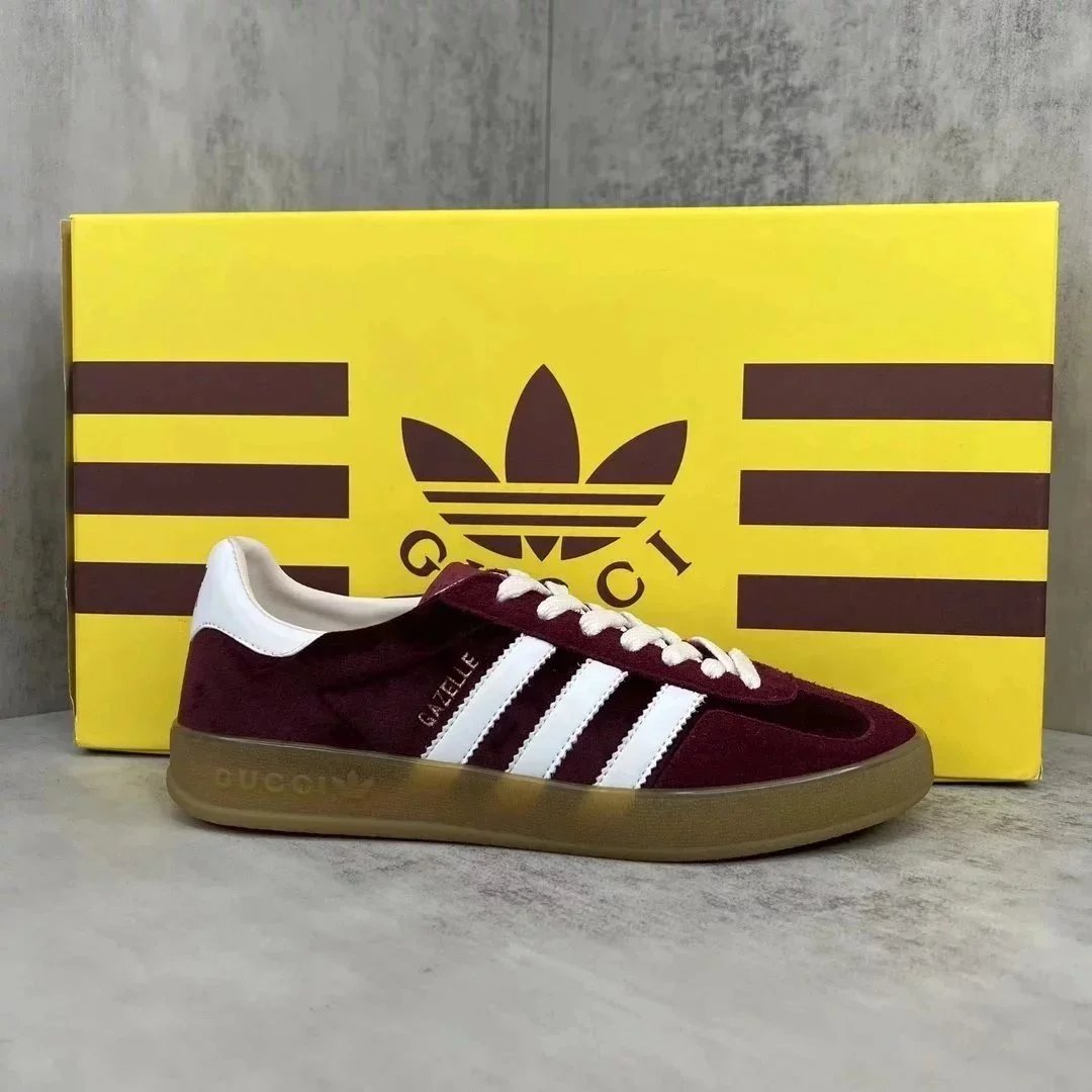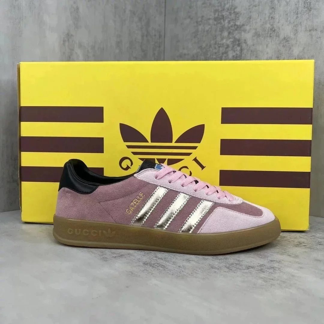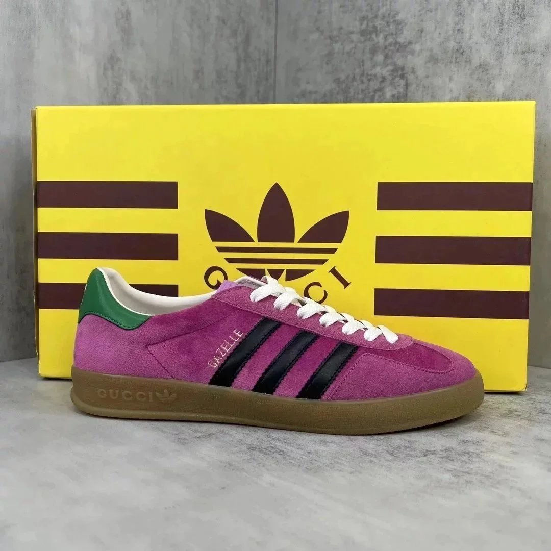 Luxury purple suede Gucci Gazelle sneaker featuring white stripes and a gum sole. Styled with iconic branding for high-end streetwear.