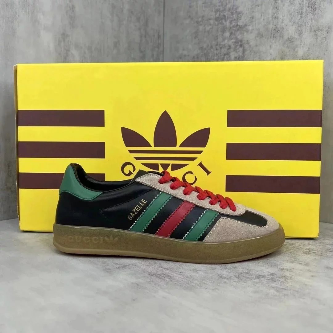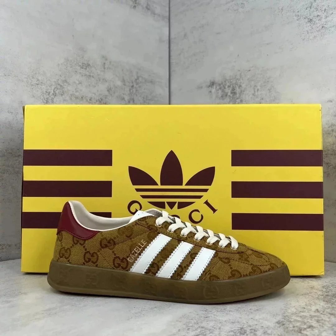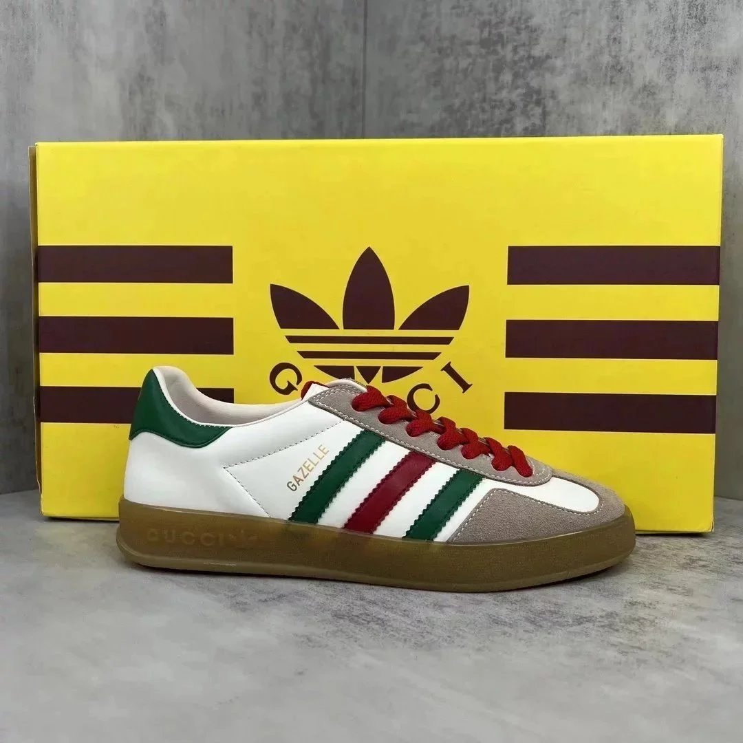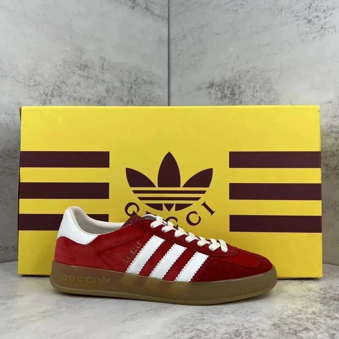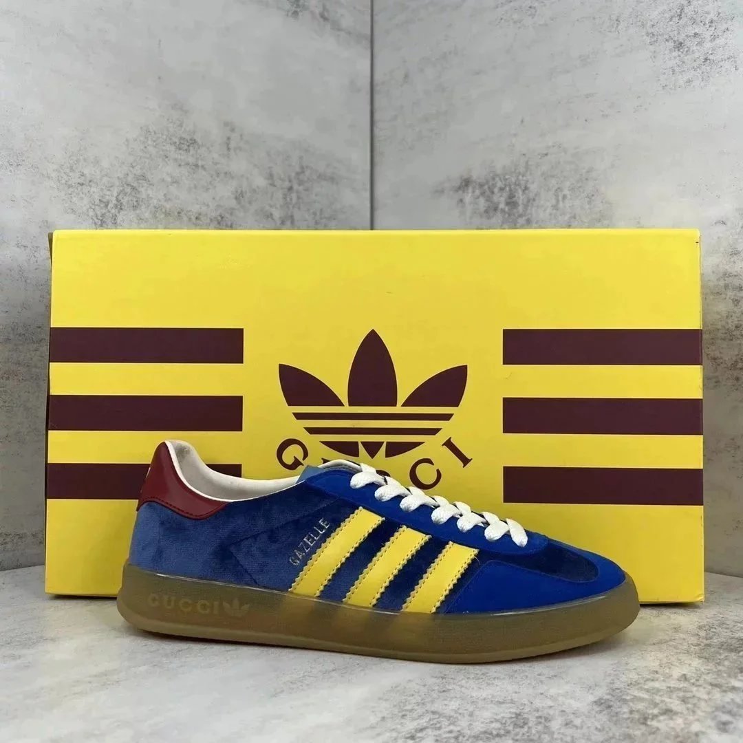 Luxury purple suede Gucci Gazelle sneaker featuring white stripes and a gum sole. Styled with iconic branding for high-end streetwear.