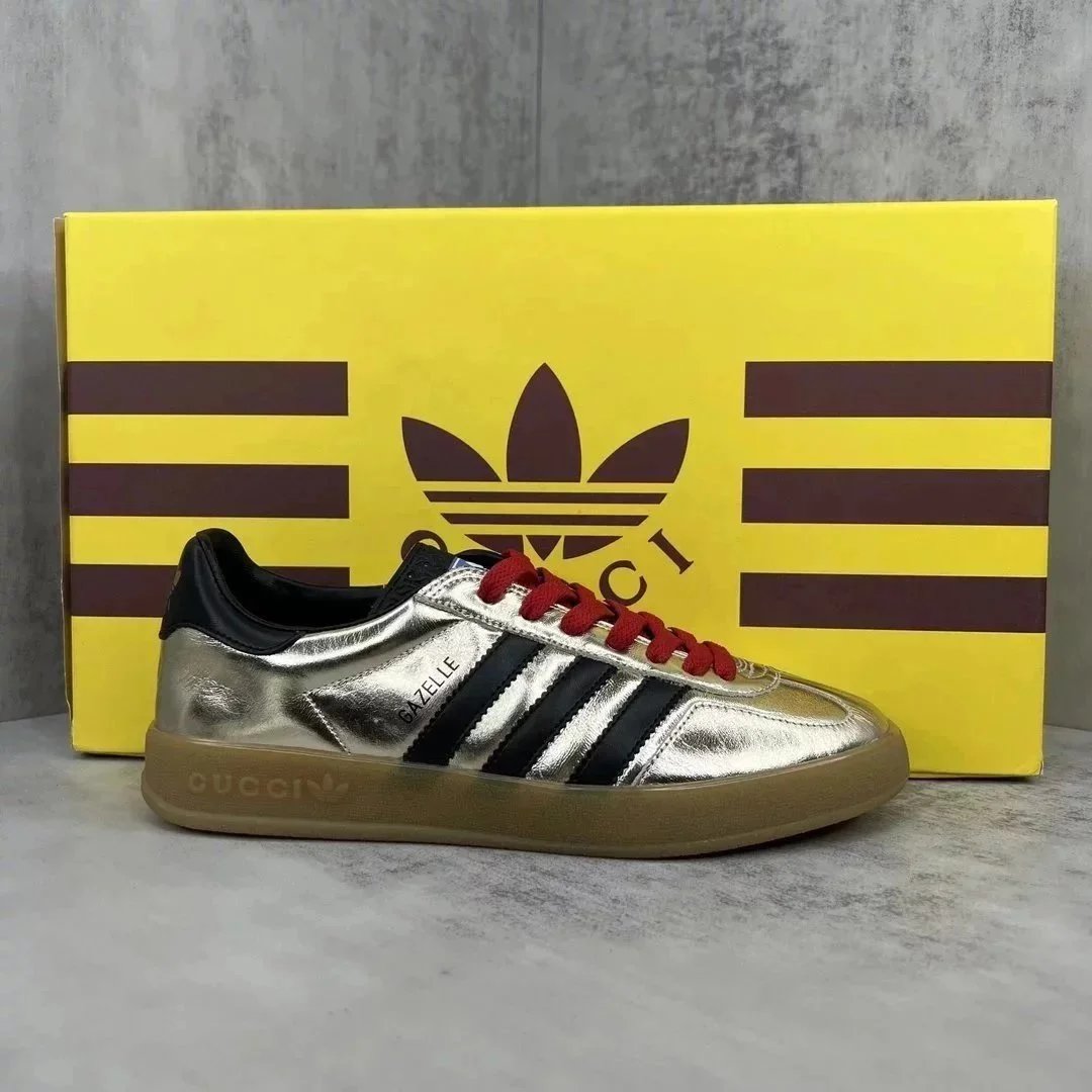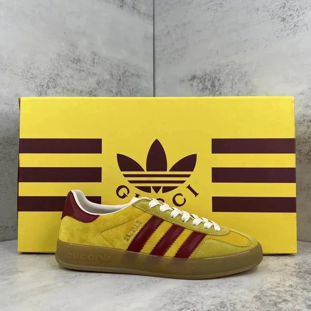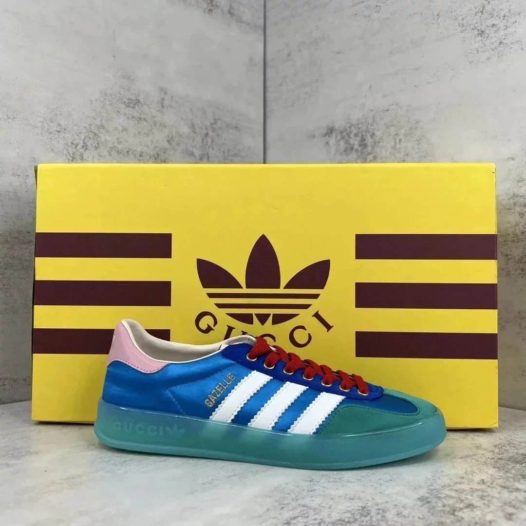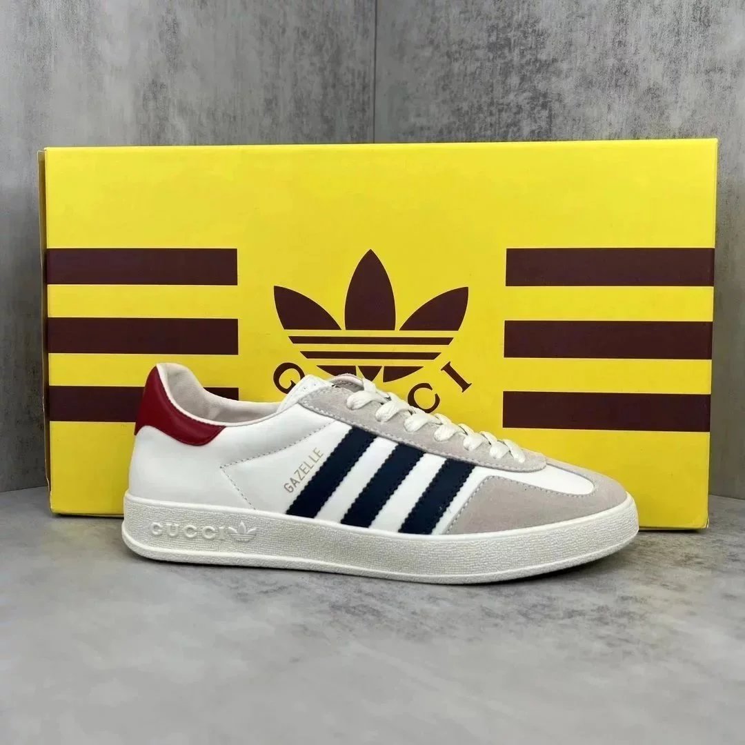 Luxury purple suede Gucci Gazelle sneaker featuring white stripes and a gum sole. Styled with iconic branding for high-end streetwear.