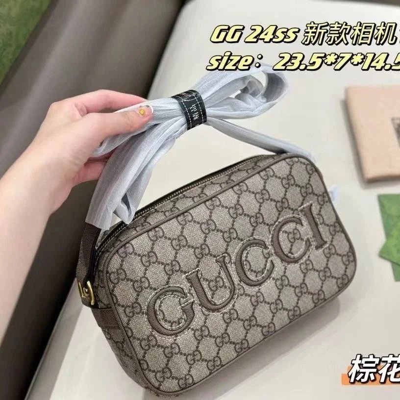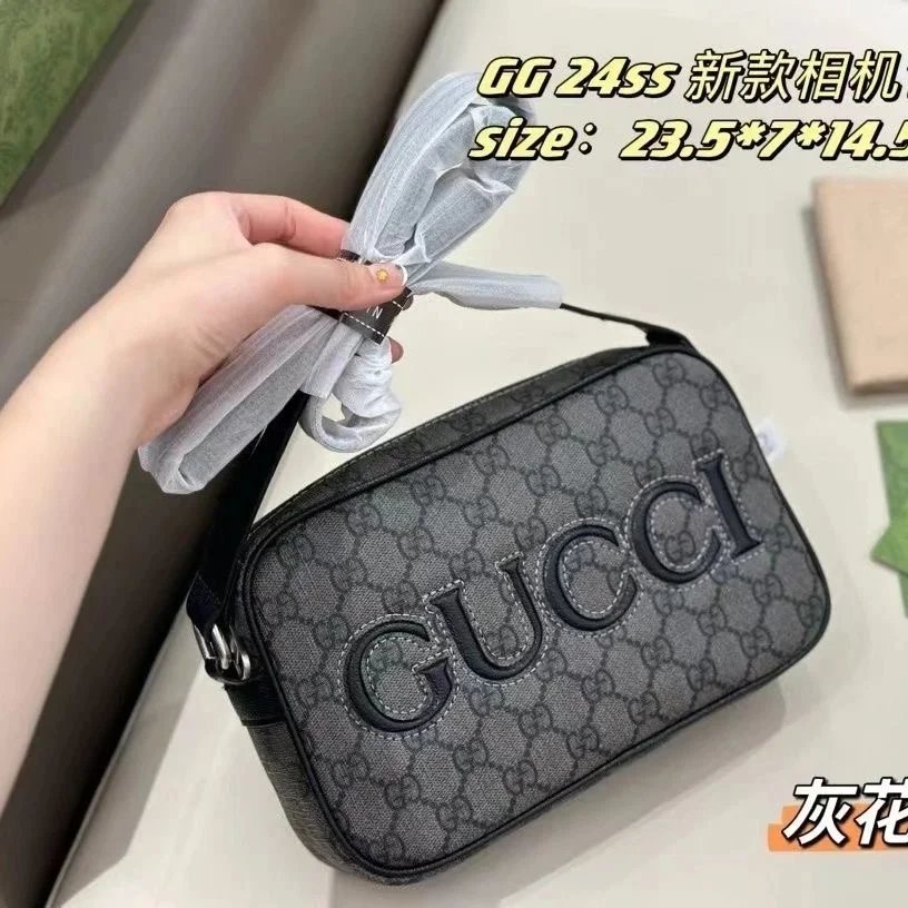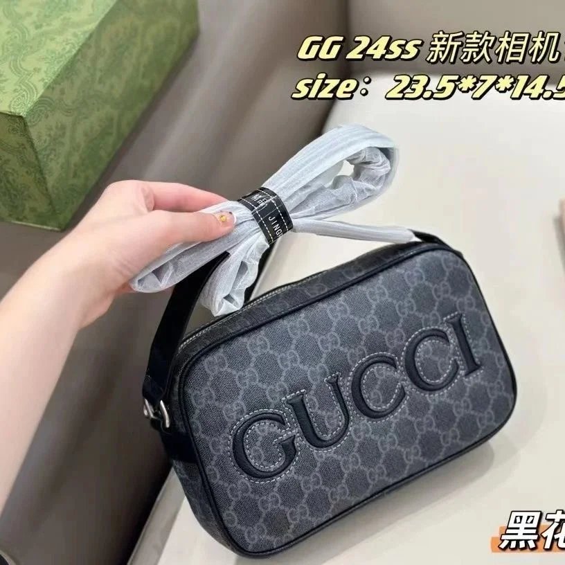 Stylish Gucci GG 24SS camera bag in black textured leather with bold embossed logo. Perfect for everyday use with a sleek, modern design.