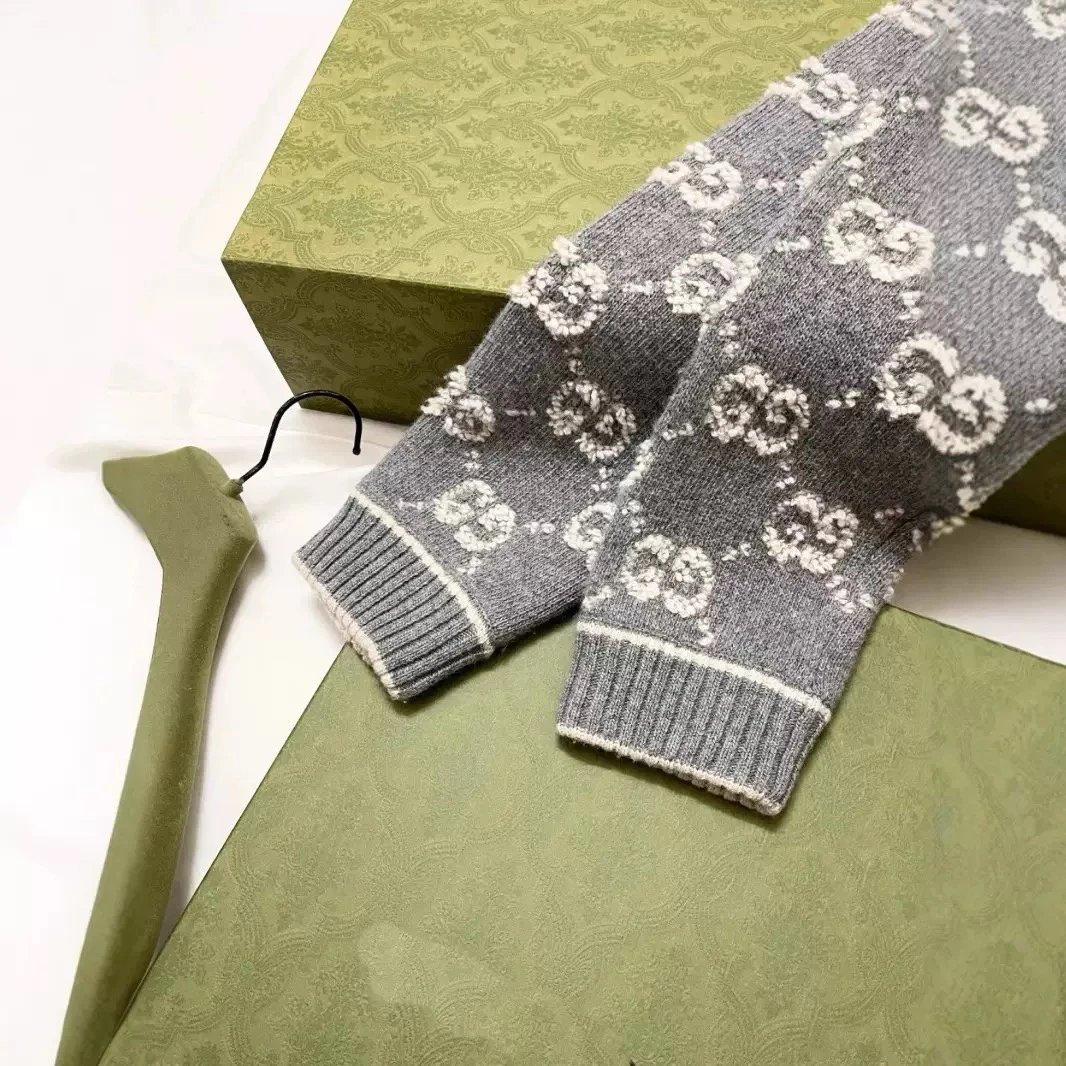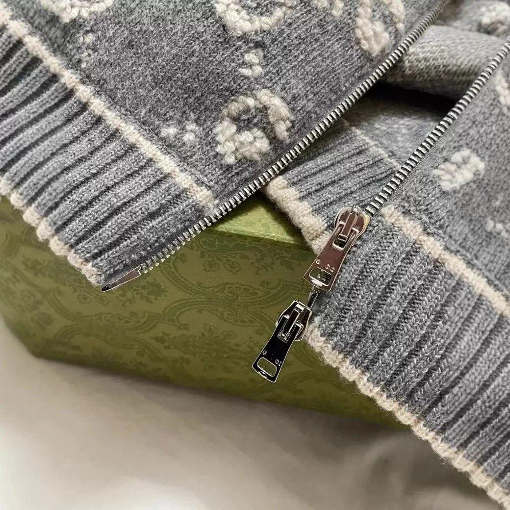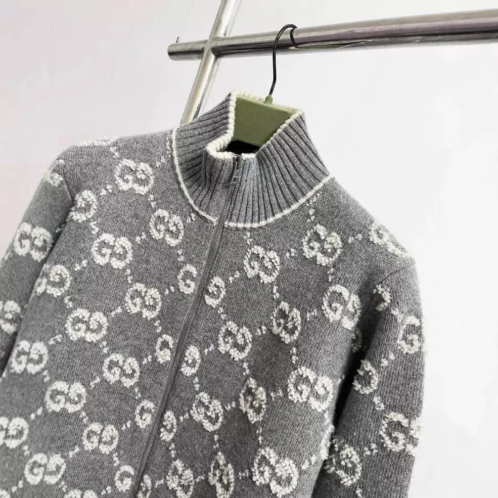 Stylish Gucci GG logo knit zip-up jacket in gray with white monogram pattern. Premium knit design featuring a stand collar and front zipper closure.