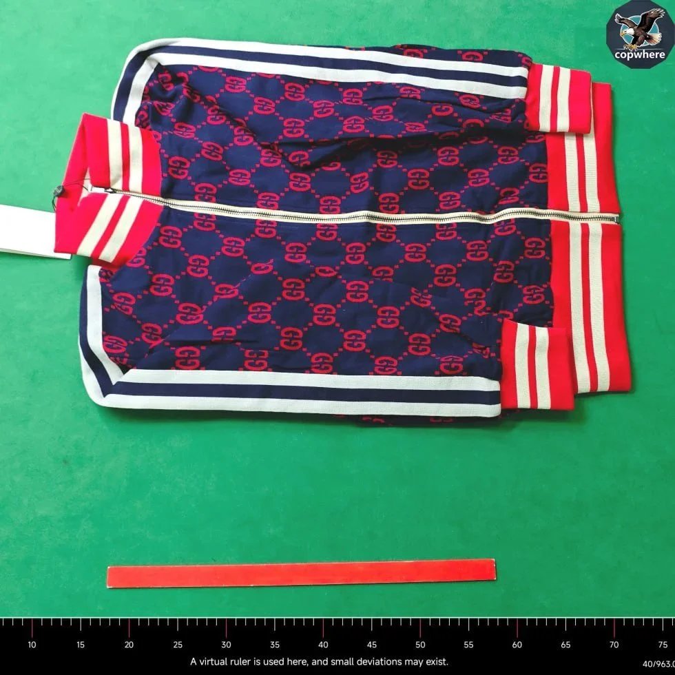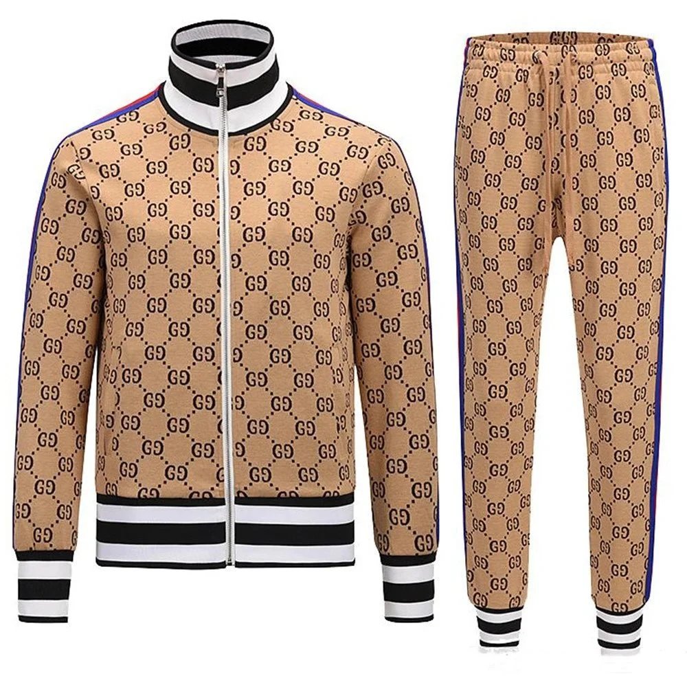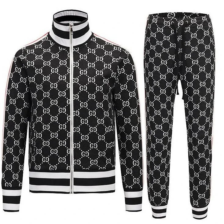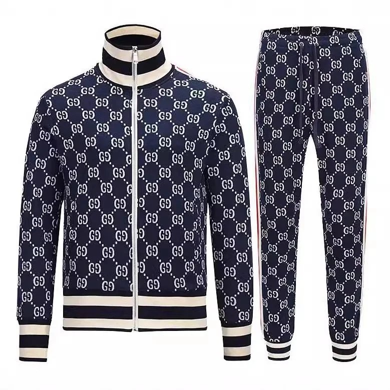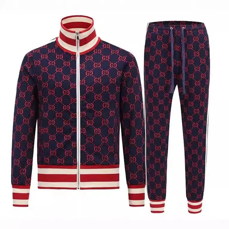Premium Gucci kids' track suit featuring the iconic GG monogram in bold red on navy fabric. Includes matching jacket and shorts with striped trim for a stylish athletic look.