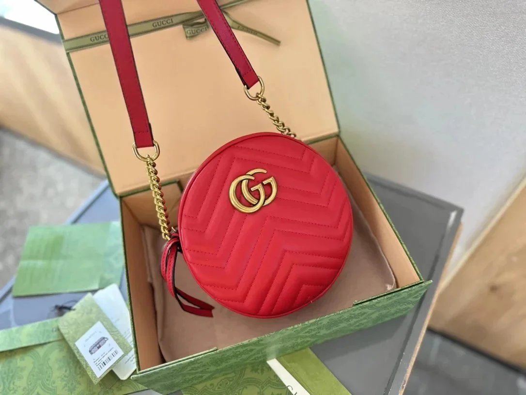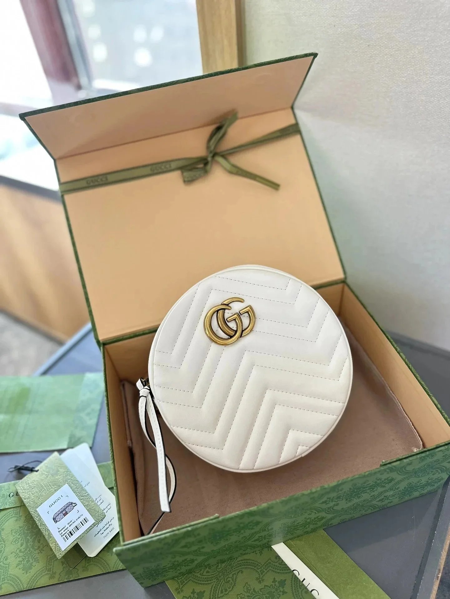 Elegant black Gucci GG Marmont circle bag featuring signature quilted chevron stitching and a gold-tone interlocking G logo. Perfect for evening events or as a stylish accessory.
