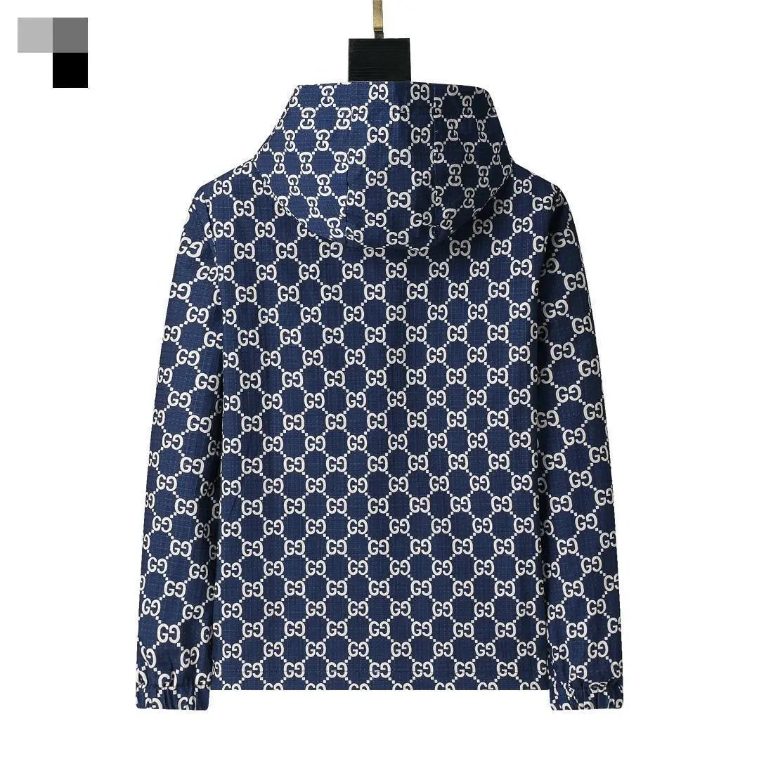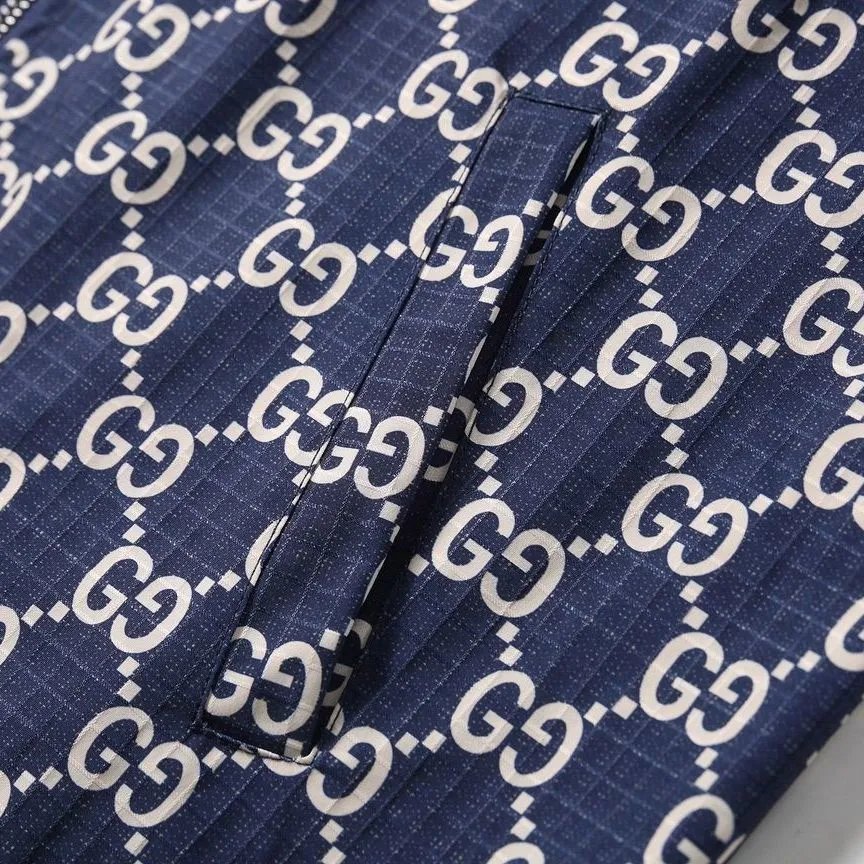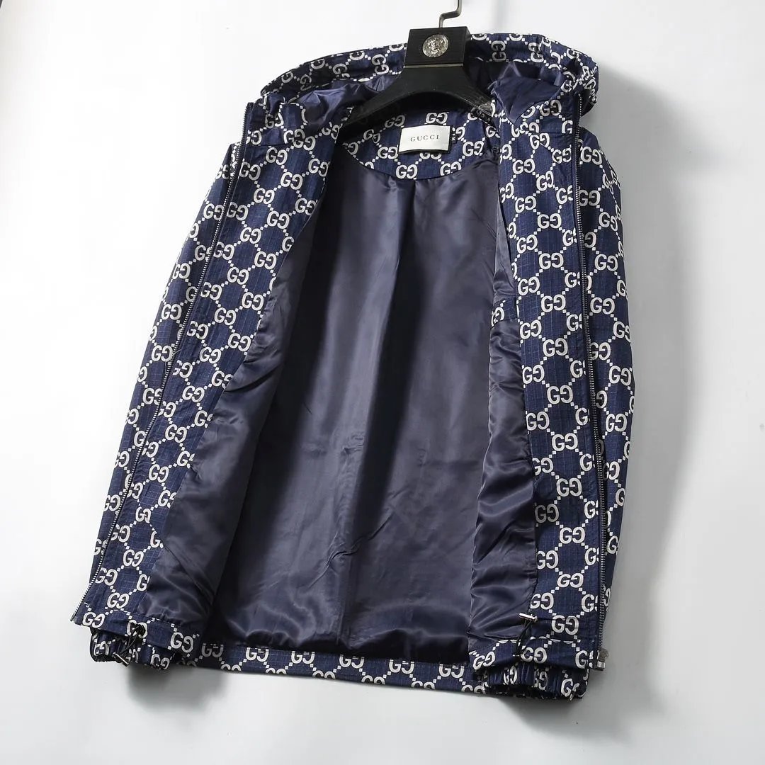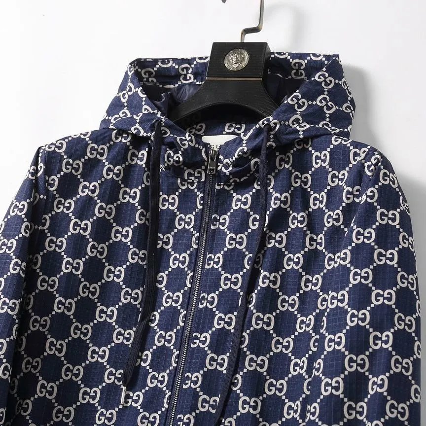 Stylish Gucci hooded jacket featuring the iconic GG monogram pattern in navy blue and white. Perfect for a bold fashion statement with premium quality.