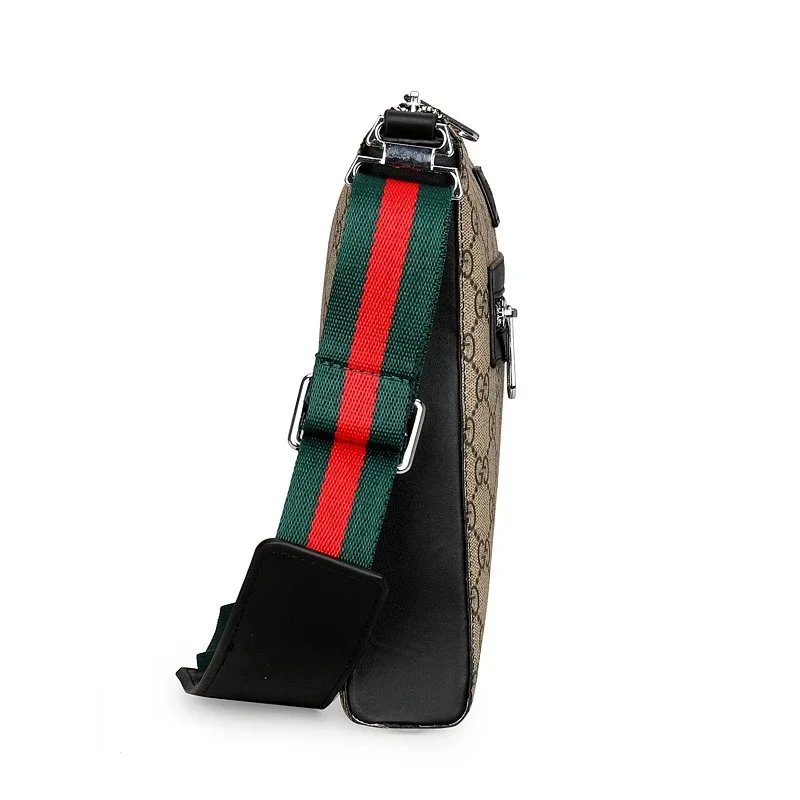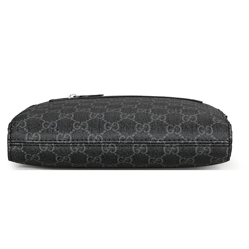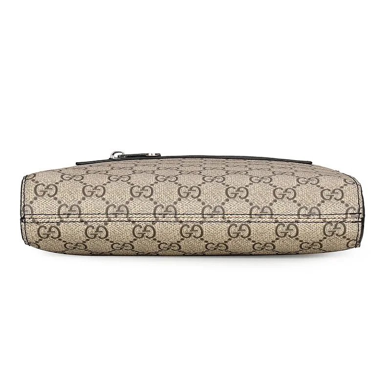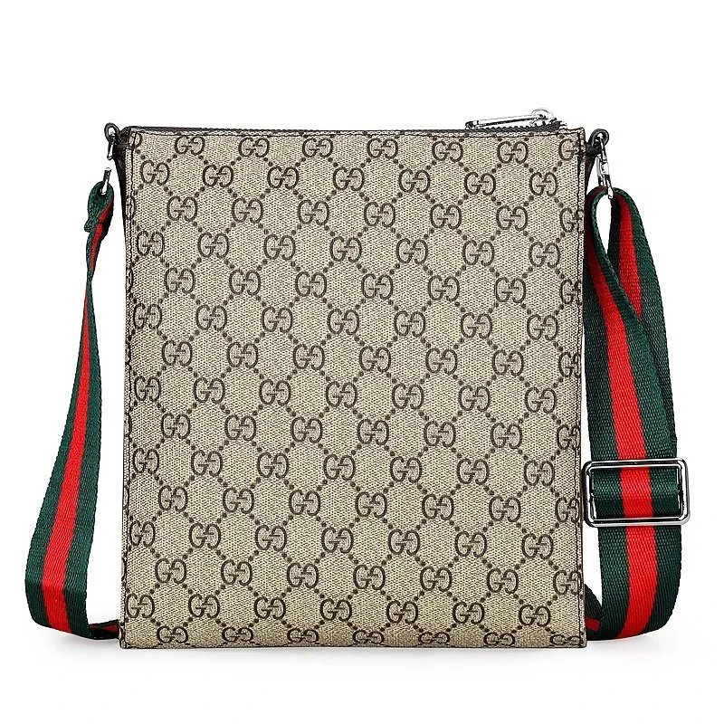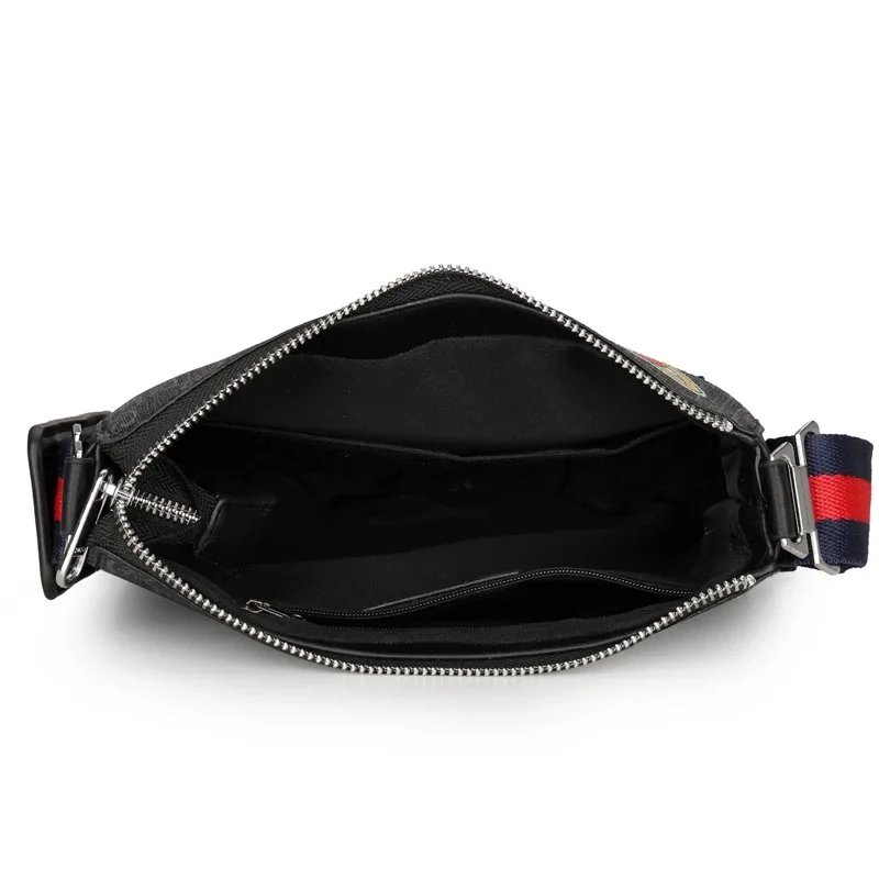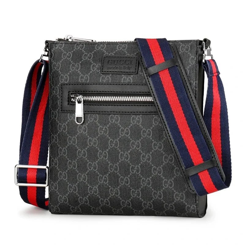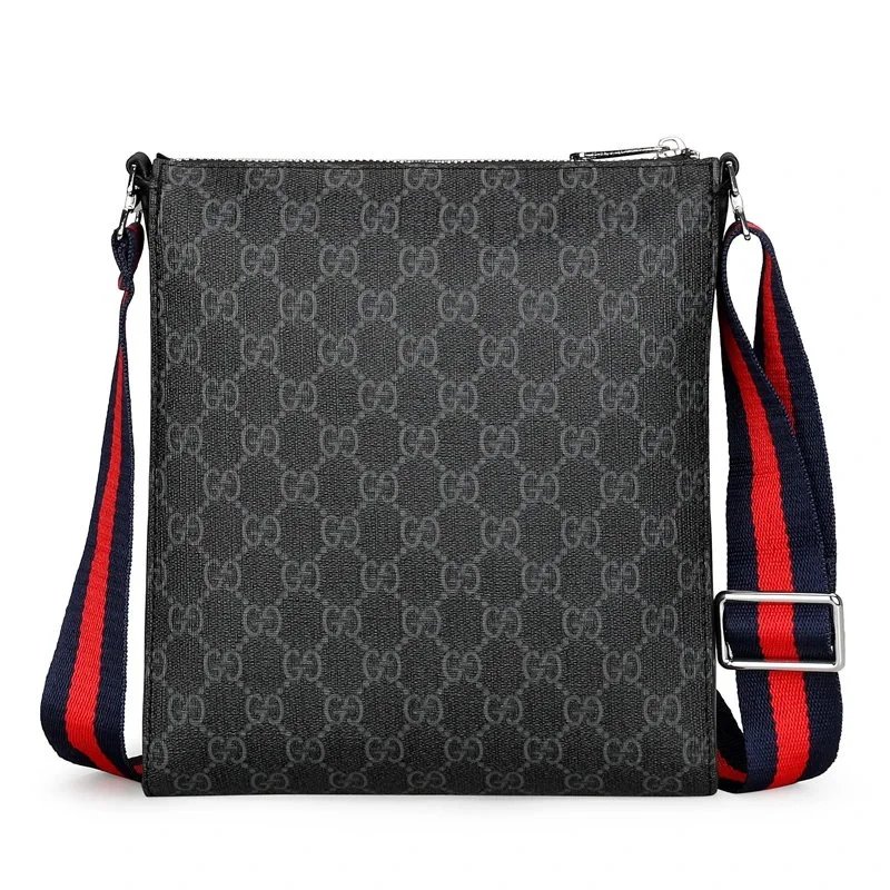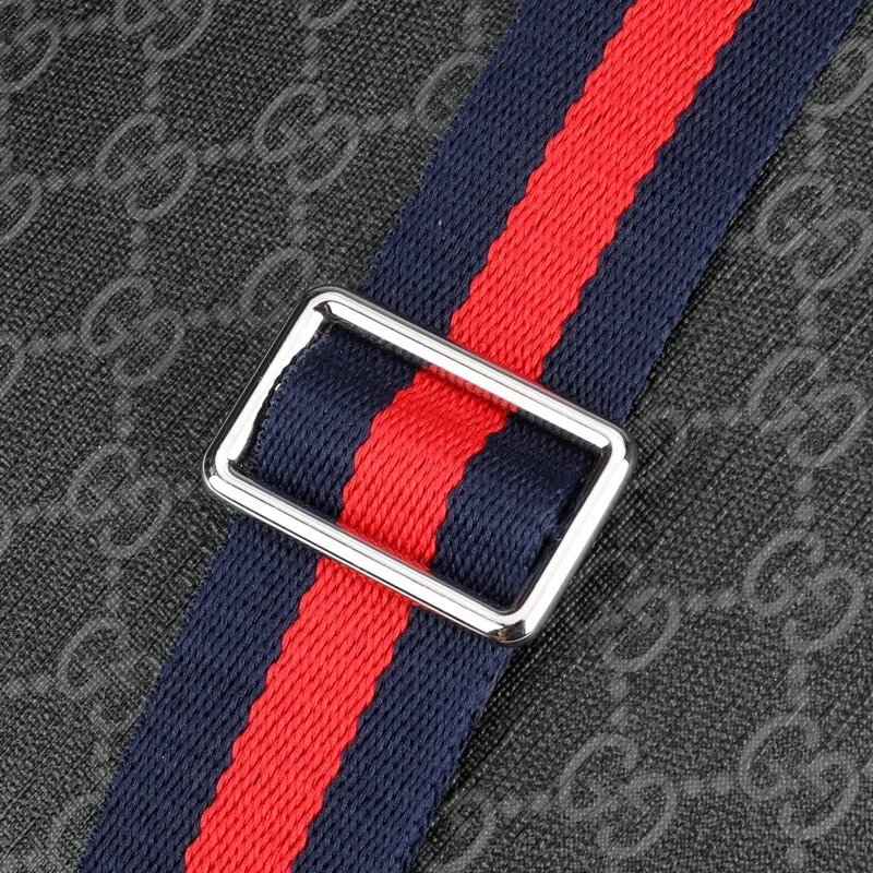 Stylish Gucci GG Supreme crossbody bag in black with signature monogram print and red-blue web strap. Crafted in Italy with a front zip pocket and premium detailing.