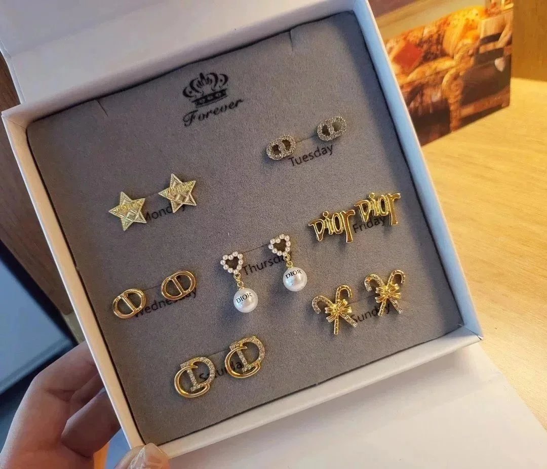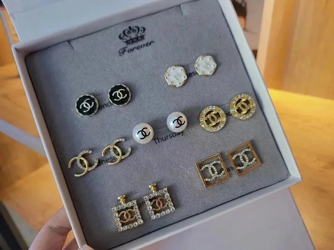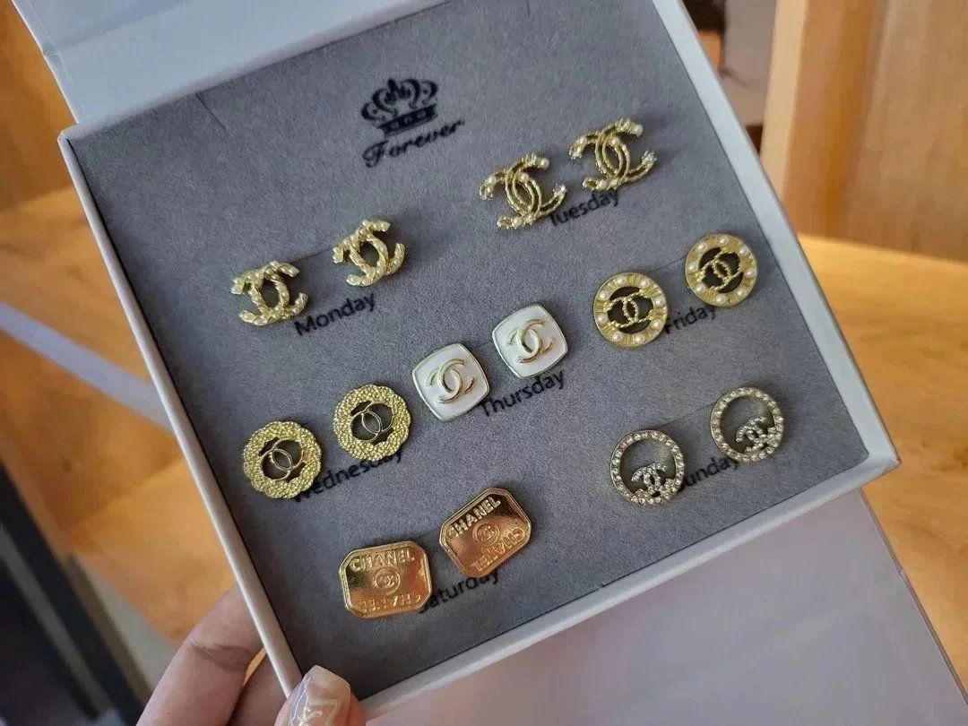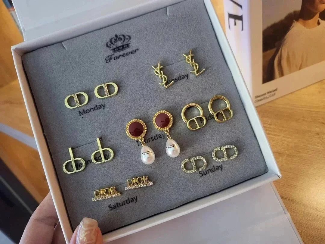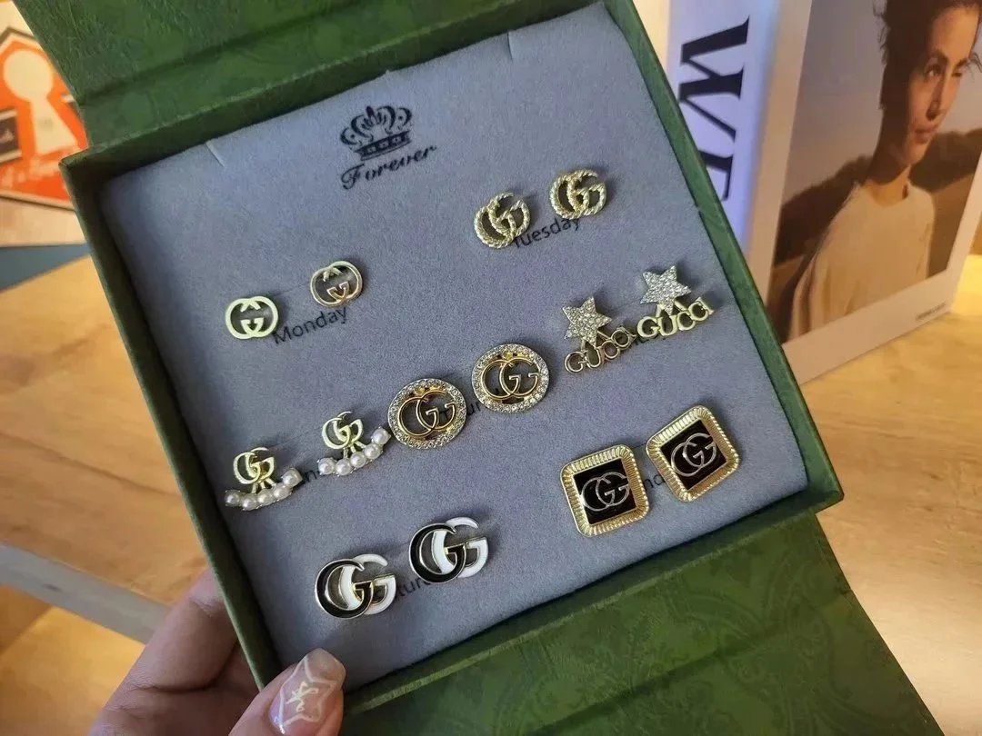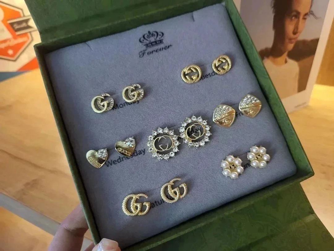 Elevate your style with this exquisite Gucci earrings set featuring gold-tone studs, sparkling crystals, pearls, and iconic double-G logos. Perfect for adding a touch of luxury to any outfit.