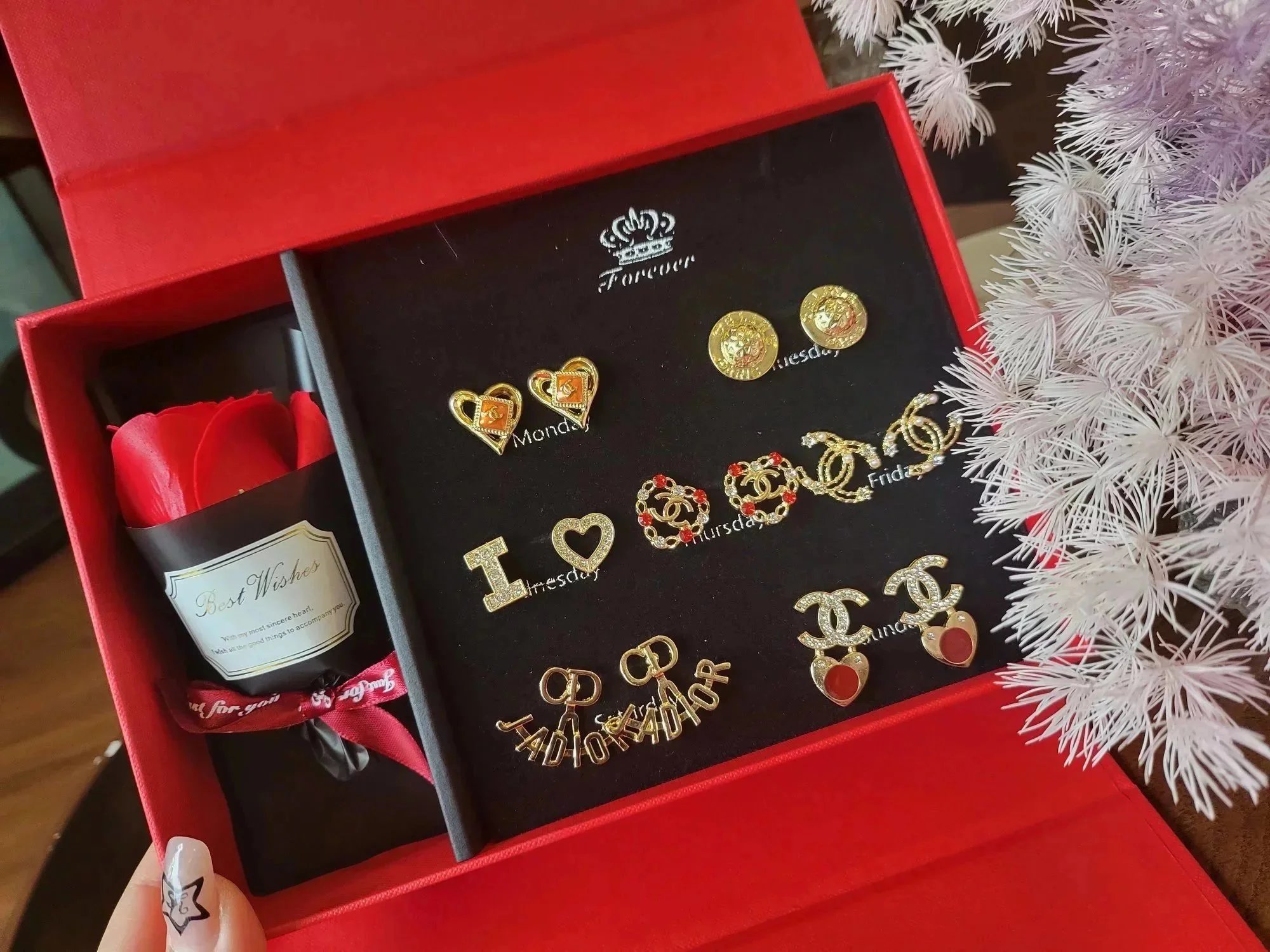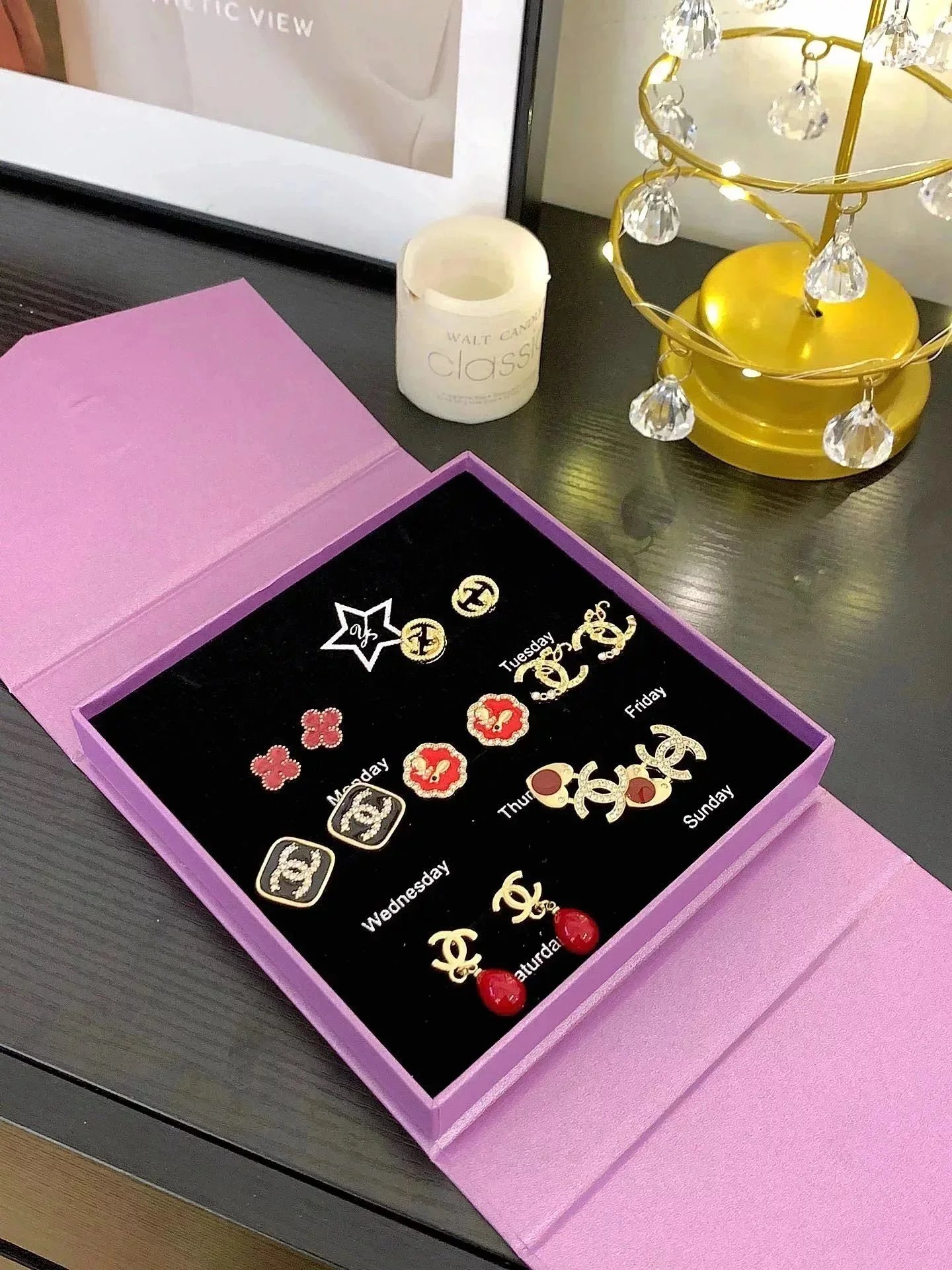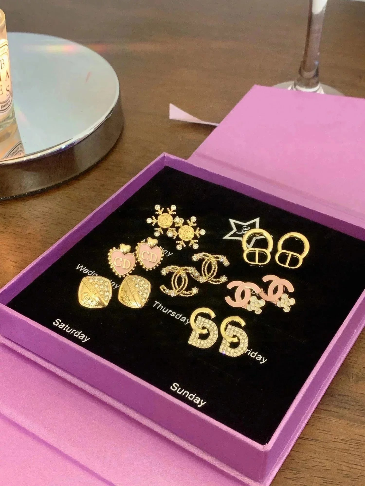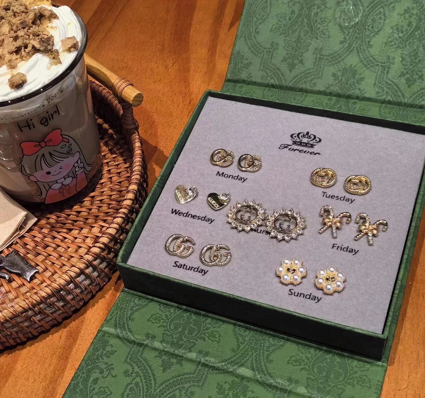 Elevate your style with this exquisite Gucci earrings set featuring gold-tone studs, sparkling crystals, pearls, and iconic double-G logos. Perfect for adding a touch of luxury to any outfit.