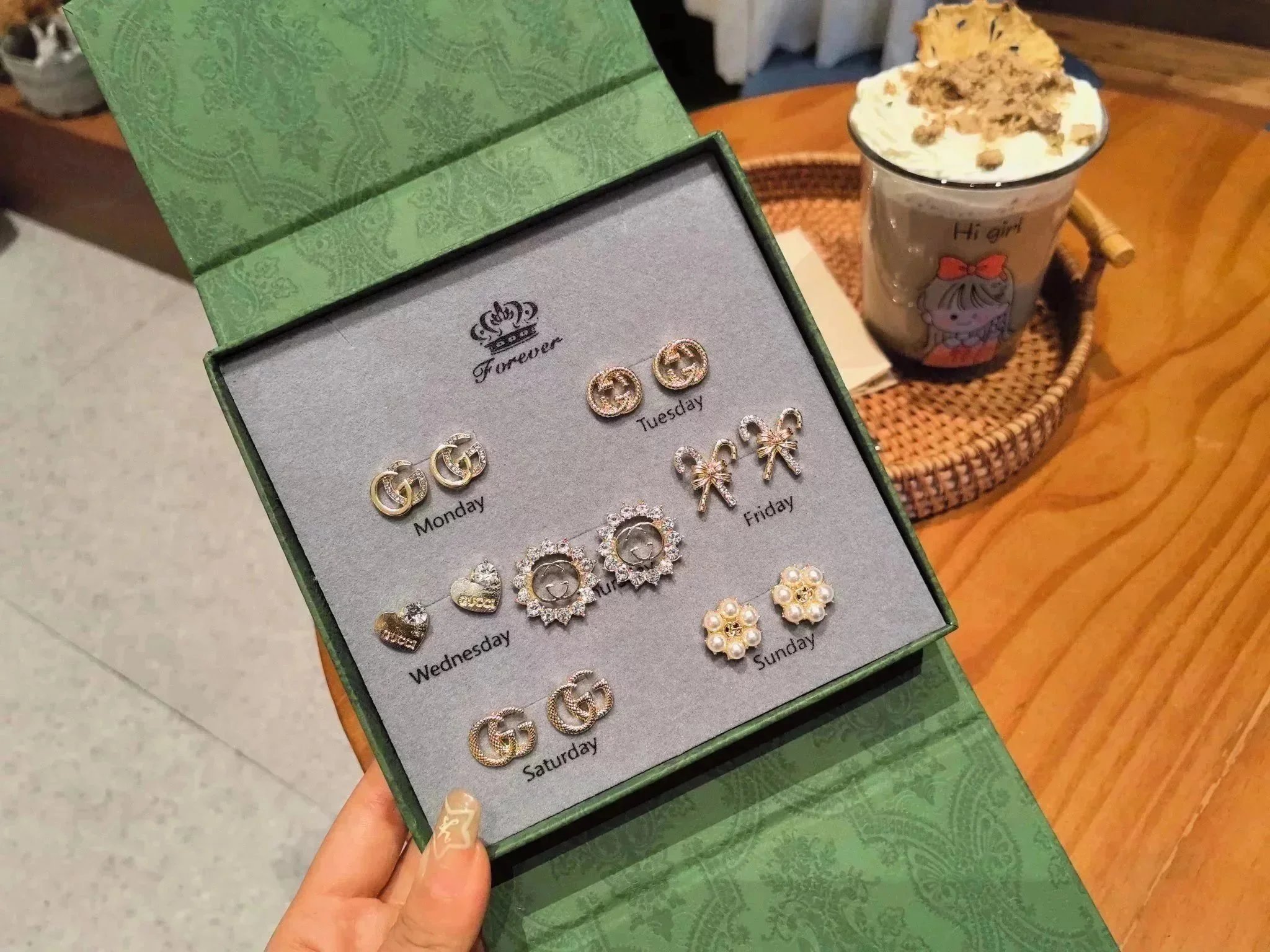 Elegant Gucci gold-tone earrings featuring pearls, crystals, and signature GG motifs displayed on a branded green box. Perfect for luxury accessory enthusiasts.