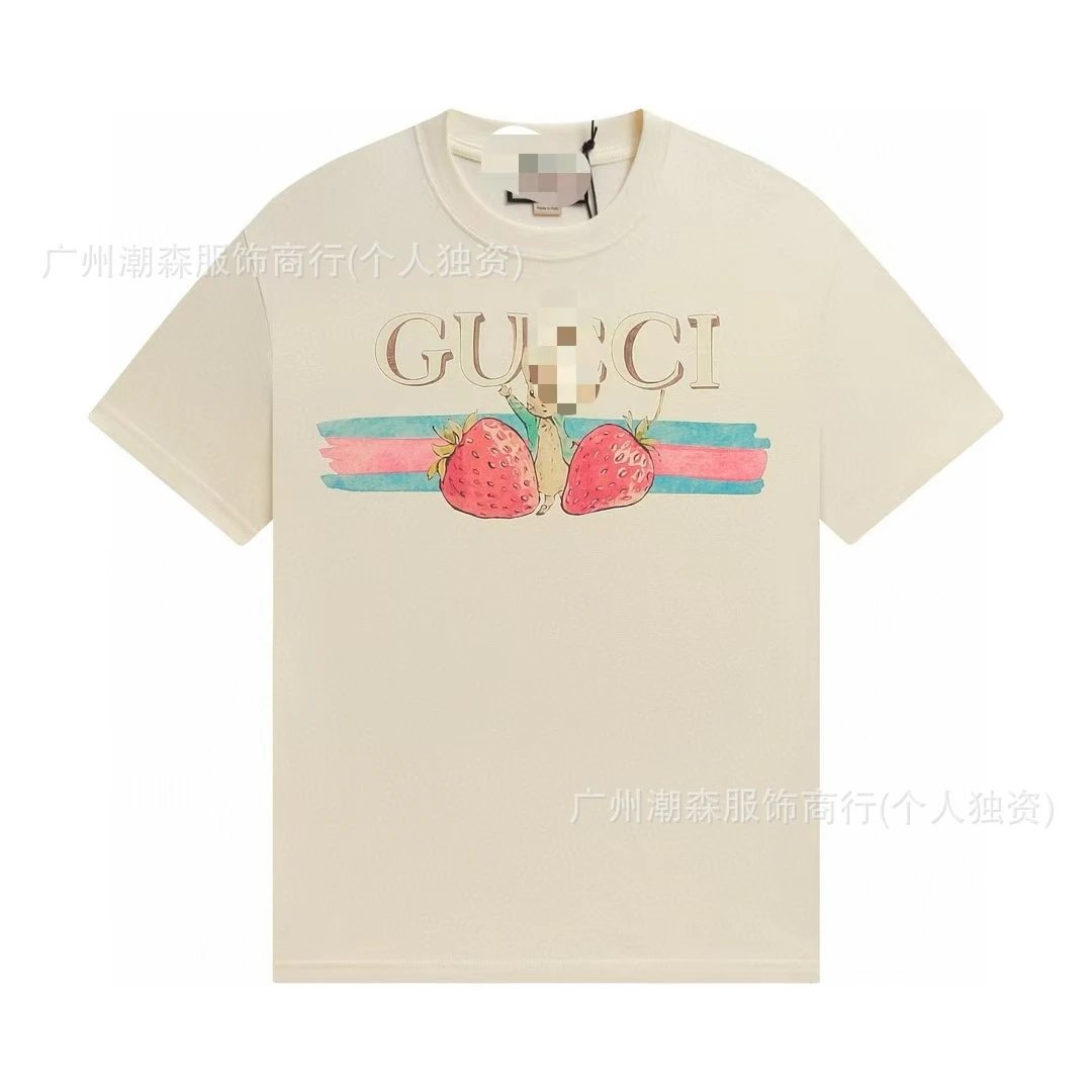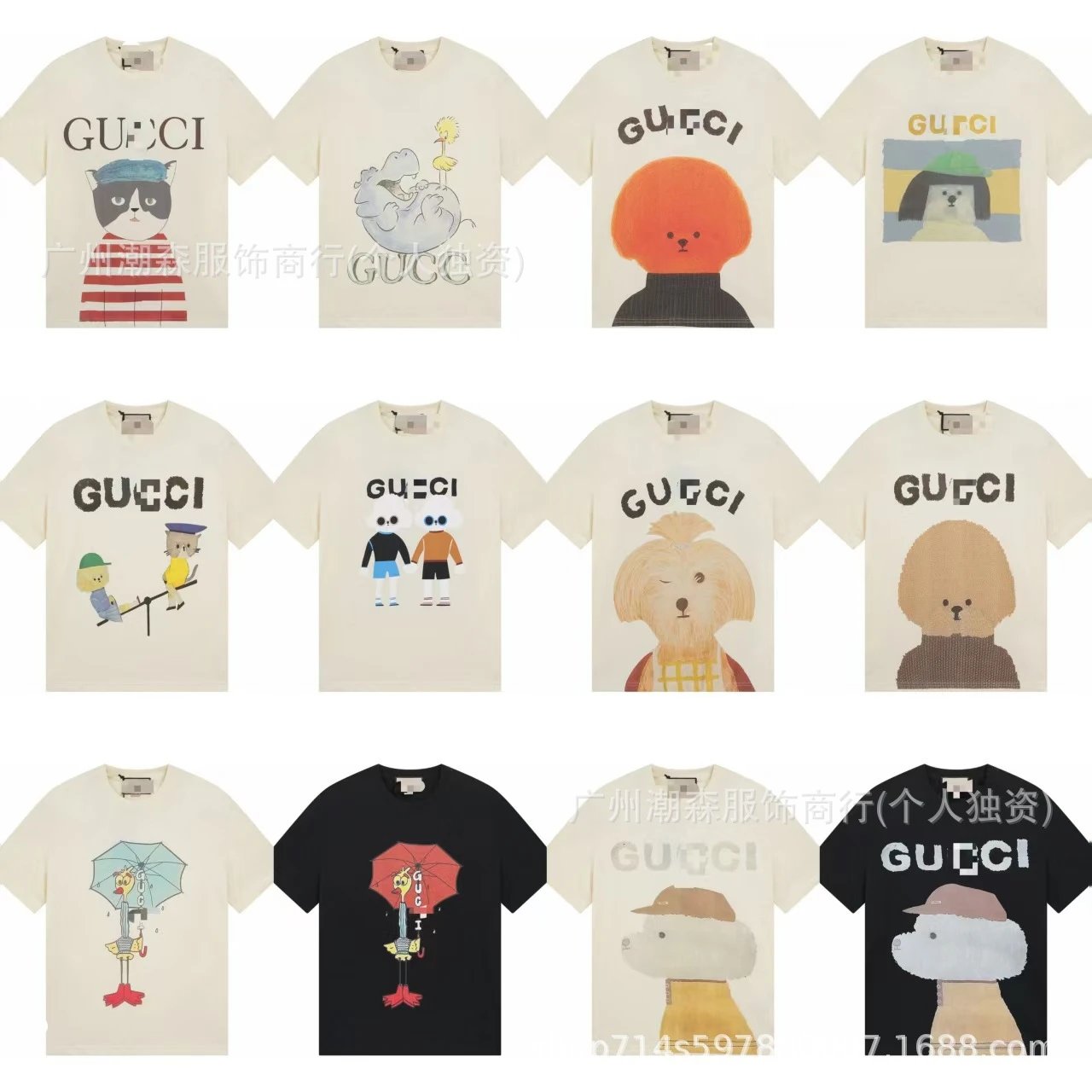 Gucci kids' T-shirts featuring playful animal and fruit graphics with iconic Gucci branding. Available in cream and black colors with unique illustrated designs.