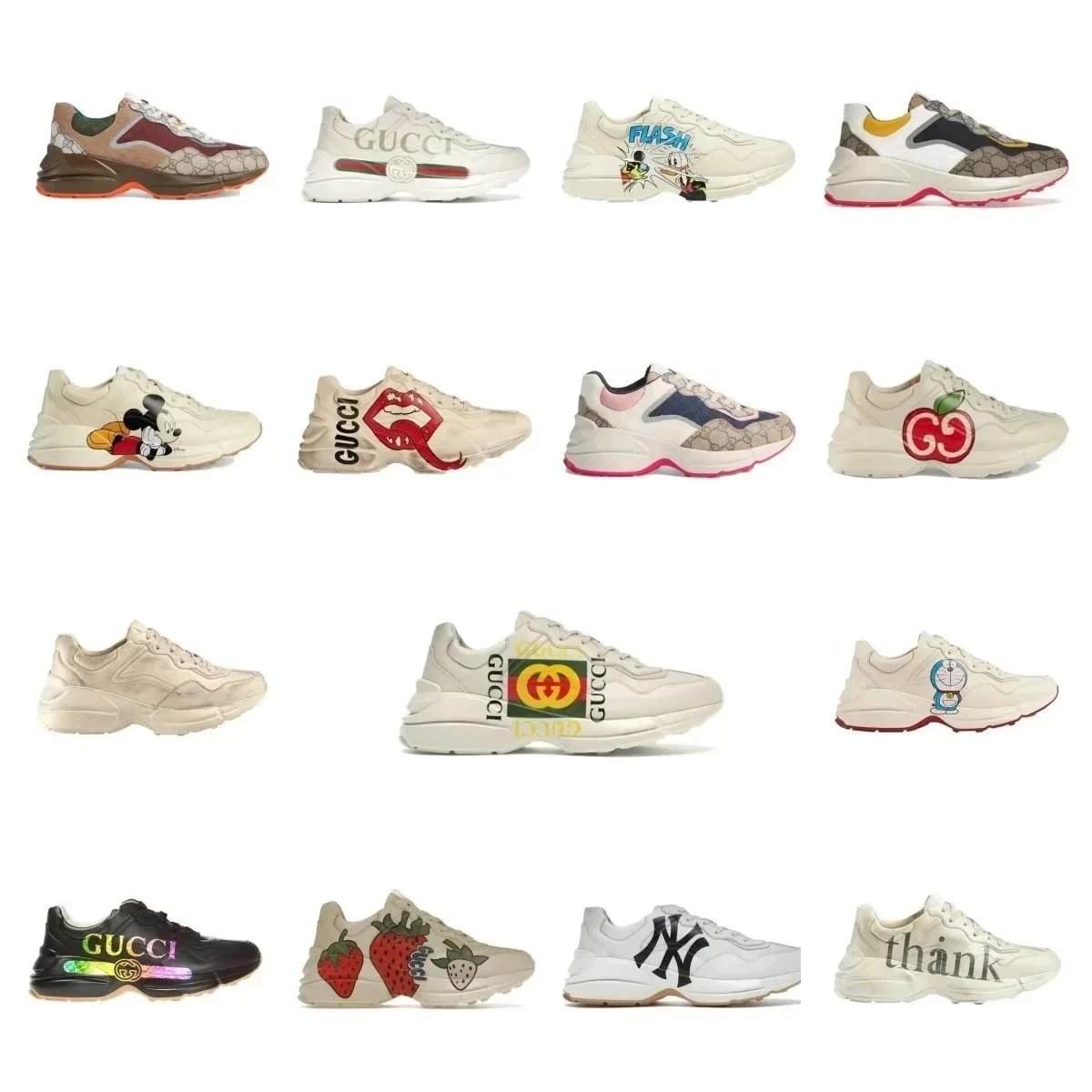 Discover Gucci's iconic Rhyton sneakers featuring bold cartoon graphics, signature logos, and vibrant colorways for a statement streetwear look.