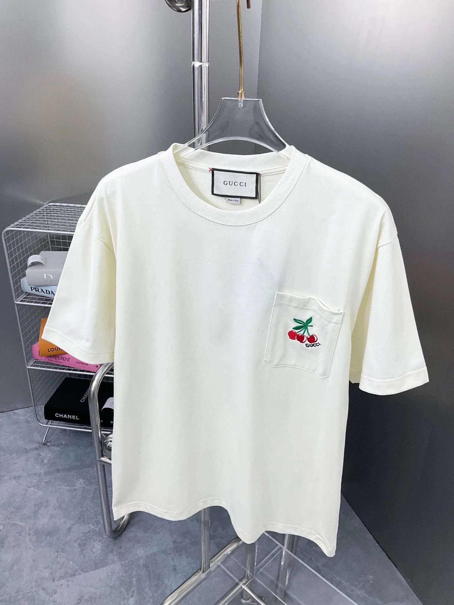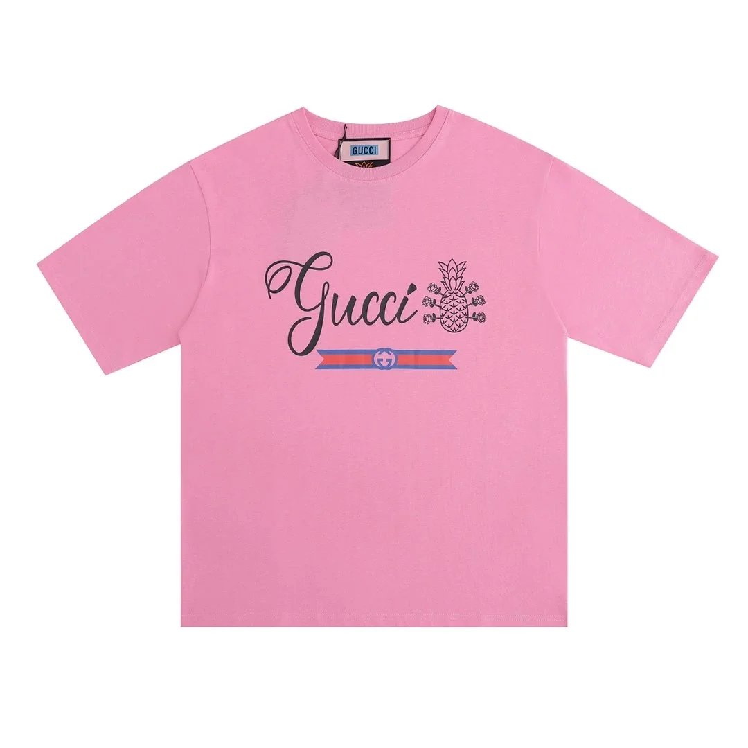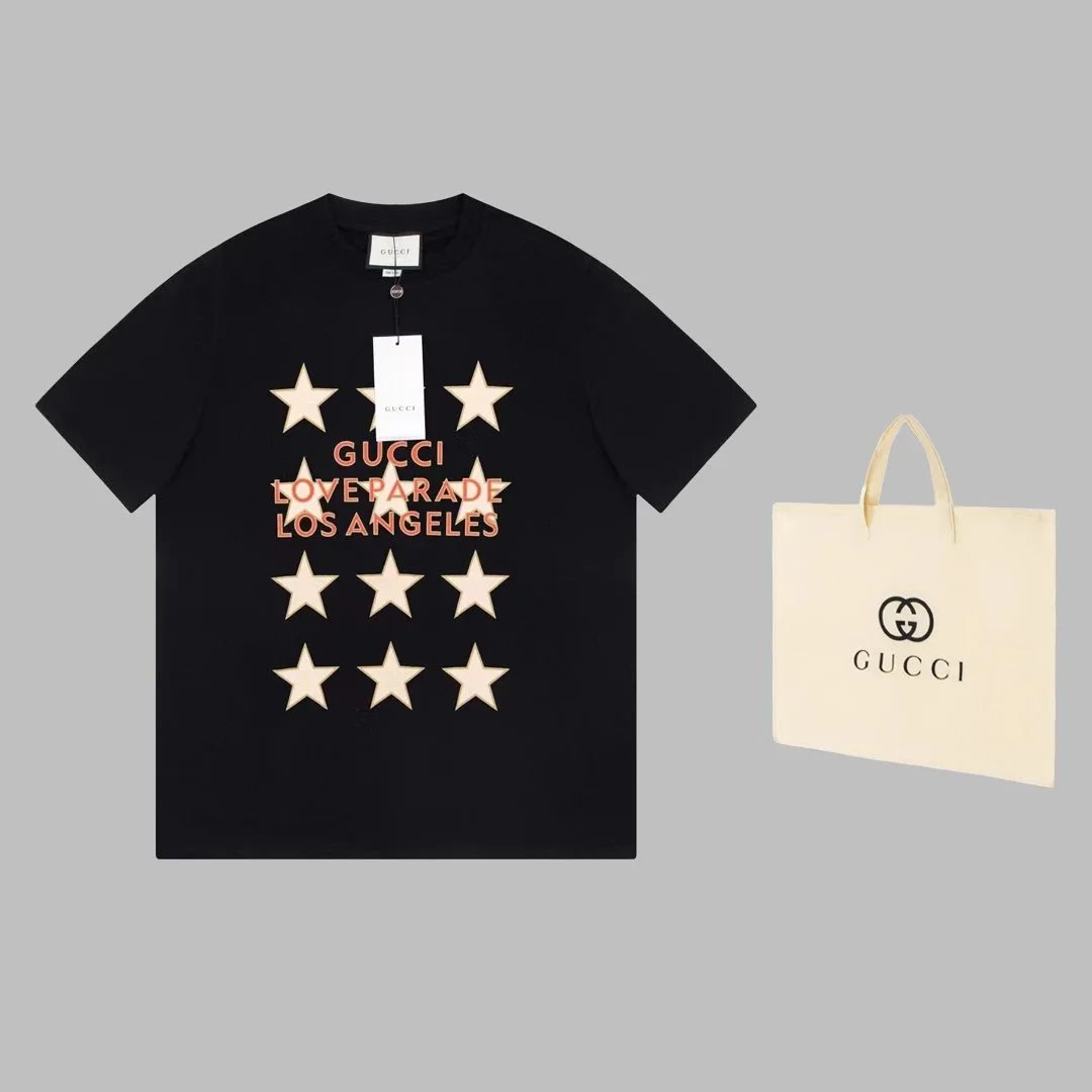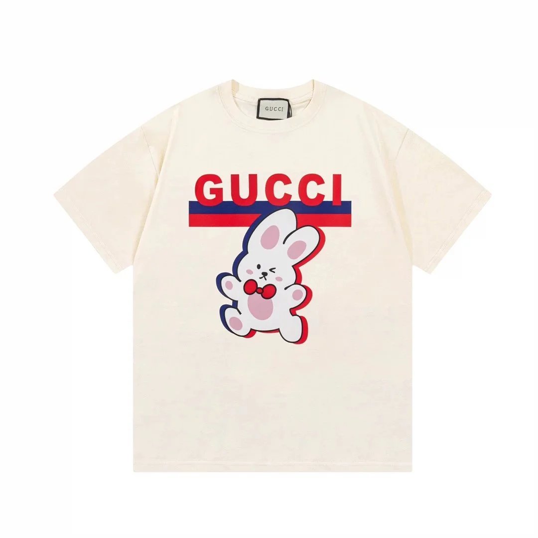 This Gucci t-shirt features a bold graphic of three corduroy bunnies in green, purple, and magenta over the iconic interlocking G logo. Made from soft cotton, it’s a statement piece blending luxury branding with playful design.