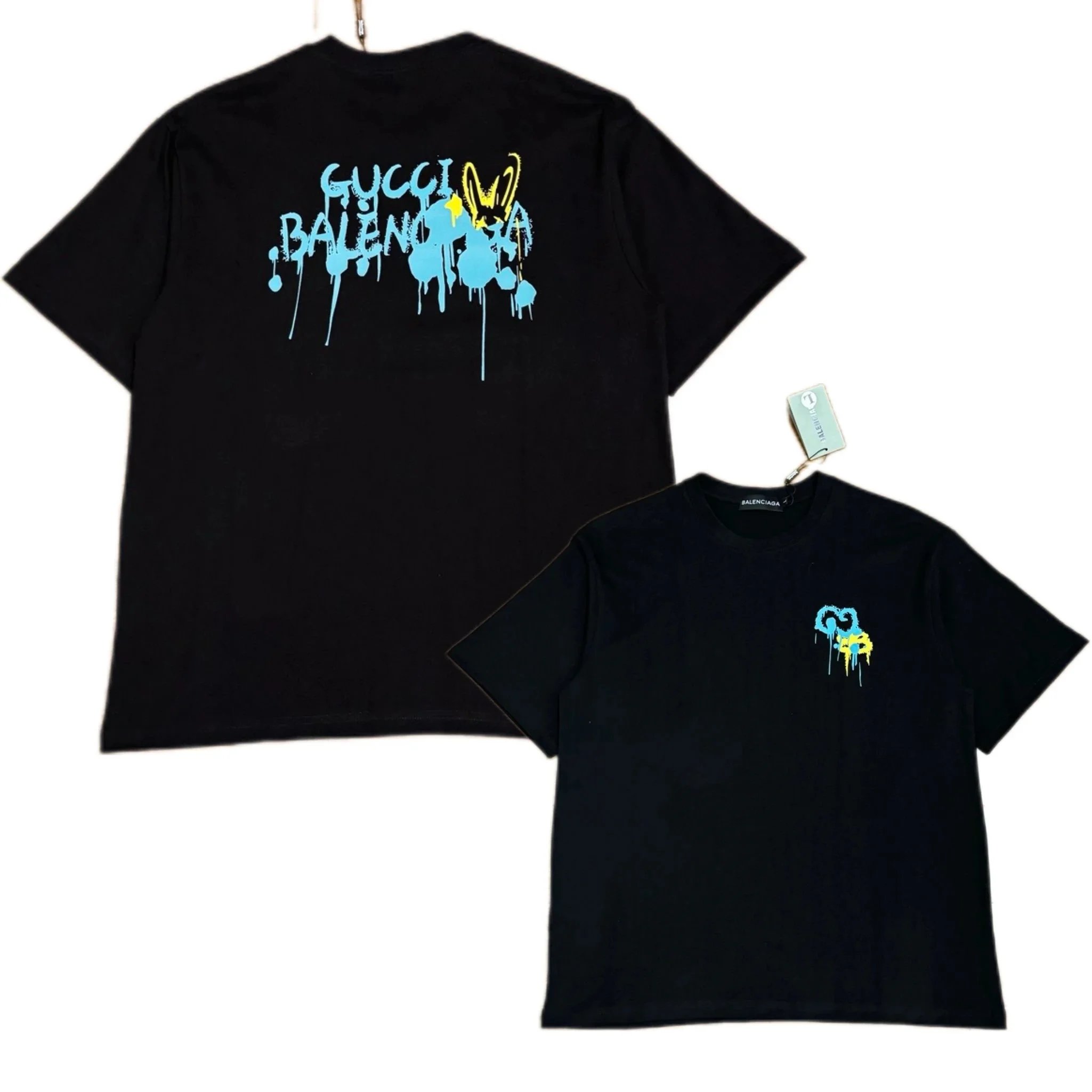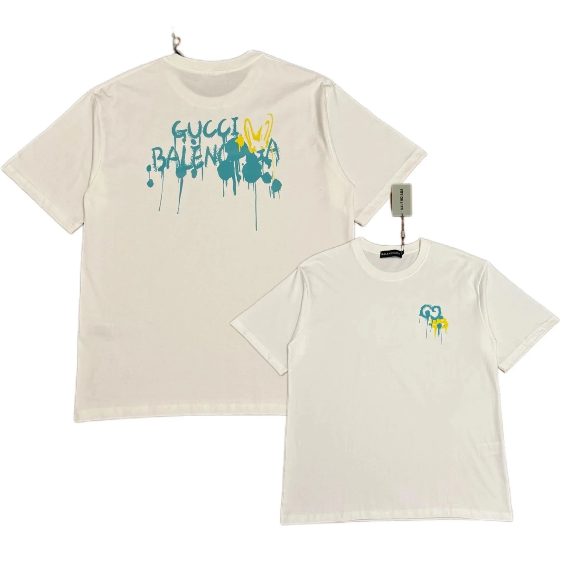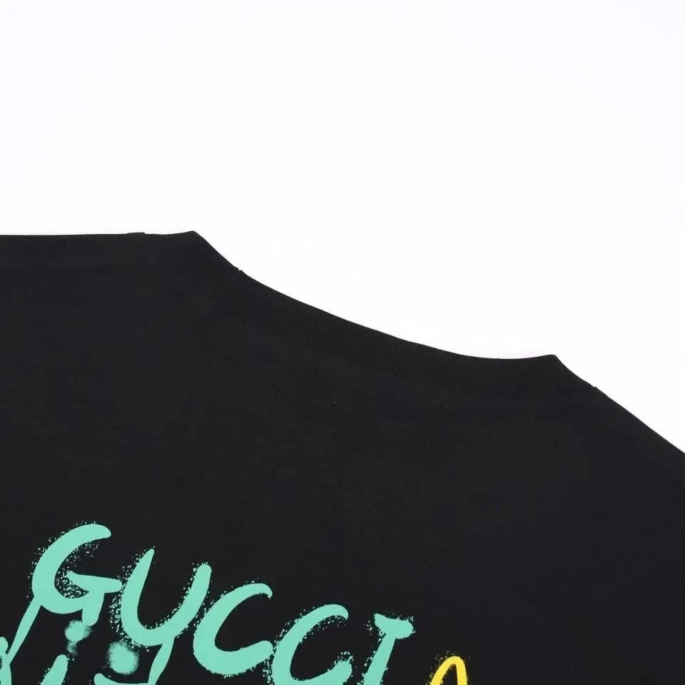 Discover a collection of Gucci t-shirts featuring bold graphics, collaborations, and unique designs including fish prints, chemical equations, and drip art. Available in black and cream colors with distinctive branding.