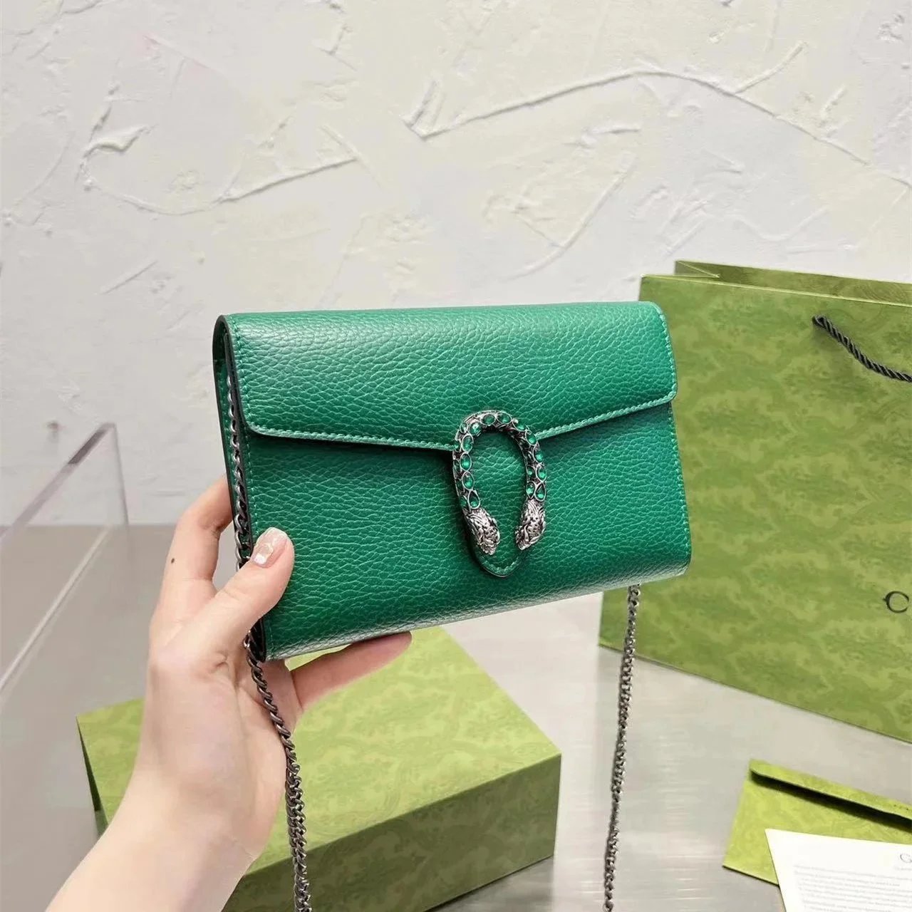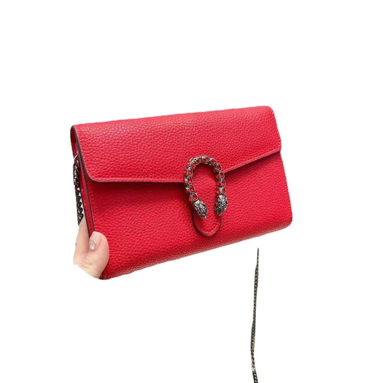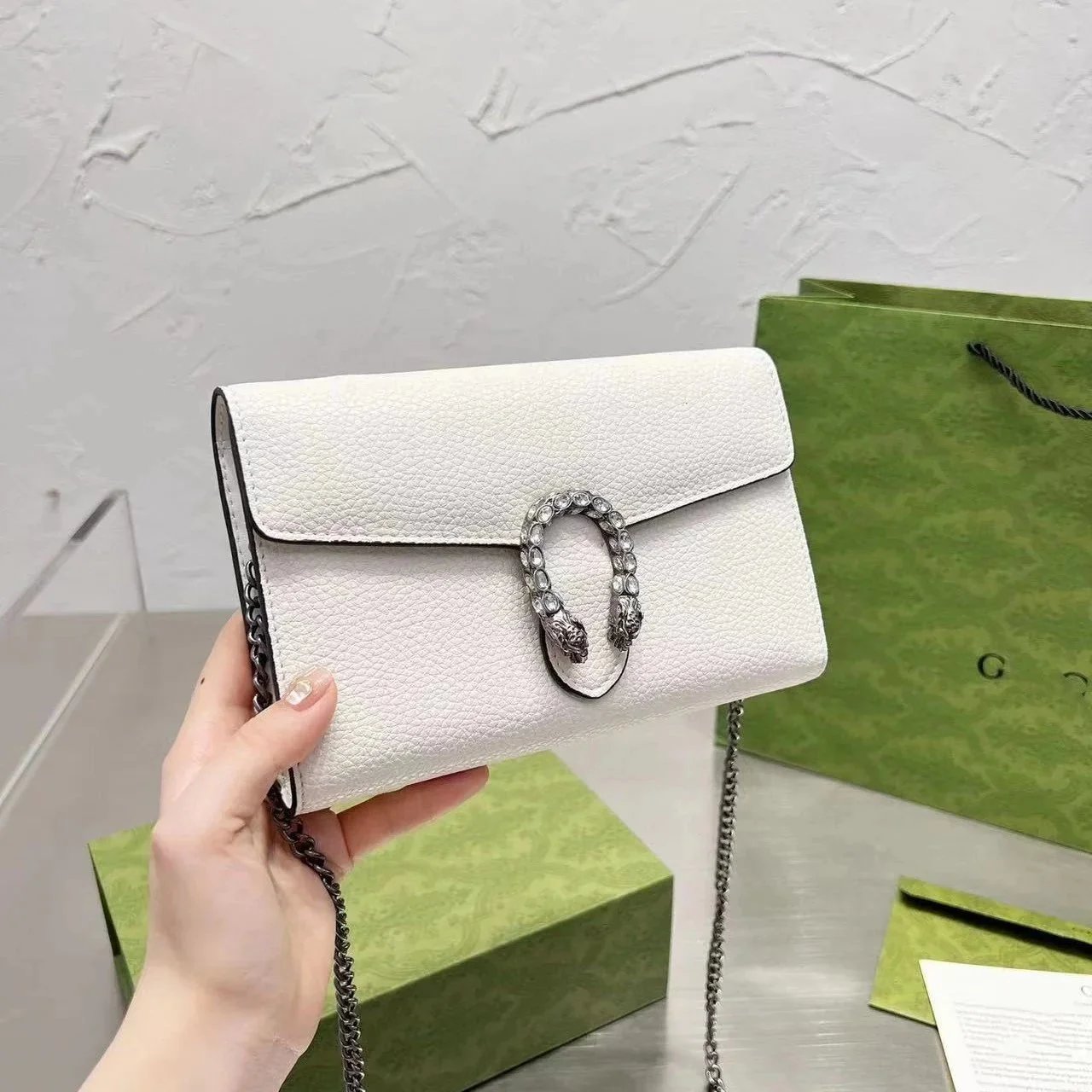 Elegant white leather Gucci crossbody bag featuring a signature snake clasp and chain strap. Perfect for adding a touch of luxury to any outfit.