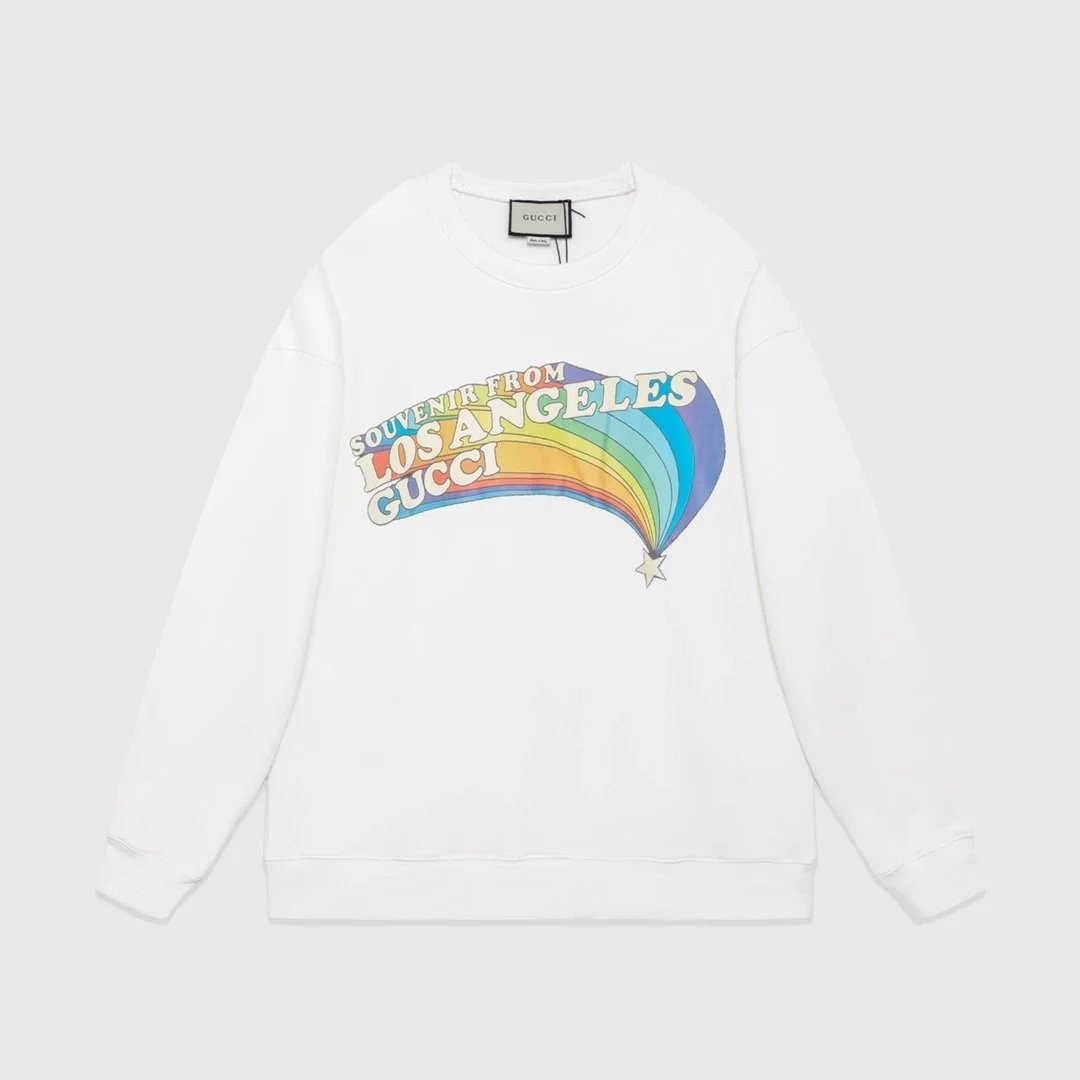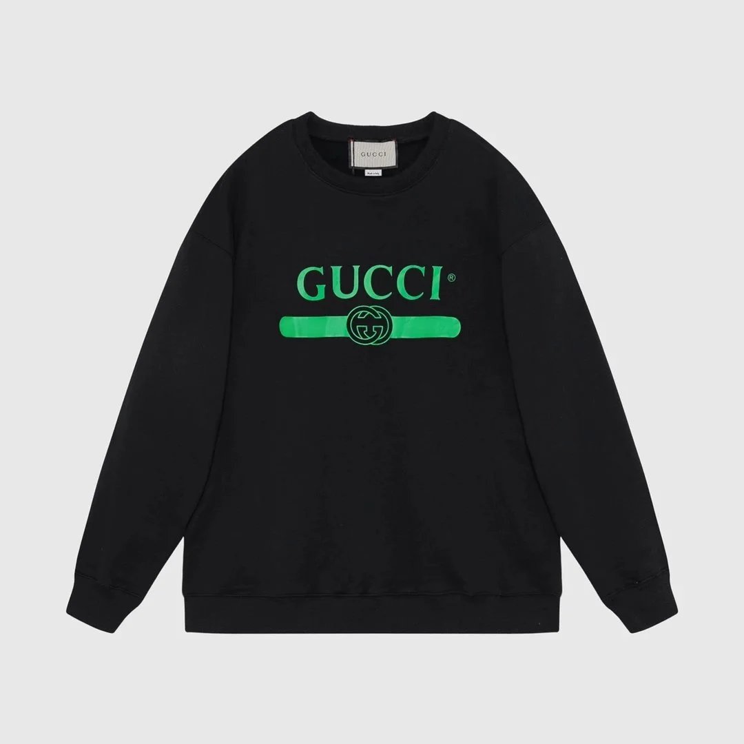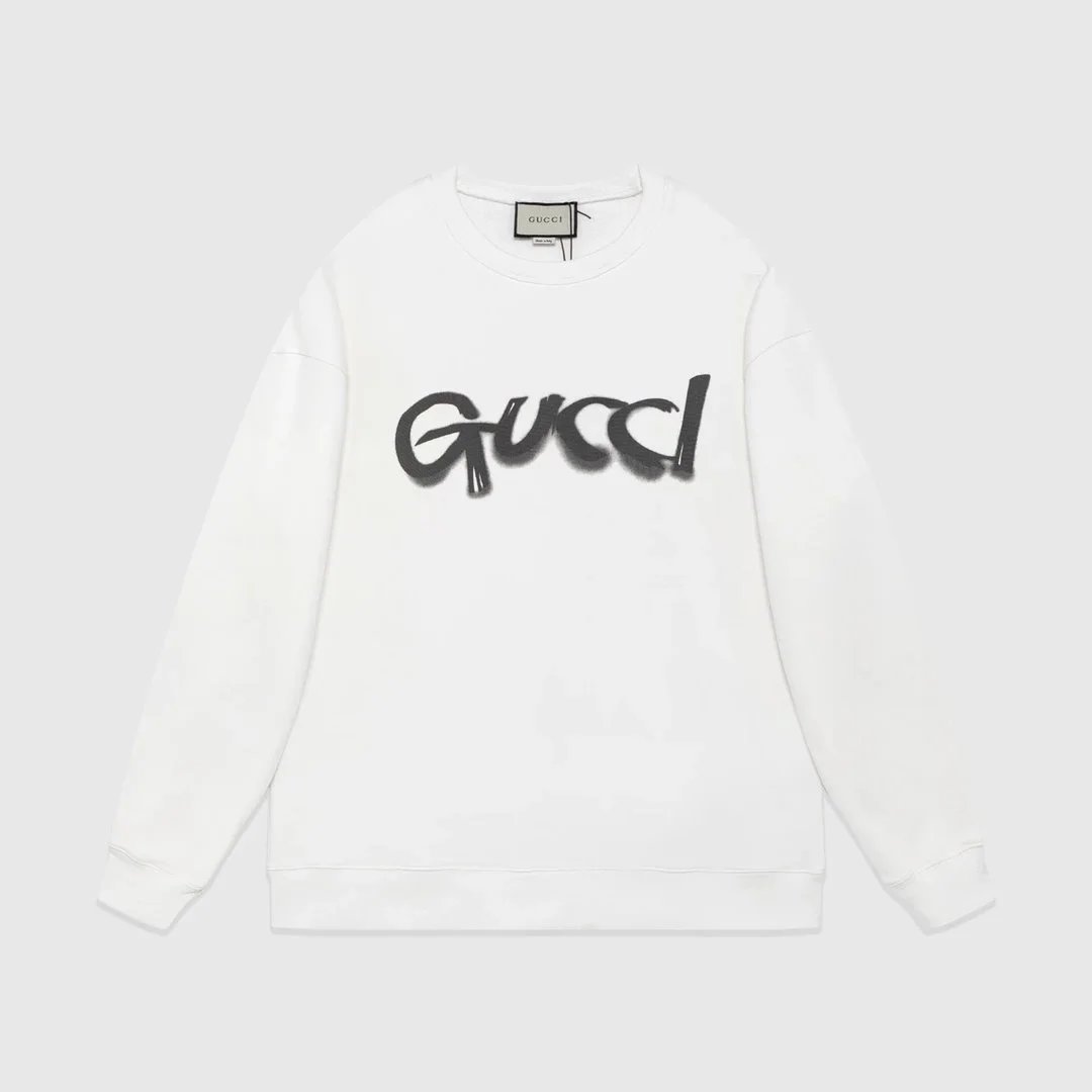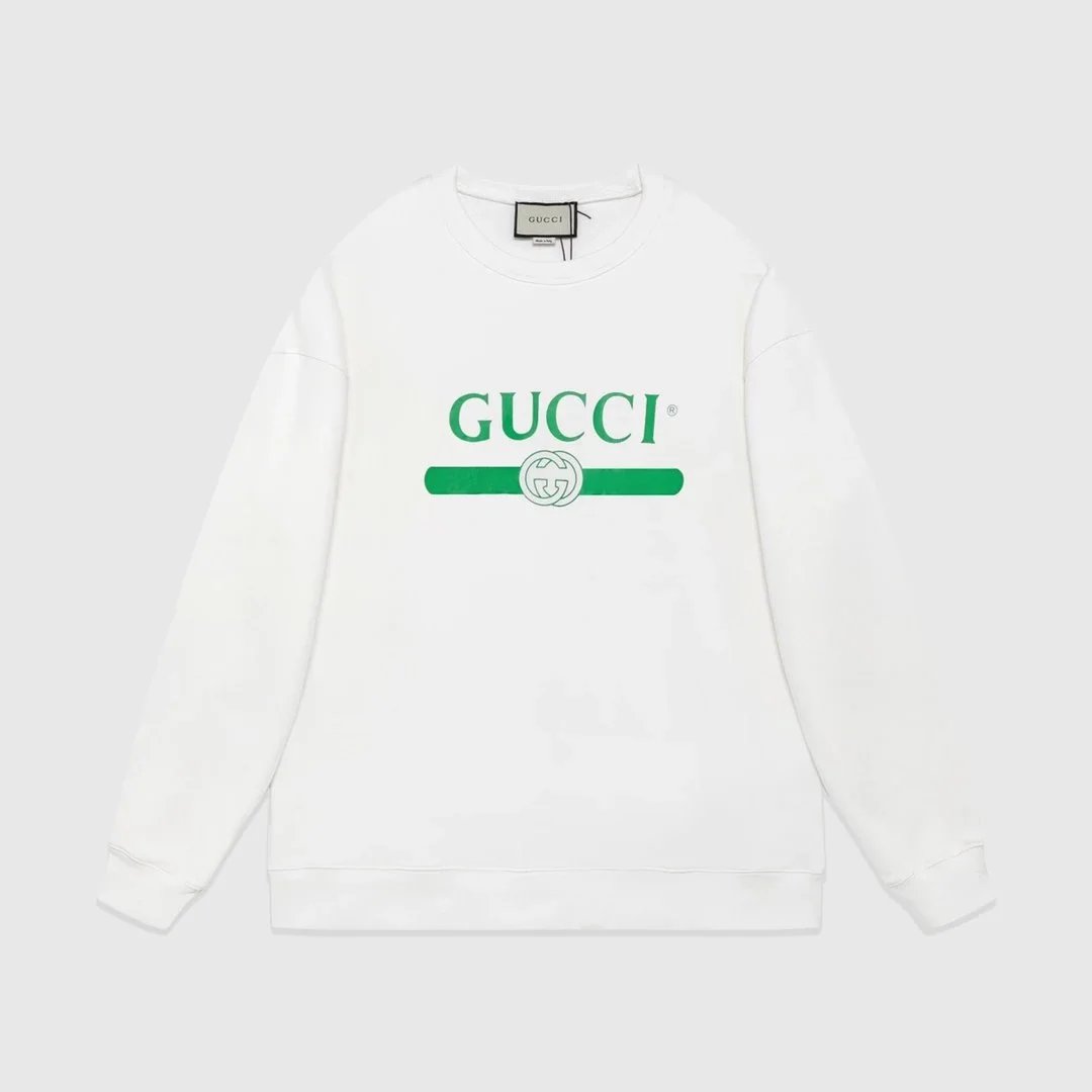 Luxury white Gucci sweatshirt featuring a bold green logo and iconic GG monogram teddy bear patch for standout style.