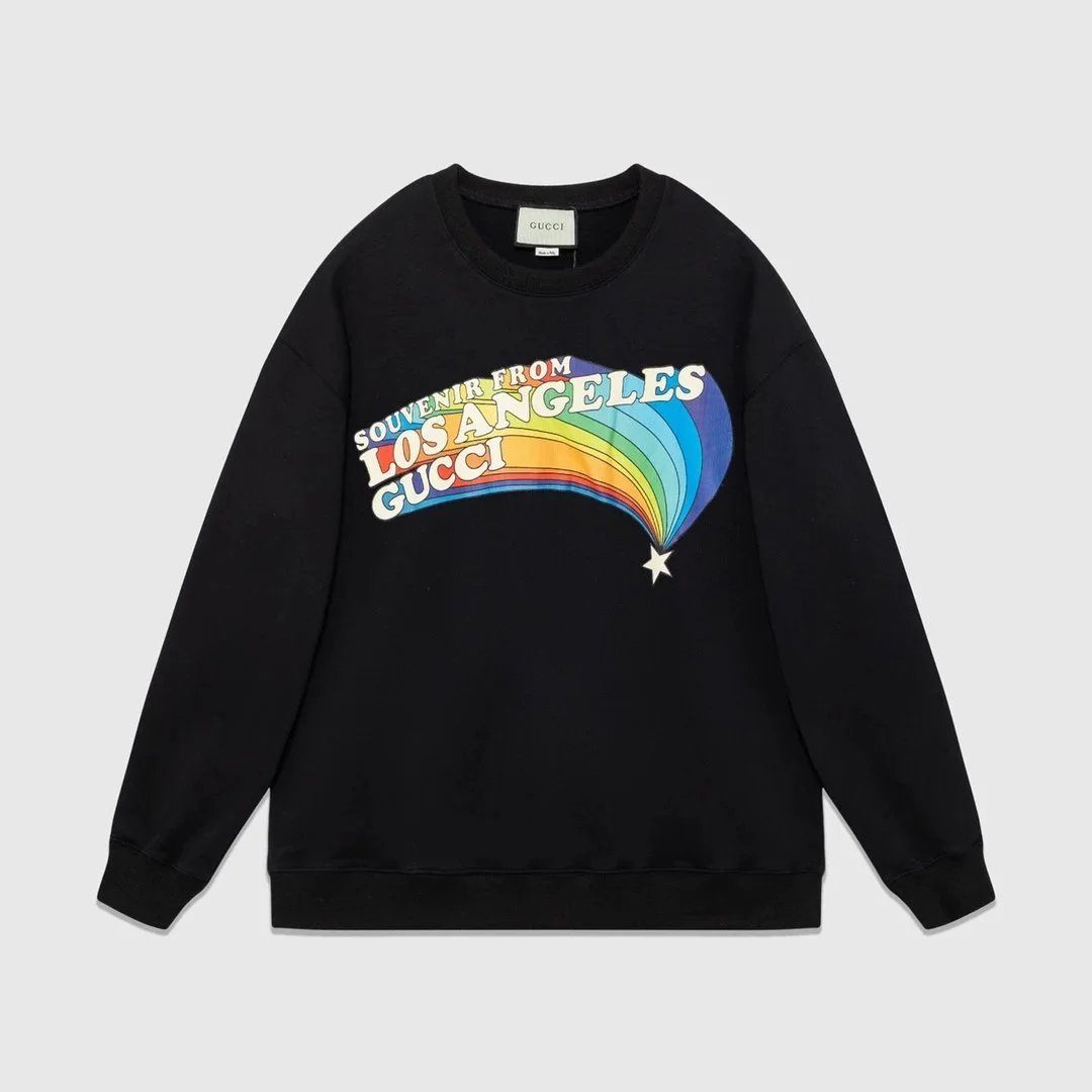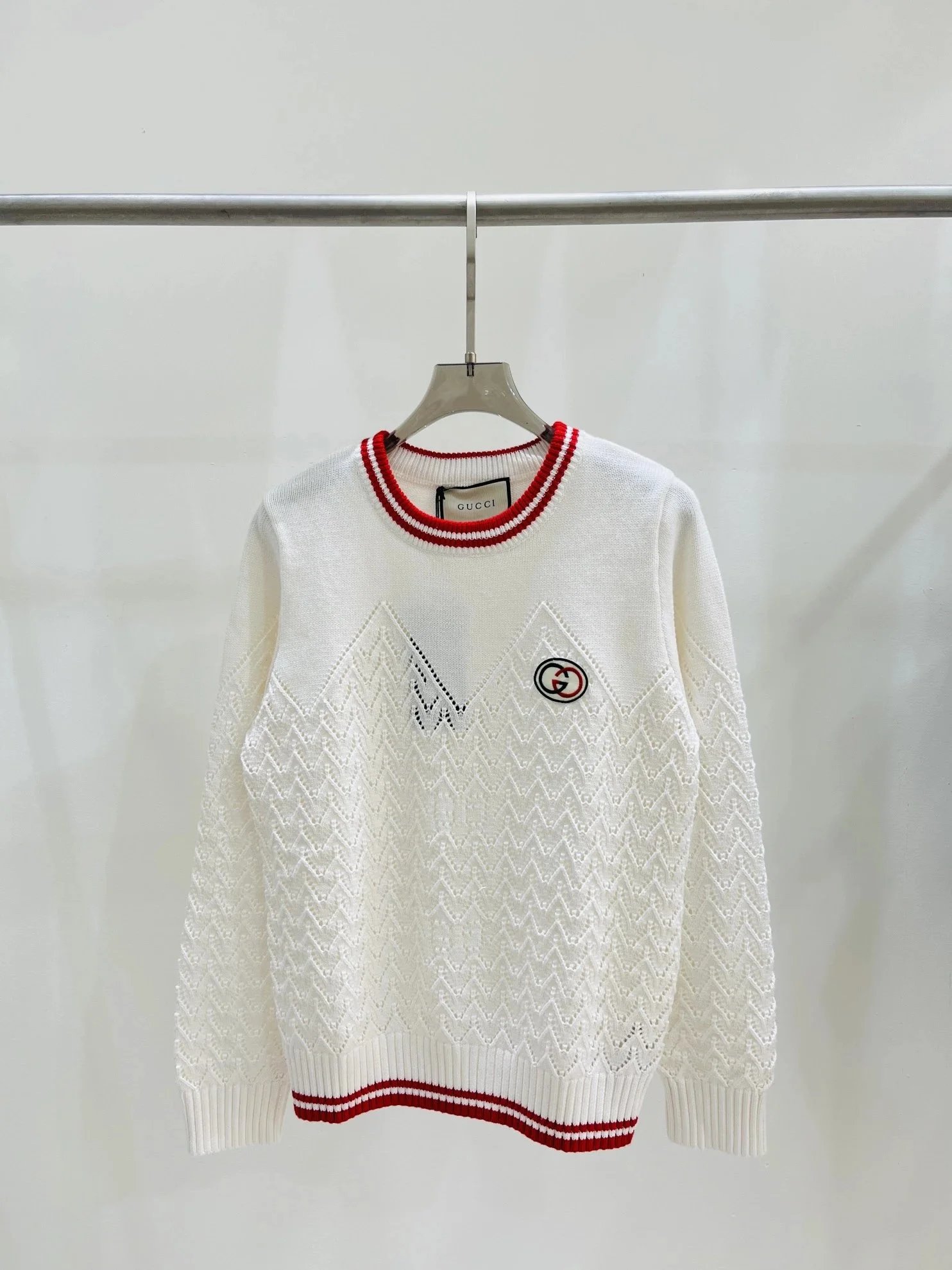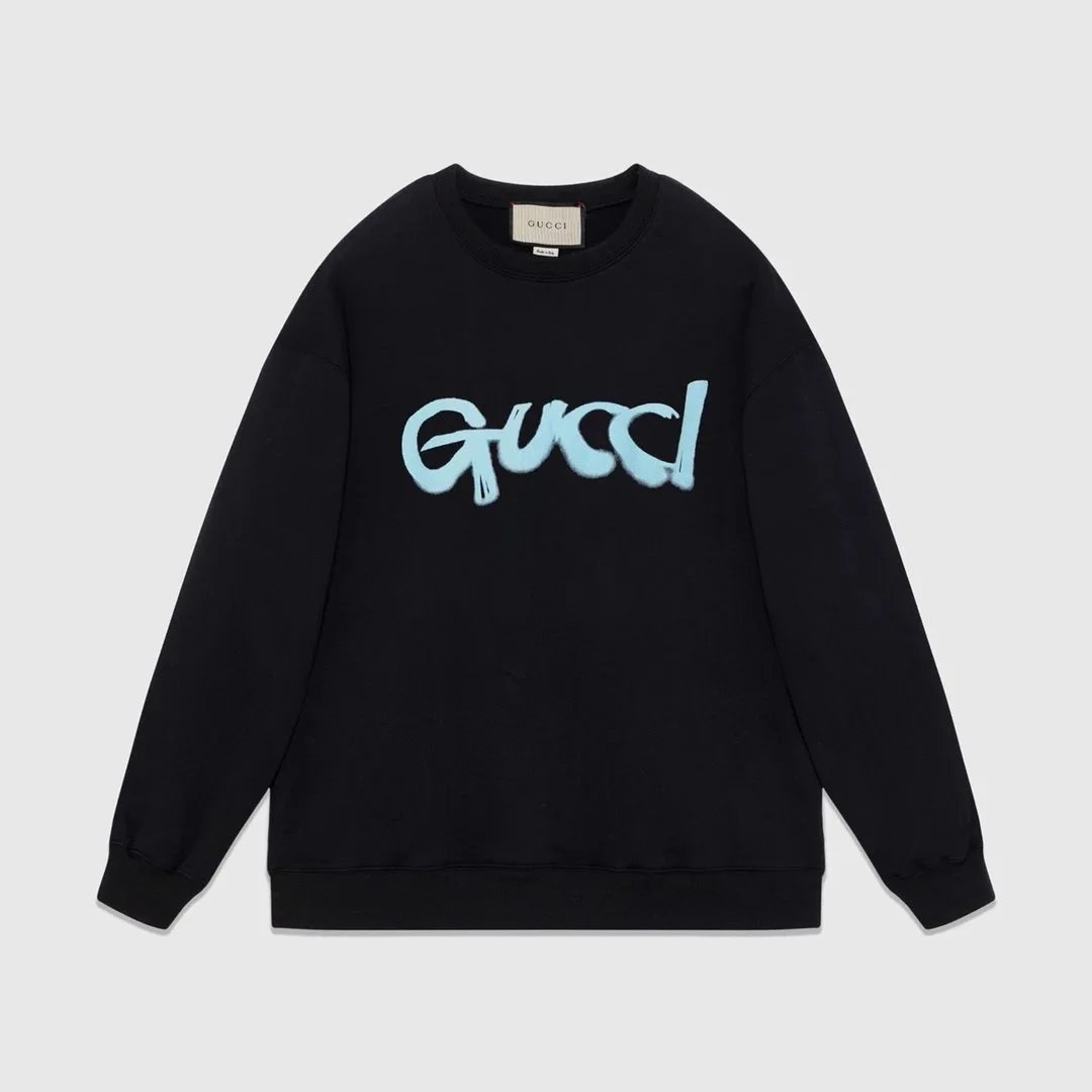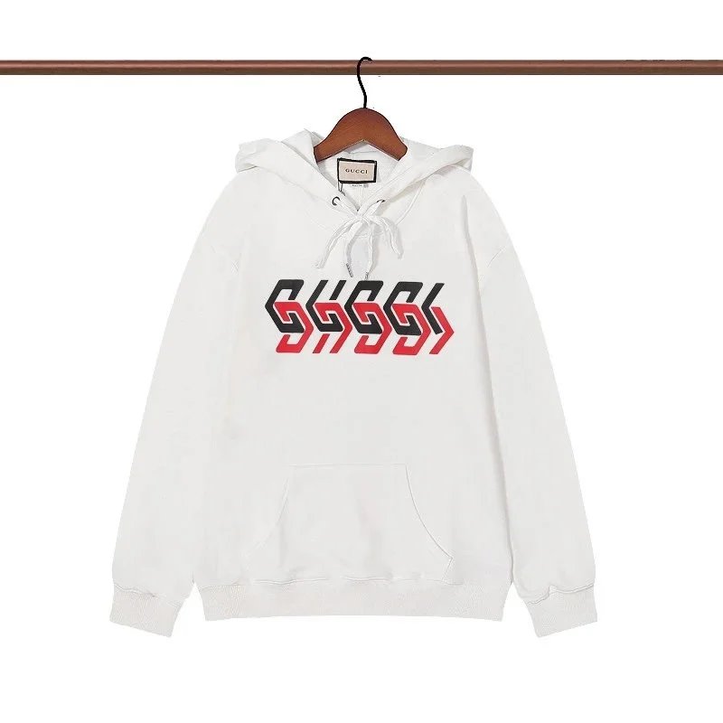 Luxury white Gucci sweatshirt featuring a bold green logo and iconic GG monogram teddy bear patch for standout style.